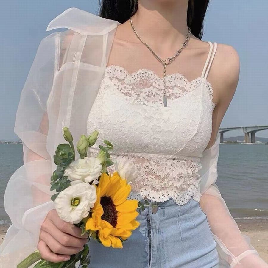 レース生地と丈が短めのスタイルで一枚でもおしゃれに着こなせます♪