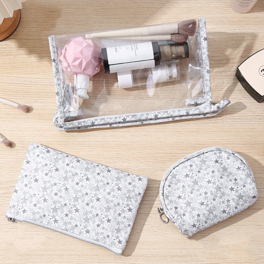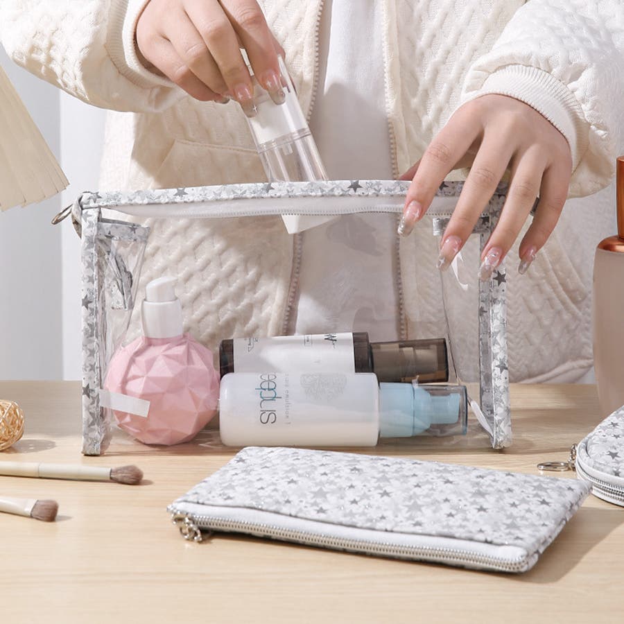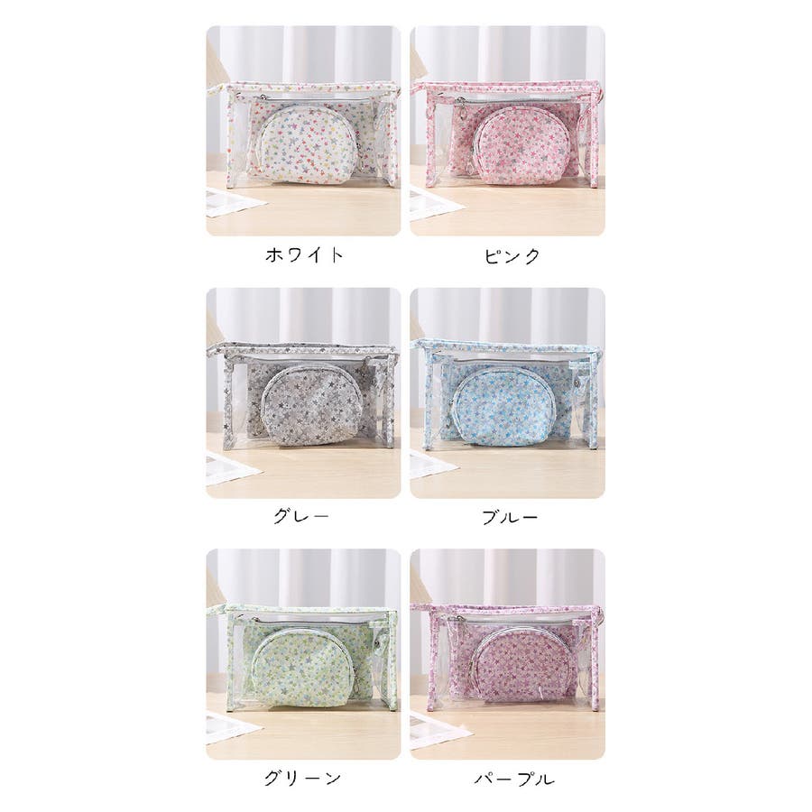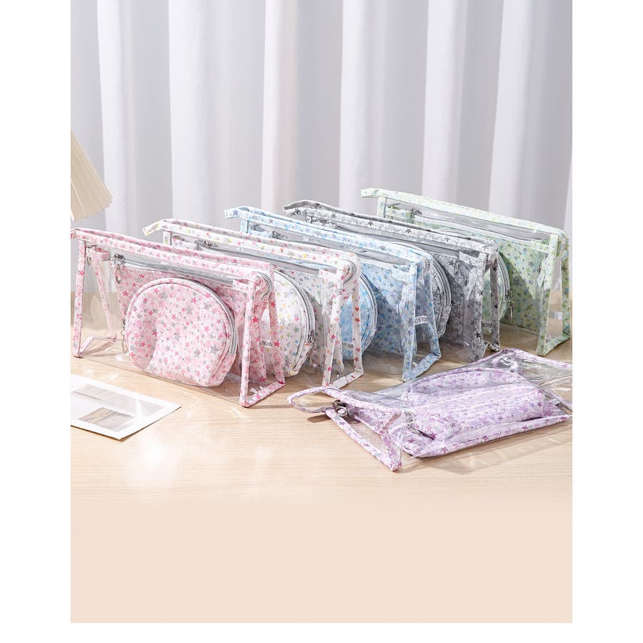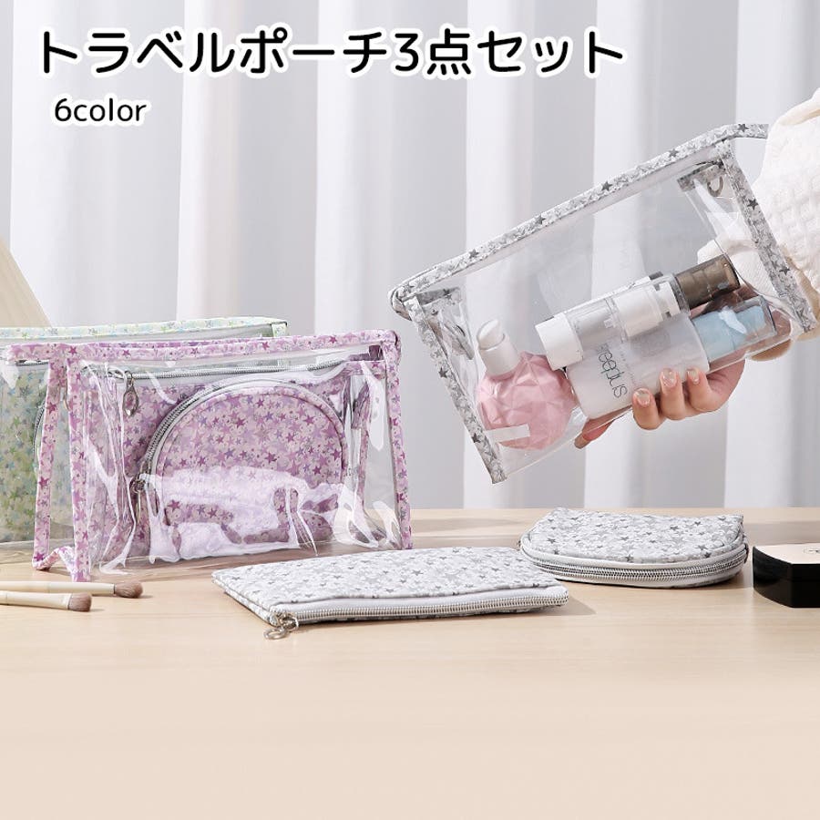 クリアバッグと2種類のポーチによって、洗面用品やメイク道具などを分けて旅行に持っていくことができます。