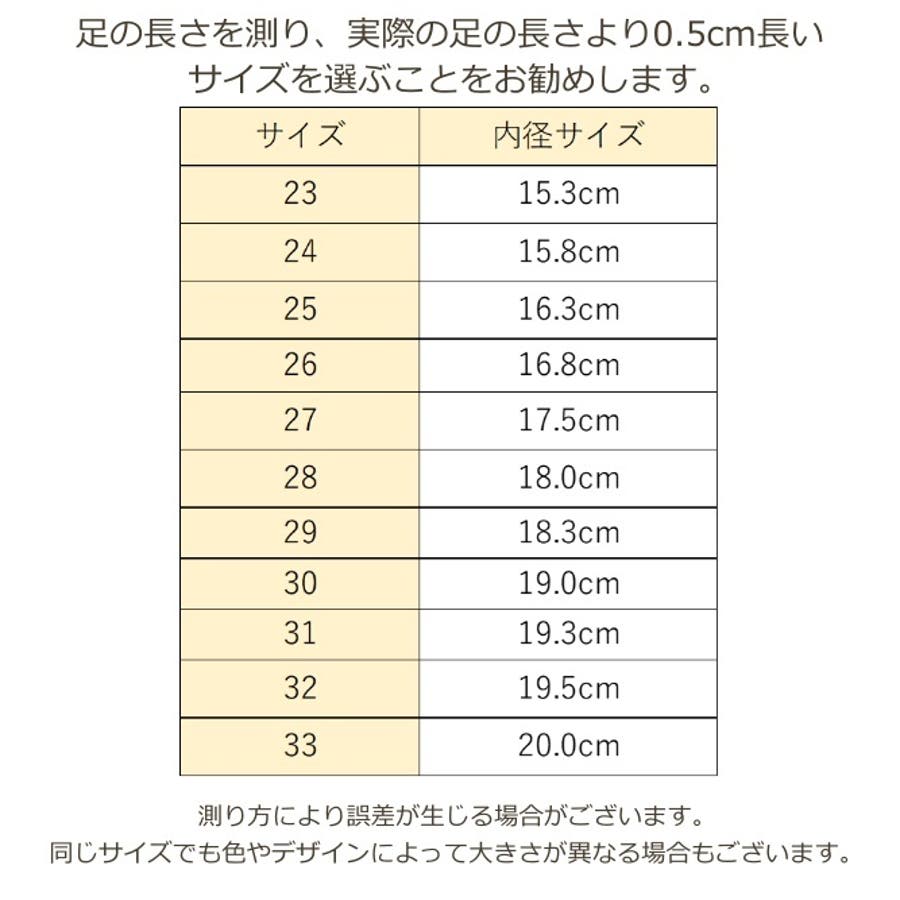 ※足の長さを測り、実際の足の長さより0.5cm長いサイズを選ぶことをお勧めします。