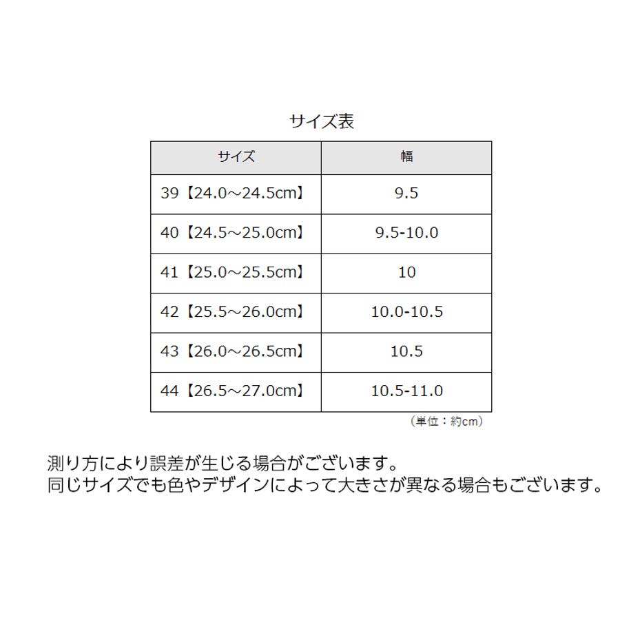 | サイズ | 39【24.0~24.5cm】 / 40【24.5~25.0cm】 / 41【25.0~25.5cm】 / 42【25.5~26.0cm】 / 43【26.0~26.5cm】 / 44【26.5~27.0cm】 |