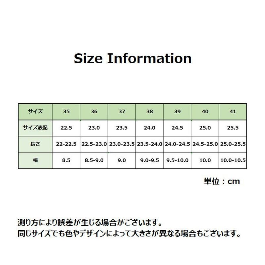 | サイズ | 35【22.0~22.5cm】 / 36【22.5~23.0cm】 / 37【23.0~23.5cm】 / 38【23.5~24.0cm】 / 39【24.0~24.5cm】 / 40【24.5~25.0cm】 / 41【25.0~25.5cm】 |