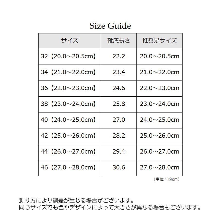 | サイズ | 32【20.0~20.5cm】 / 34【21.0~22.0cm】 / 36【22.0~23.0cm】 / 38【23.0~24.0cm】 / 40【24.0~25.0cm】 / 42【25.0~26.0cm】 / 44【26.0~27.0cm】 / 46【27.0~28.0cm】 |