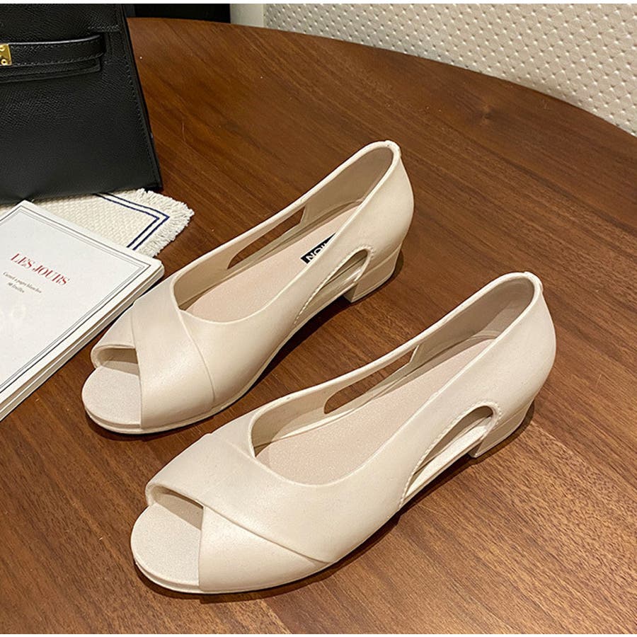 投稿日:2024.10.06画像みたいに足先は、そこまで出ません。素材が素材なので、前に滑っていくことはなく、ヒールも低めなので歩くには歩きやすいです。