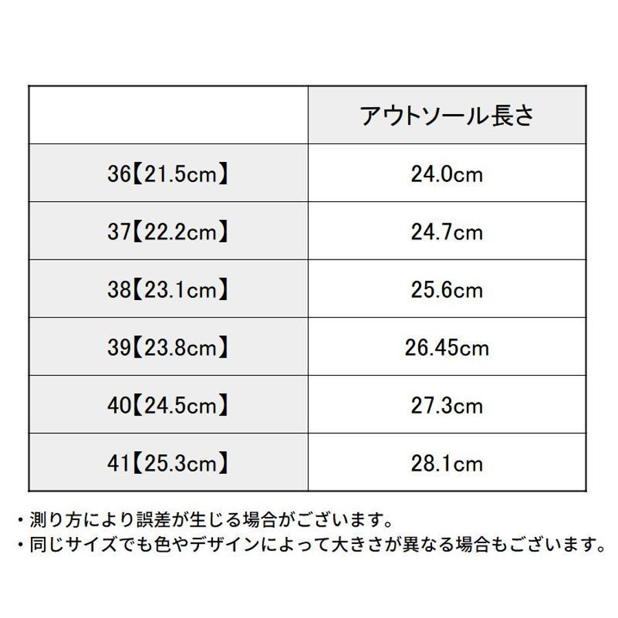 | サイズ | 36【21.5cm】 / 37【22.2cm】 / 38【23.1cm】 / 39【23.8cm】 / 40【24.5cm】 / 41【25.3cm】 |