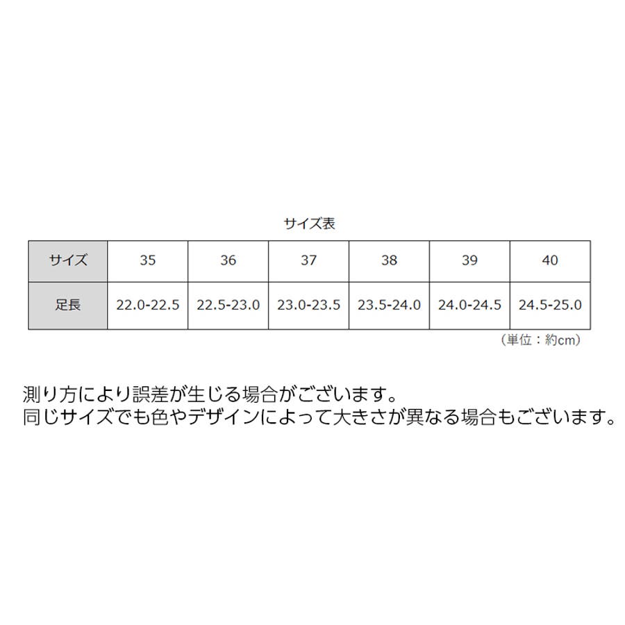 | サイズ | 35【22.0~22.5cm】 / 36【22.5~23.0cm】 / 37【23.0~23.5cm】 / 38【23.5~24.0cm】 / 39【24.0~24.5cm】 / 40【24.5~25.0cm】 |