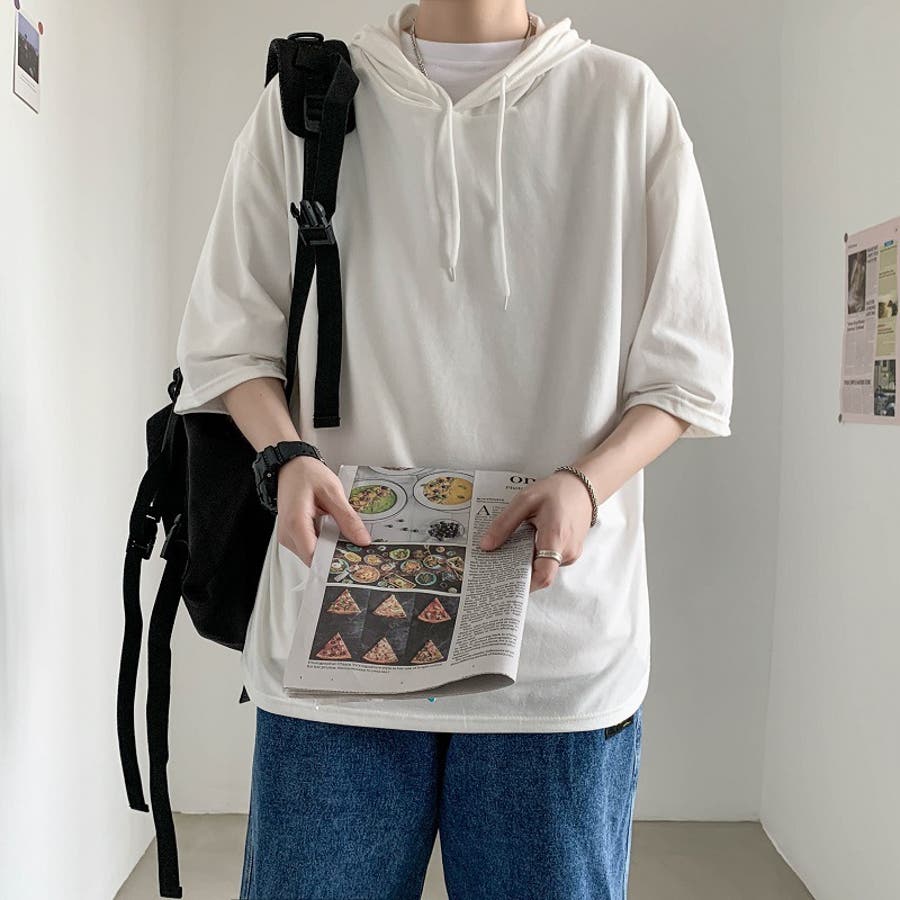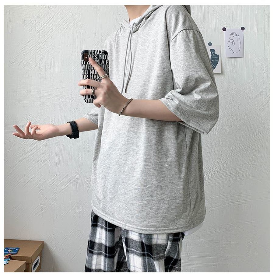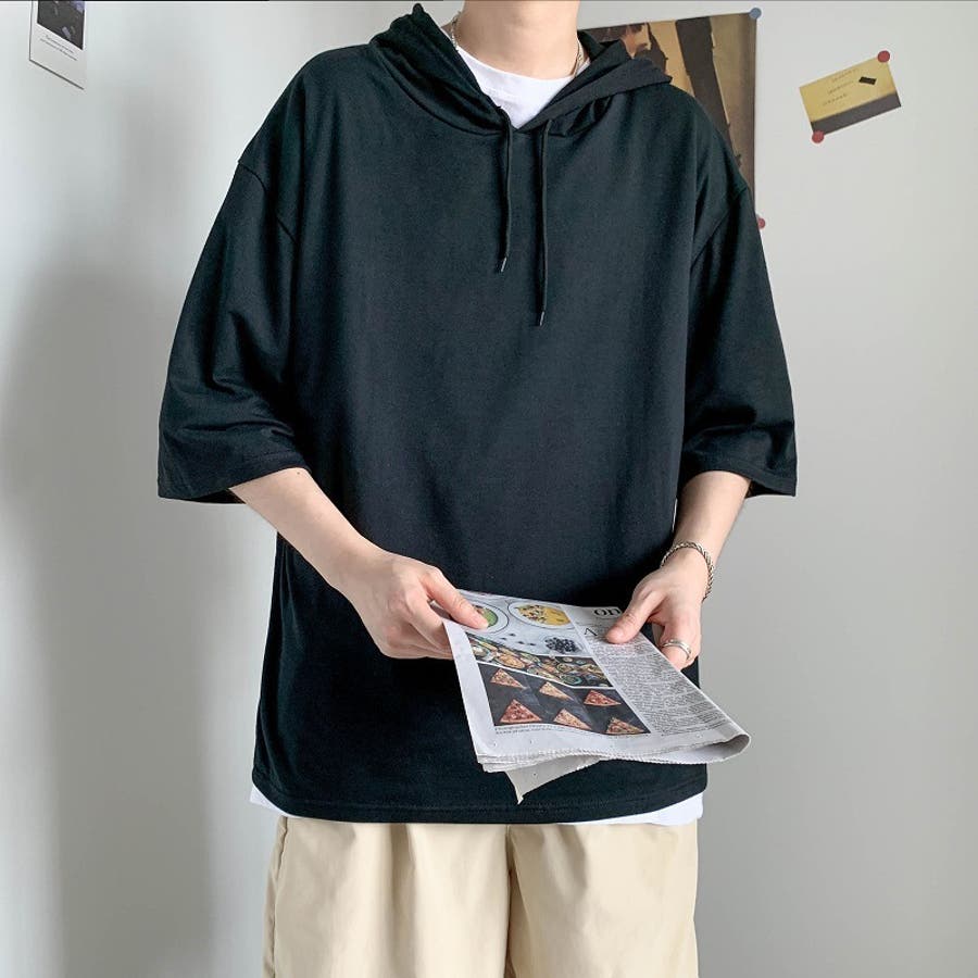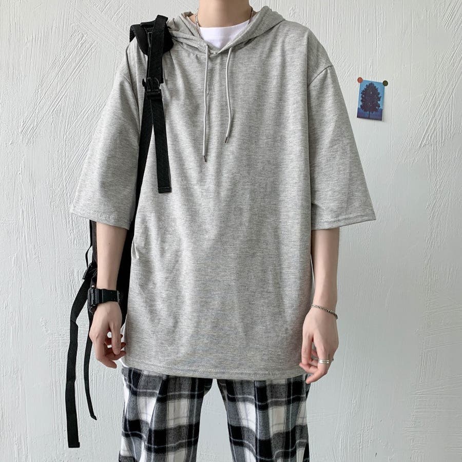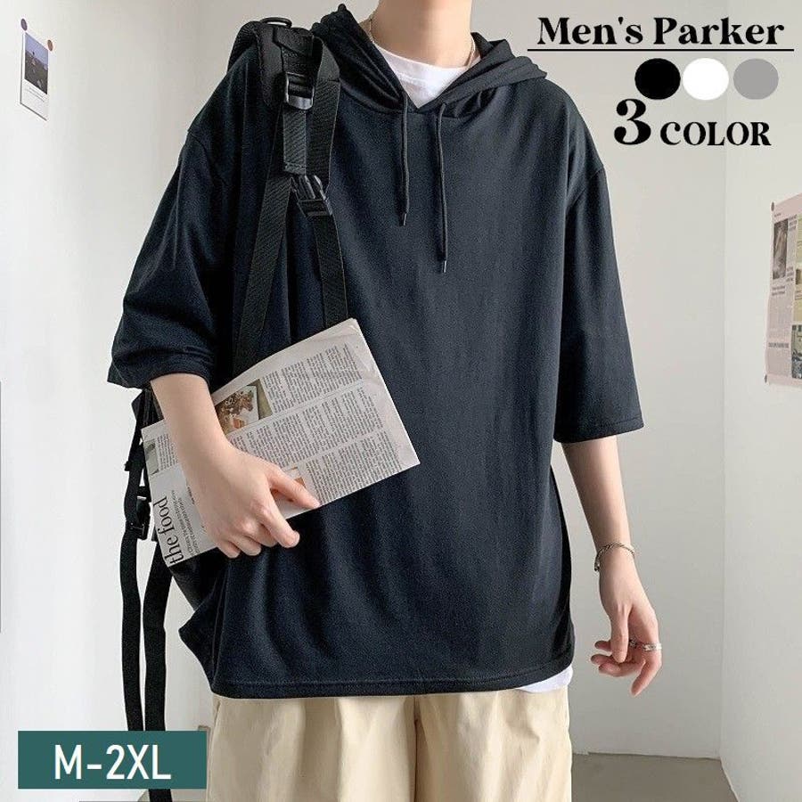 ゆったりとした5分袖でラフな着こなしを楽しめるメンズ用パーカーです。