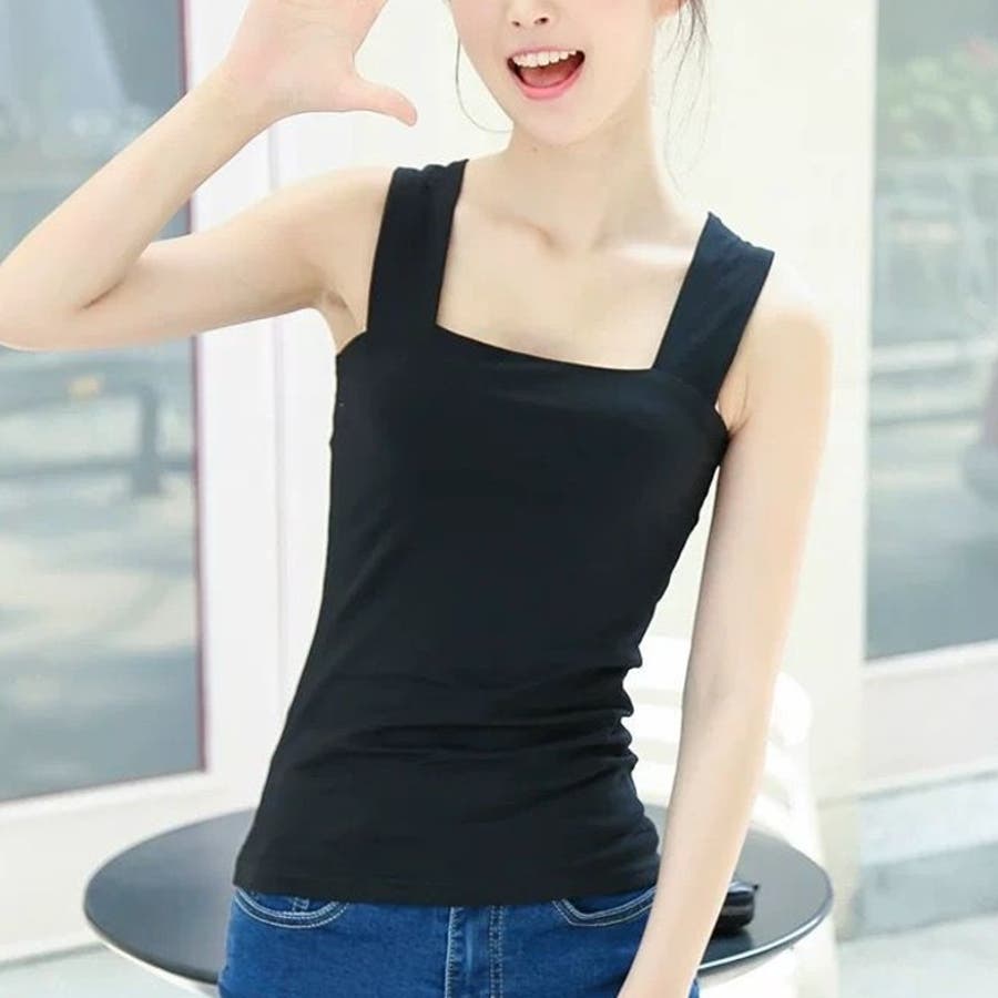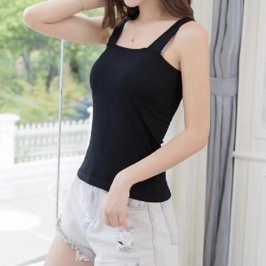 幅広の肩紐でブラ紐を隠せるタンクトップです。