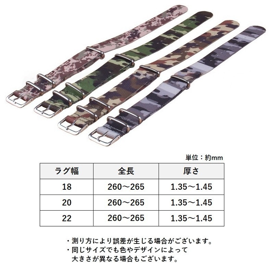 | サイズ×カラー | 18mm1【砂漠】 / 18mm2【雪原】 / 18mm3【密林】 / 18mm4【緑地】 / 20mm1【砂漠】 / 20mm2【雪原】 / 20mm3【密林】 / 20mm4【緑地】 / 22mm1【砂漠】 / 22mm2【雪原】 / 22mm3【密林】 / 22mm4【緑地】 |