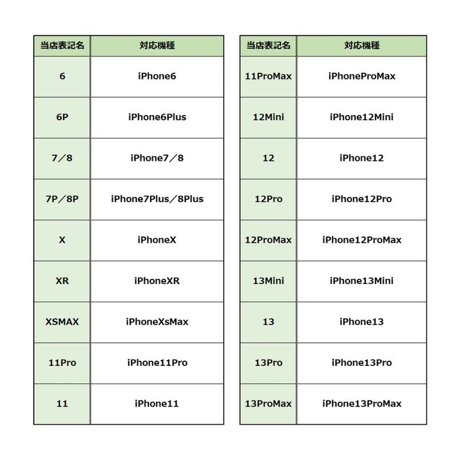 | 機種 | 11 / 11Pro / 11ProMax / 12 / 12Mini / 12Pro / 12ProMax / 13 / 13Mini / 13Pro / 13ProMax / 6 / 6P / 7/8 / 7P/8P / X / XR / XSMAX |