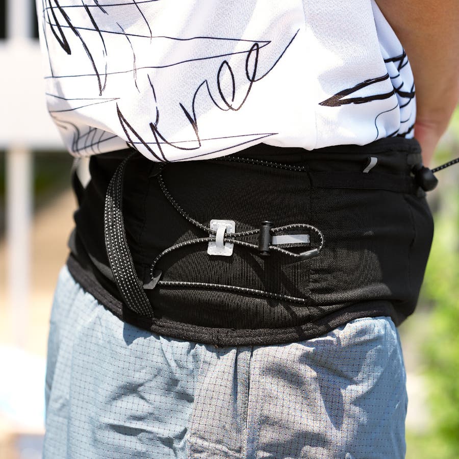 500 ミリリットルのフラスク、エネルギージェル、スマートフォン、ウィンドシェル、ゼッケン、そしてトレイルランニングポールも収納できるレディースとメンズ兼用ランニングバッグです。