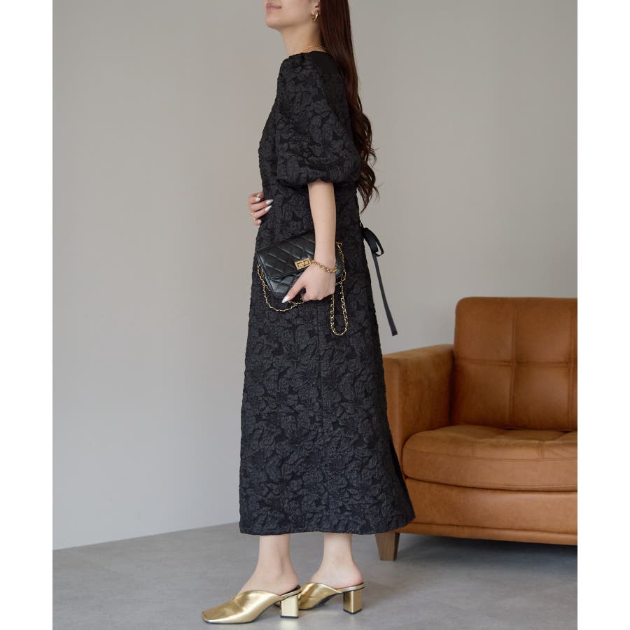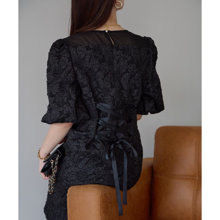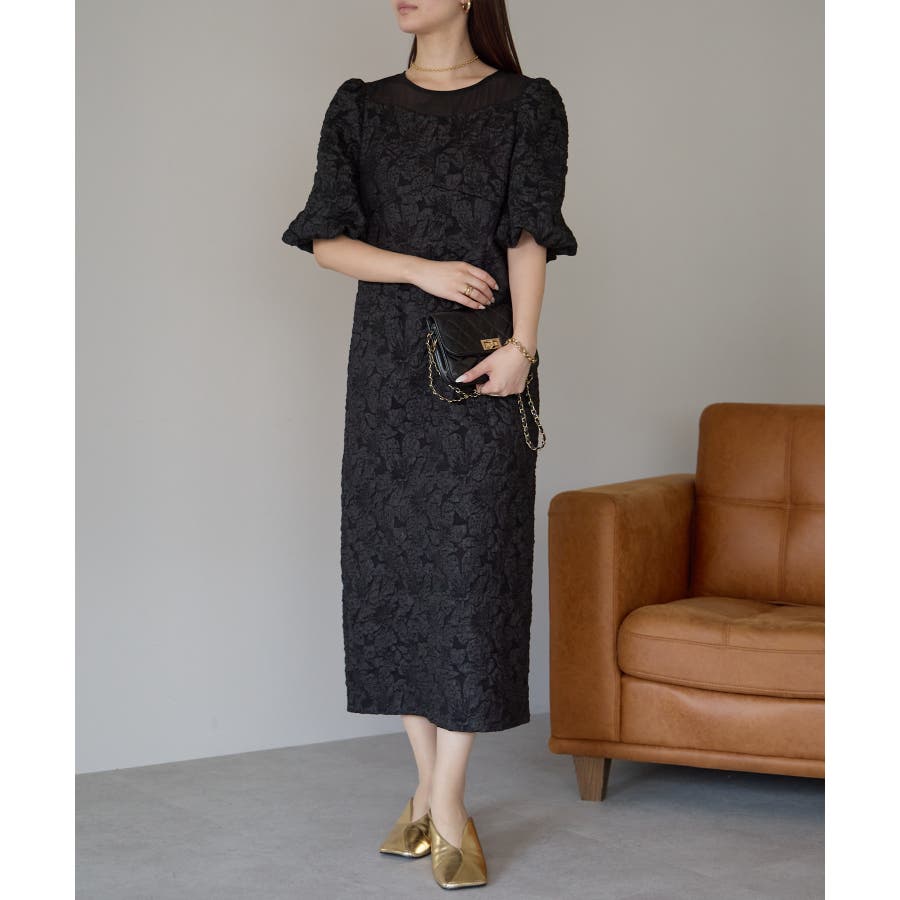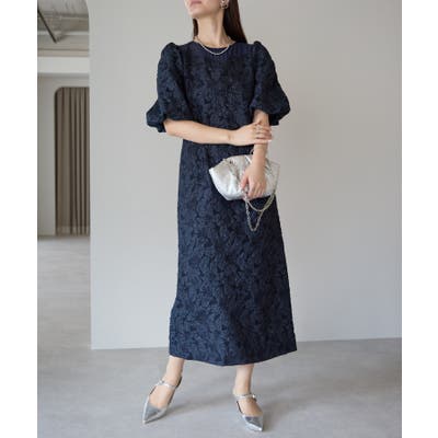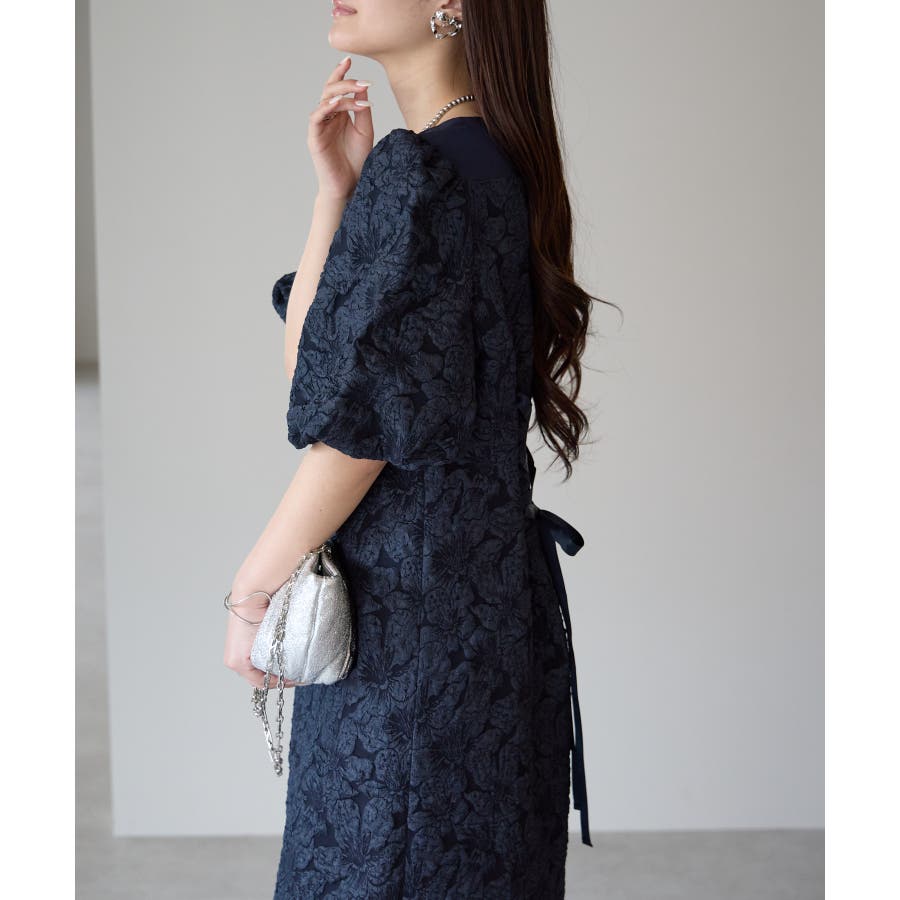 大胆で印象的なデザインが特徴で、ふんわりとしたバルーンスリーブリーブが優美な雰囲気を演出。