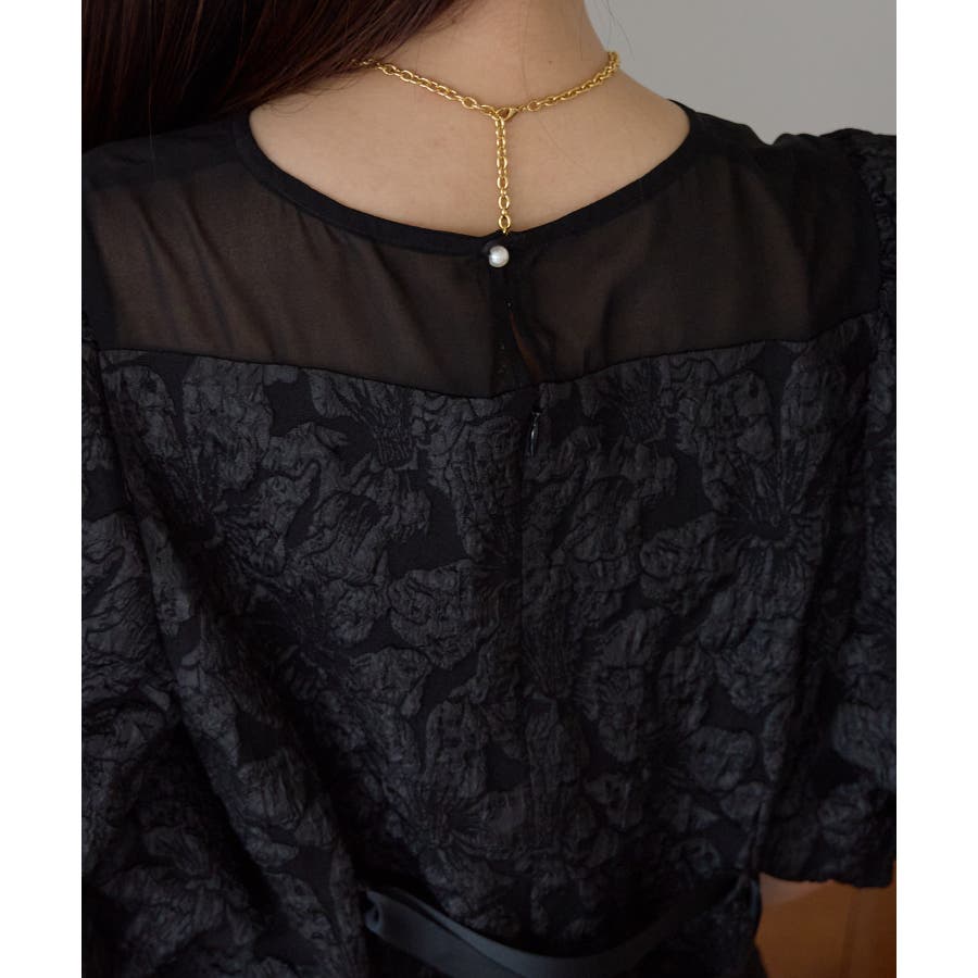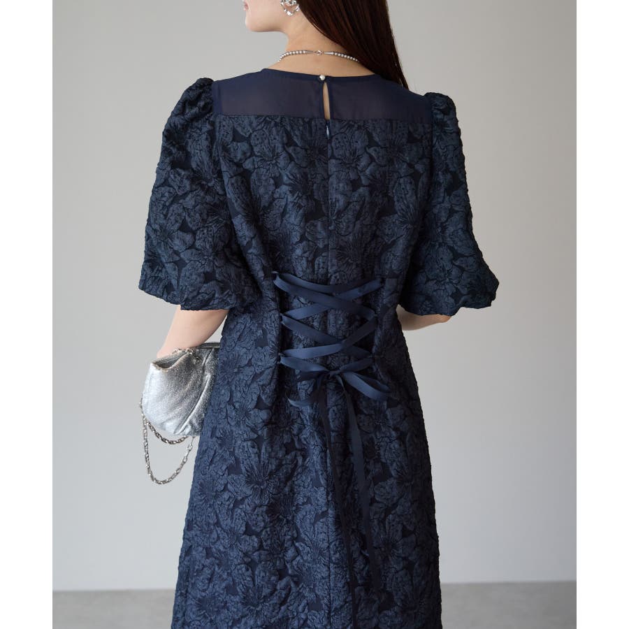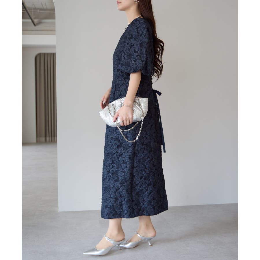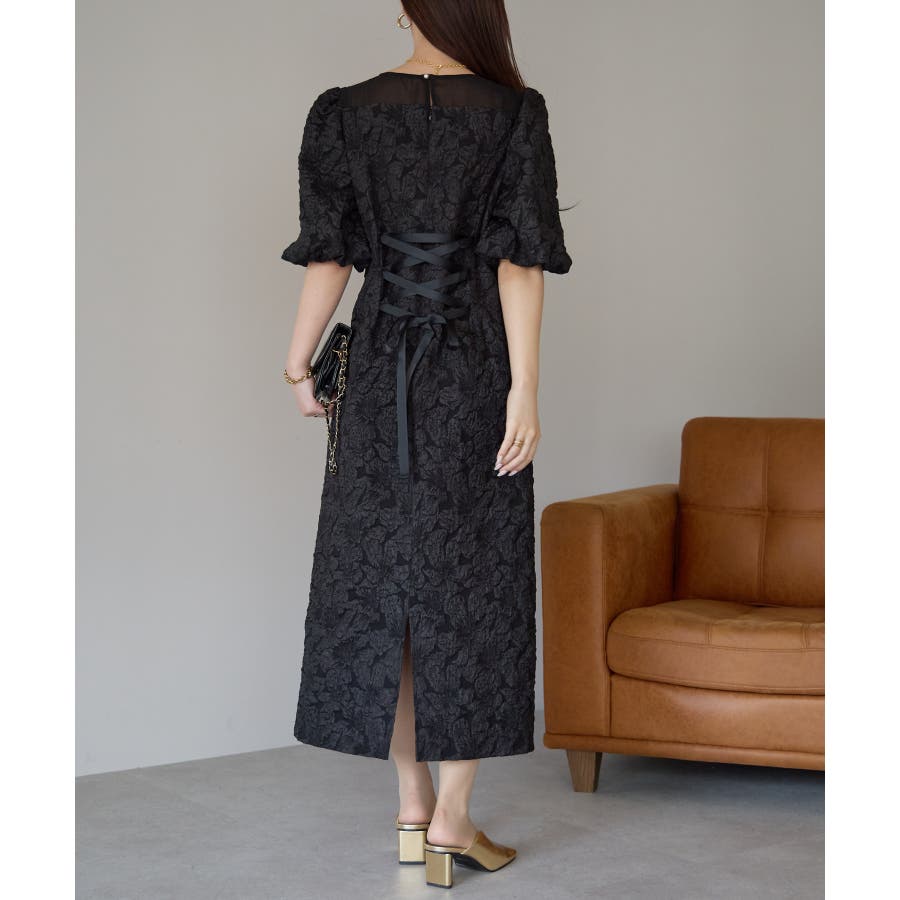 大胆で印象的なデザインが特徴で、ふんわりとしたバルーンスリーブリーブが優美な雰囲気を演出。