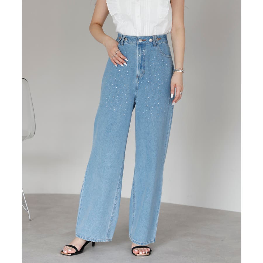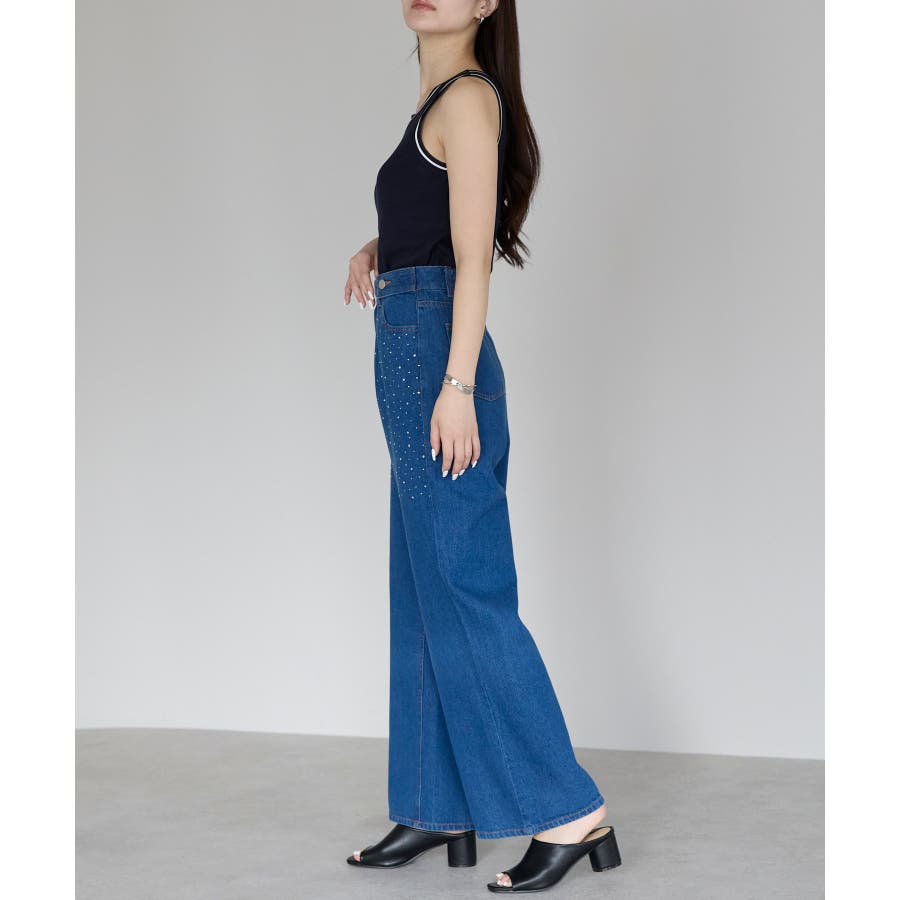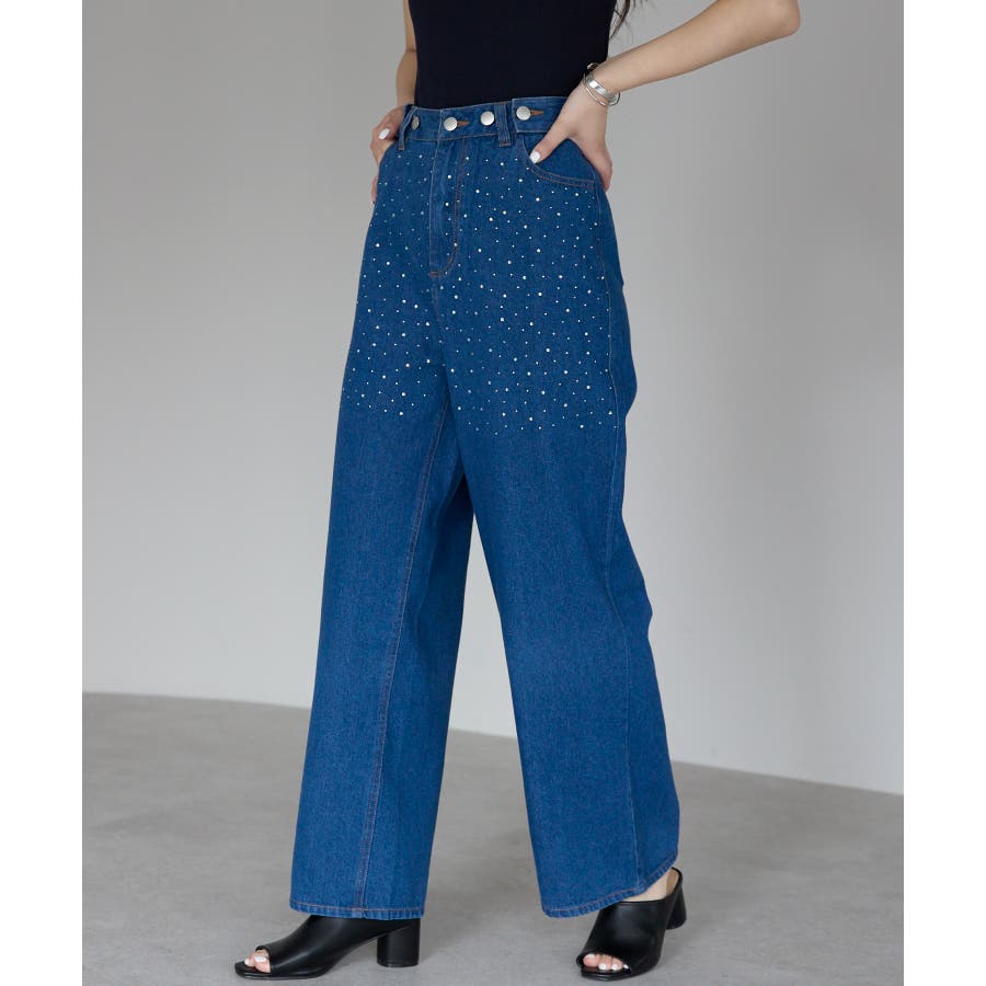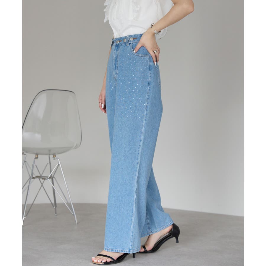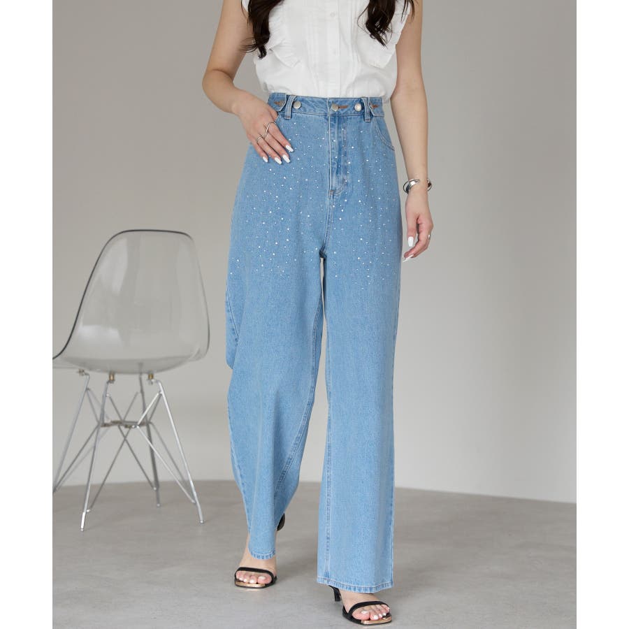 きれいめなデニム生地にラインストーンを散りばめたハイウエストのワイドデニムです。