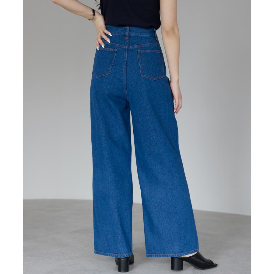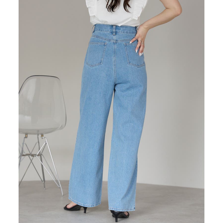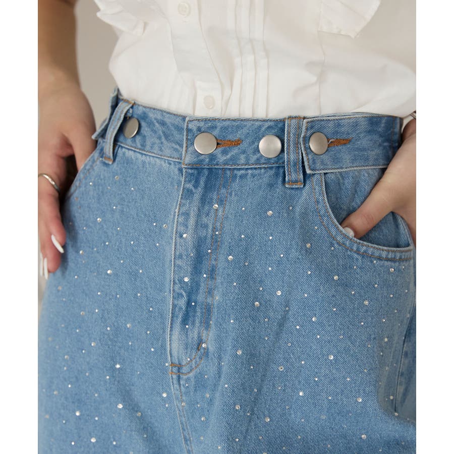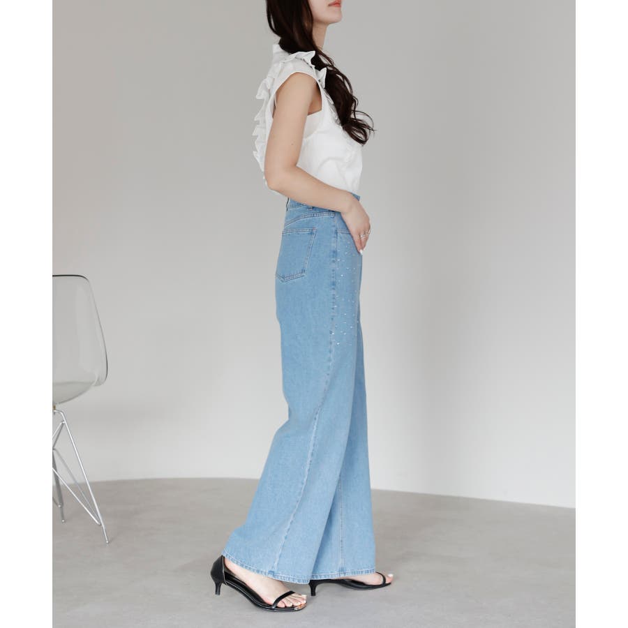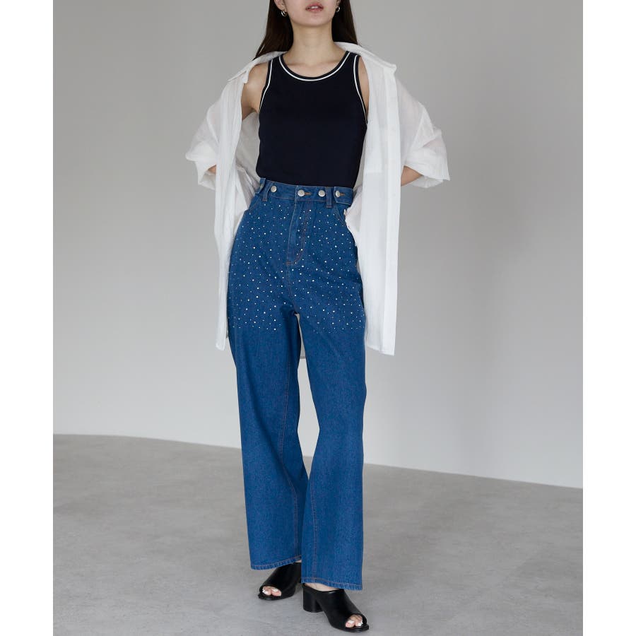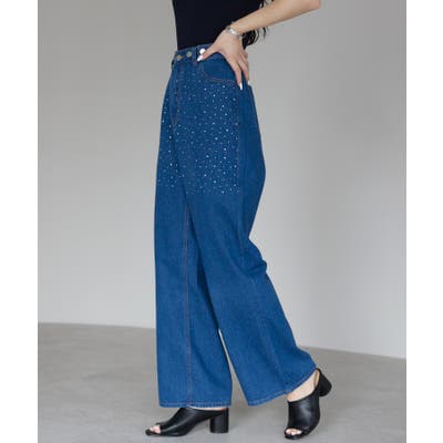 きれいめなデニム生地にラインストーンを散りばめたハイウエストのワイドデニムです。