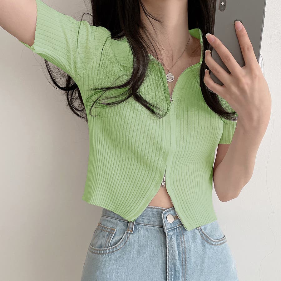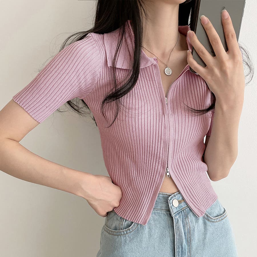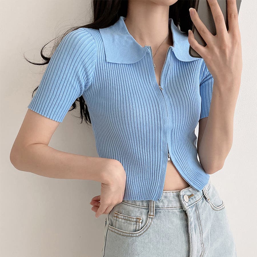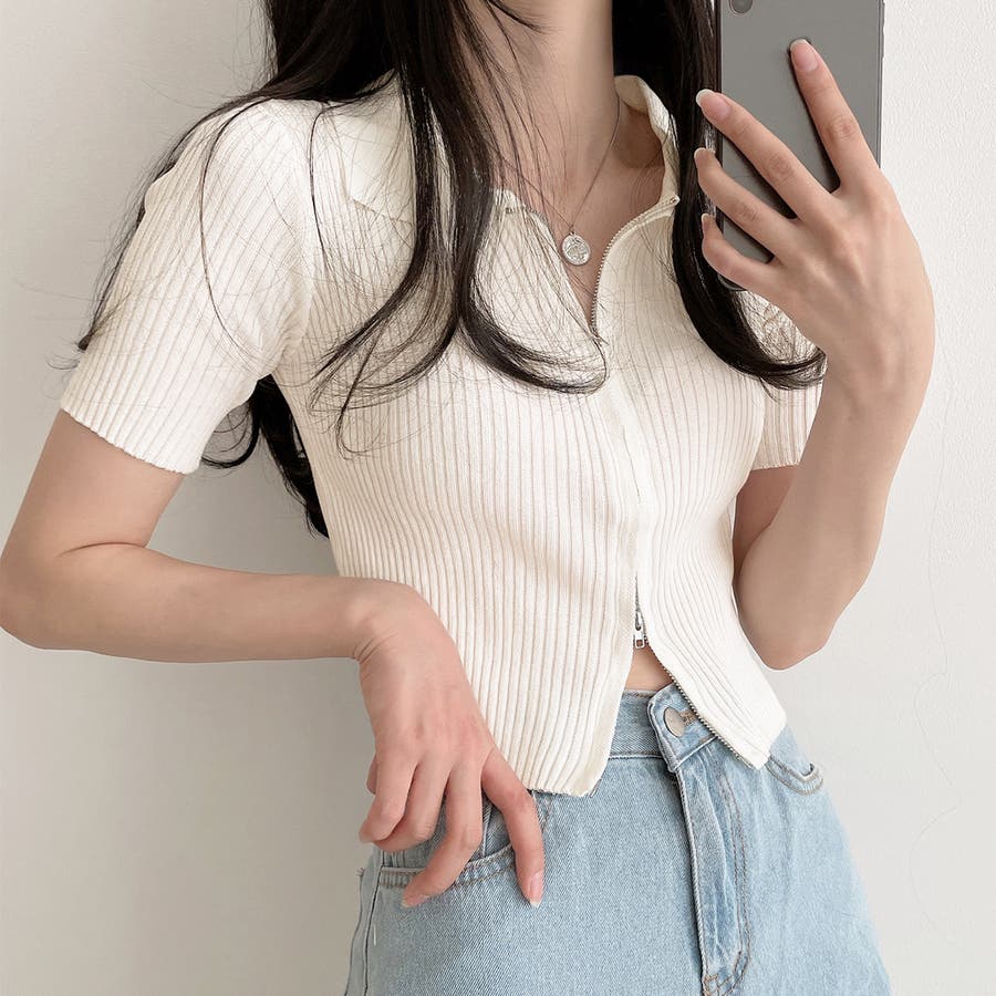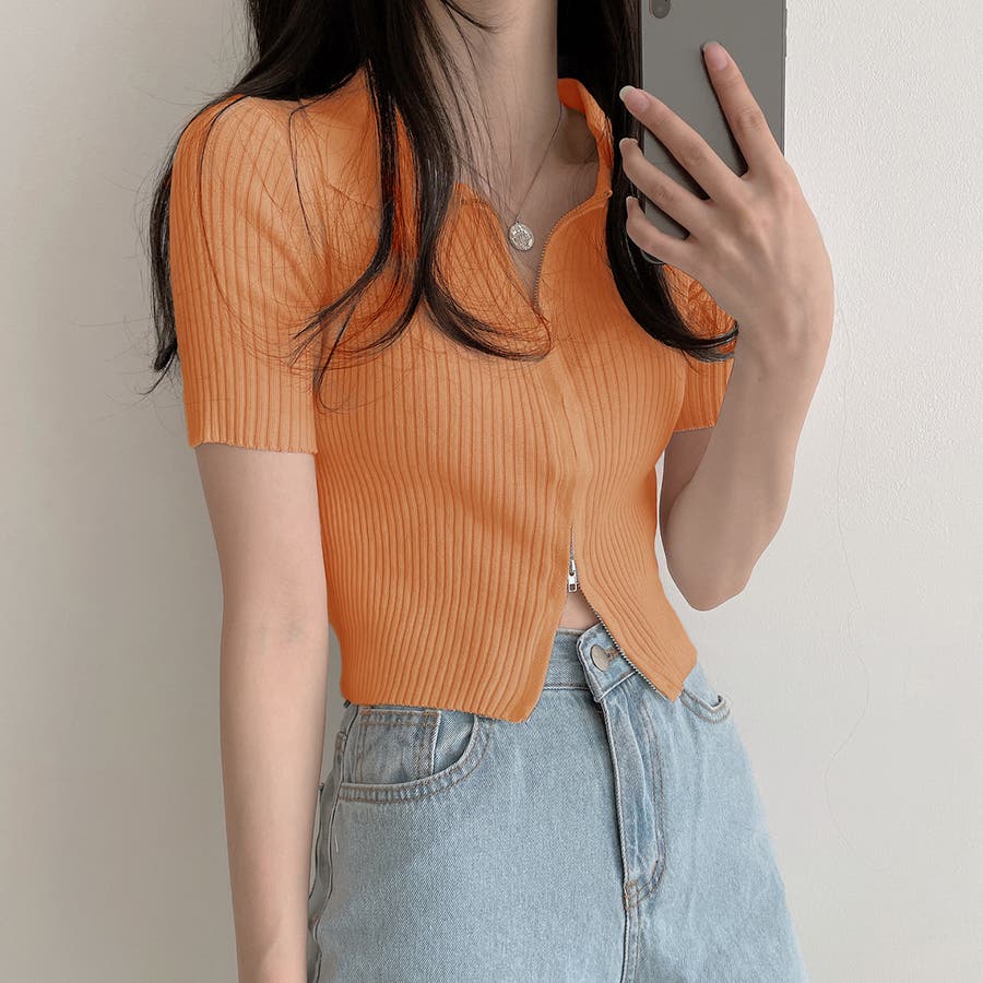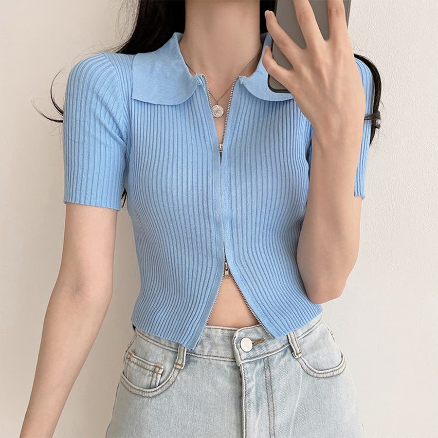 春/夏/春夏/春服/夏服/韓国/韓国ファッション/オルチャン/レディース/人気/カジュアル/プチプラ/トップス/ダブルジップ/逆開/ファスナー/スライダー/ショート丈トップス/ショート丈/短丈/クロップド丈/へそ出し/ハイウエスト/スキッパー/ハーフジップ/ポロ衿/衿付き/シャツ衿/デコルテ/鎖骨/セクシー/ヘルシー/セクシー胸元/谷間見せ/半袖/タイト/リブ/リブニット/サマーニット/夏トップス/ビタミンカラー/ストリート/200282