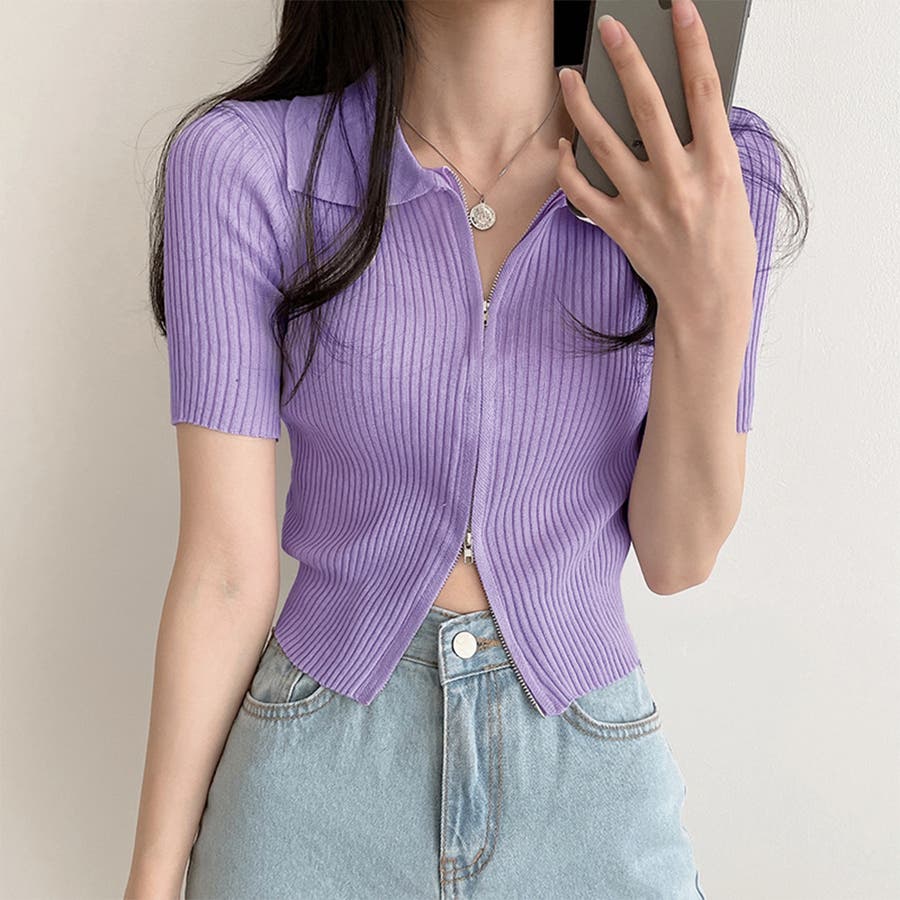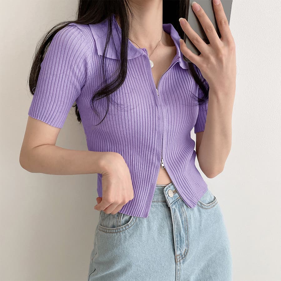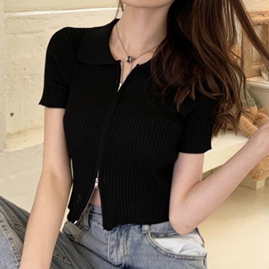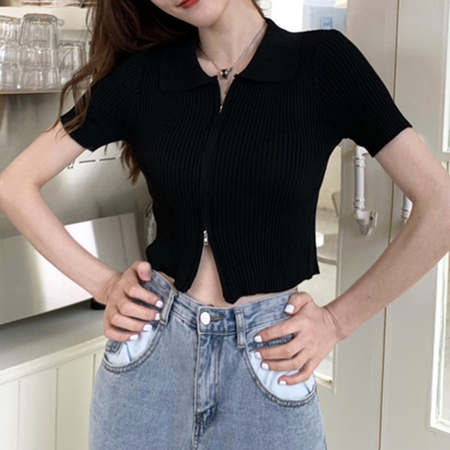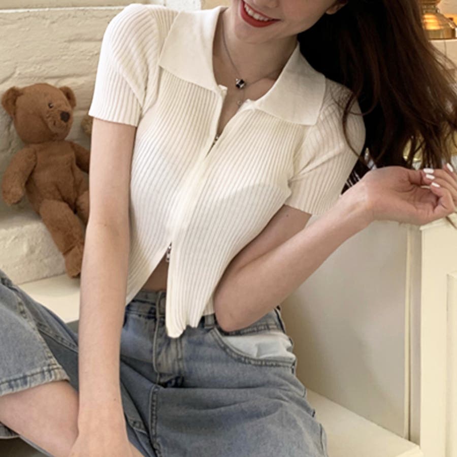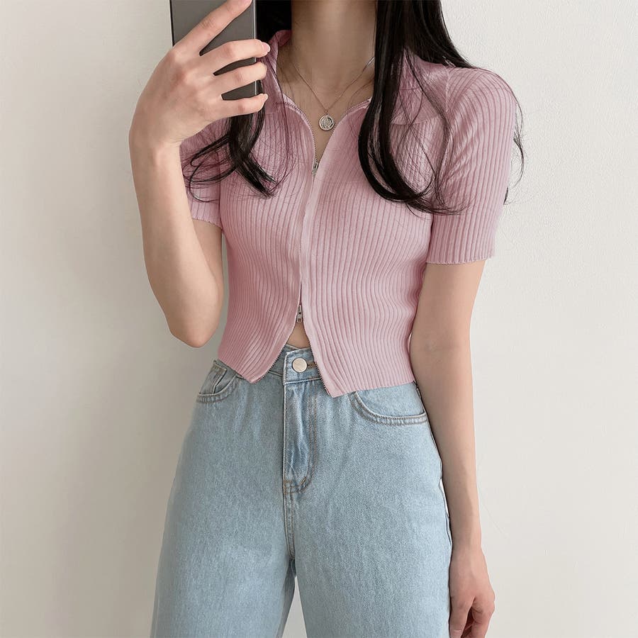 春/夏/春夏/春服/夏服/韓国/韓国ファッション/オルチャン/レディース/人気/カジュアル/プチプラ/トップス/ダブルジップ/逆開/ファスナー/スライダー/ショート丈トップス/ショート丈/短丈/クロップド丈/へそ出し/ハイウエスト/スキッパー/ハーフジップ/ポロ衿/衿付き/シャツ衿/デコルテ/鎖骨/セクシー/ヘルシー/セクシー胸元/谷間見せ/半袖/タイト/リブ/リブニット/サマーニット/夏トップス/ビタミンカラー/ストリート/200282