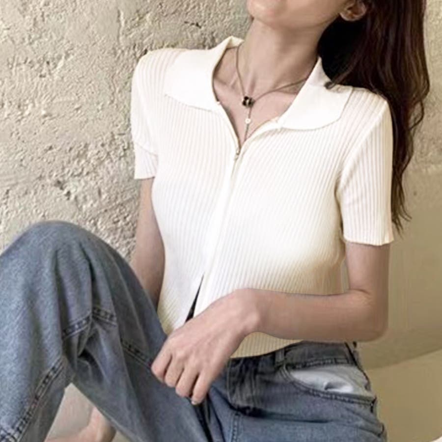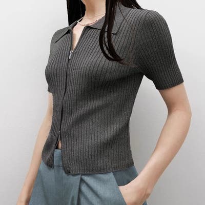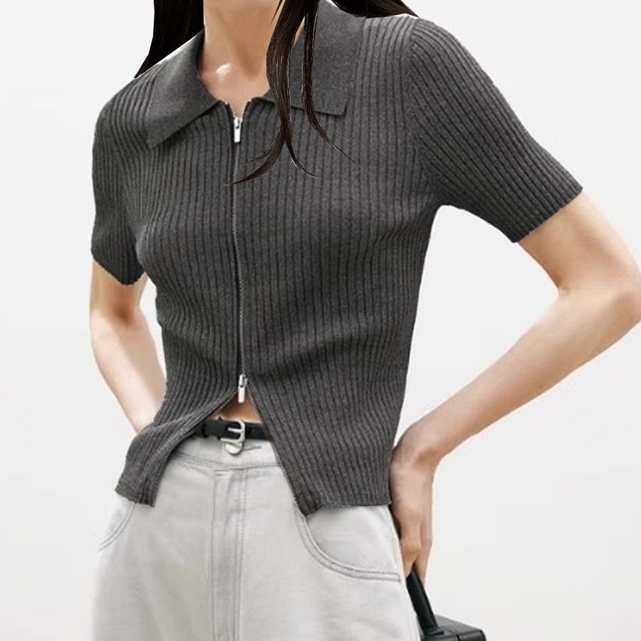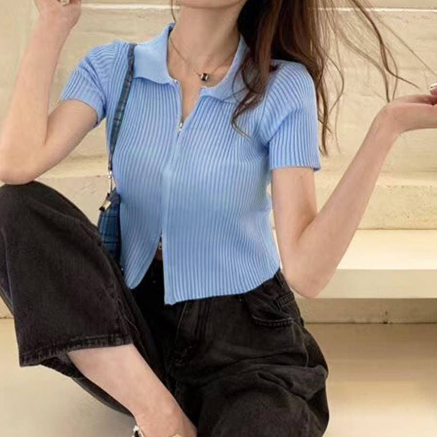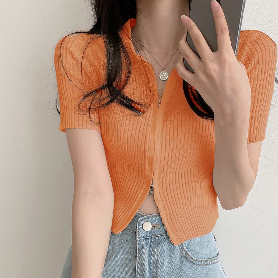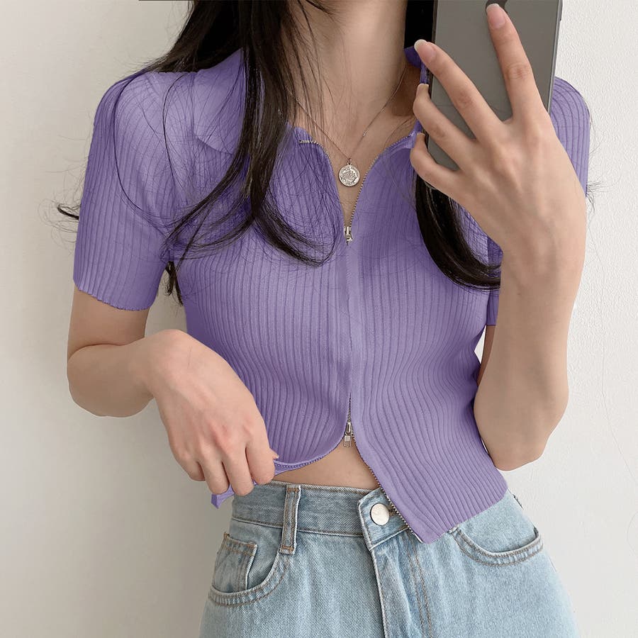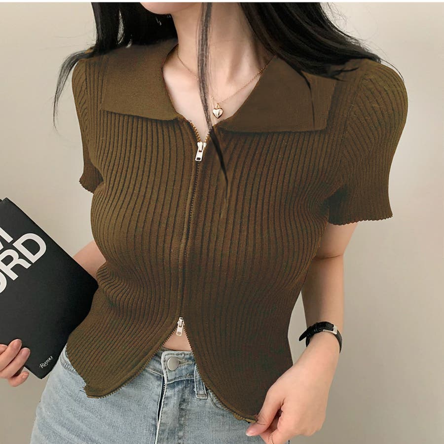 春/夏/春夏/春服/夏服/韓国/韓国ファッション/オルチャン/レディース/人気/カジュアル/プチプラ/トップス/ダブルジップ/逆開/ファスナー/スライダー/ショート丈トップス/ショート丈/短丈/クロップド丈/へそ出し/ハイウエスト/スキッパー/ハーフジップ/ポロ衿/衿付き/シャツ衿/デコルテ/鎖骨/セクシー/ヘルシー/セクシー胸元/谷間見せ/半袖/タイト/リブ/リブニット/サマーニット/夏トップス/ビタミンカラー/ストリート/200282