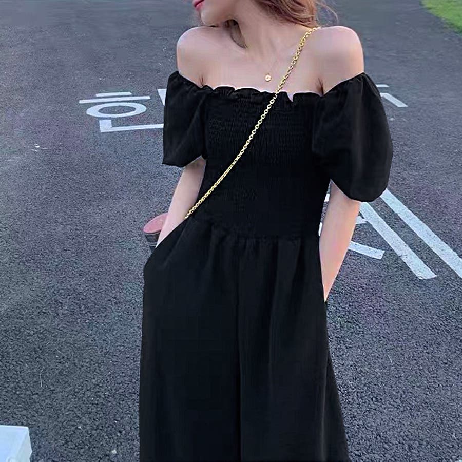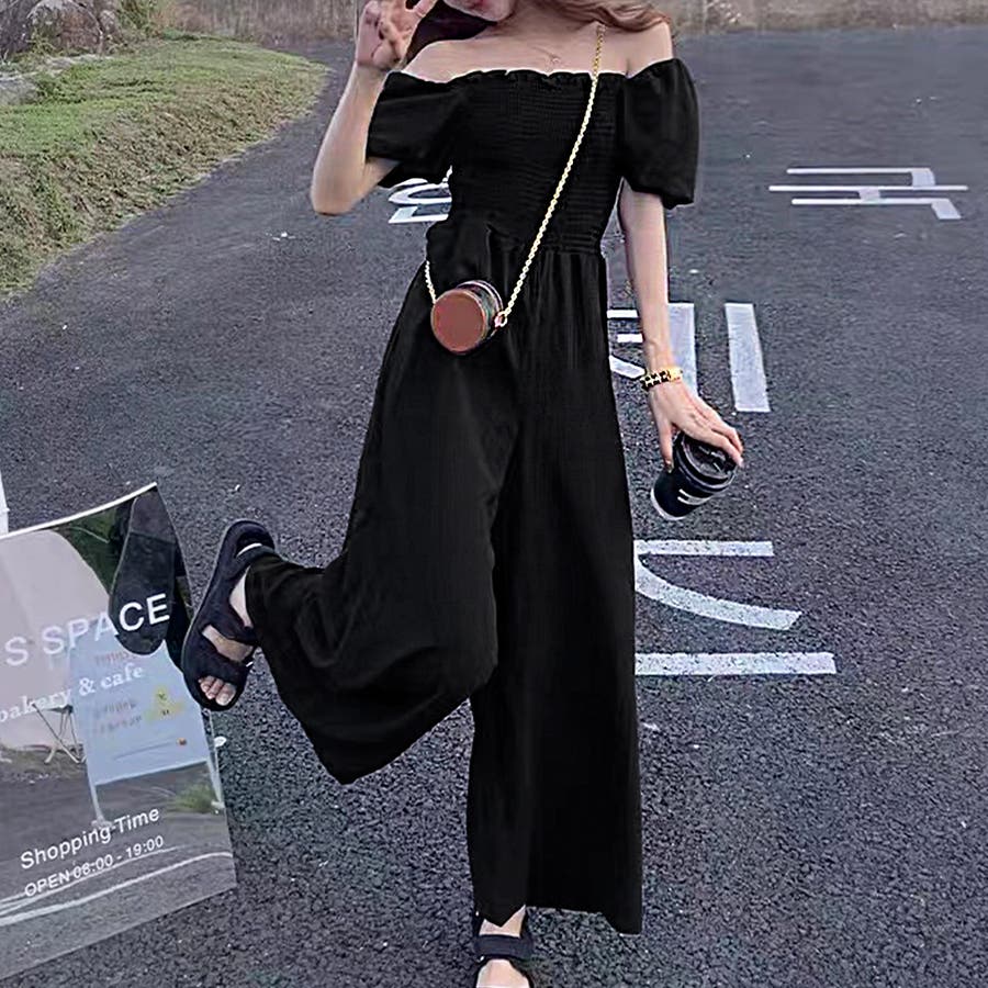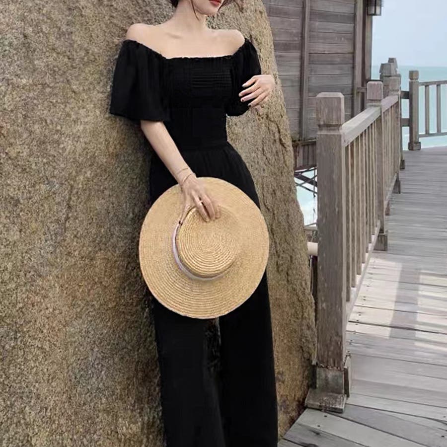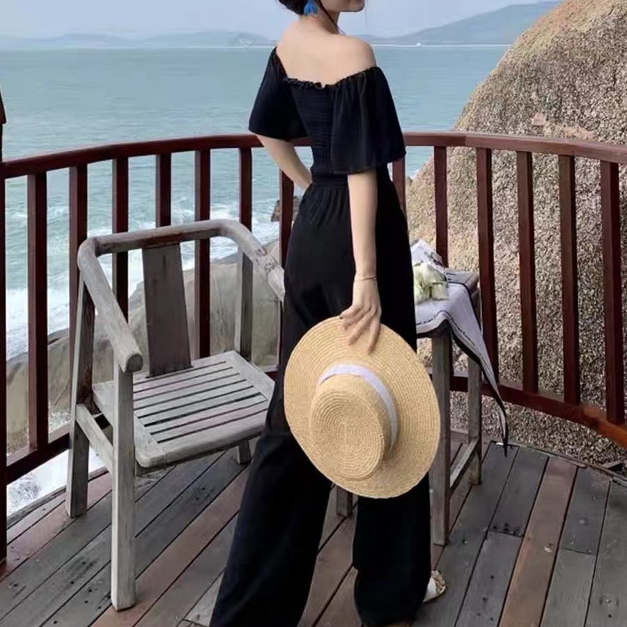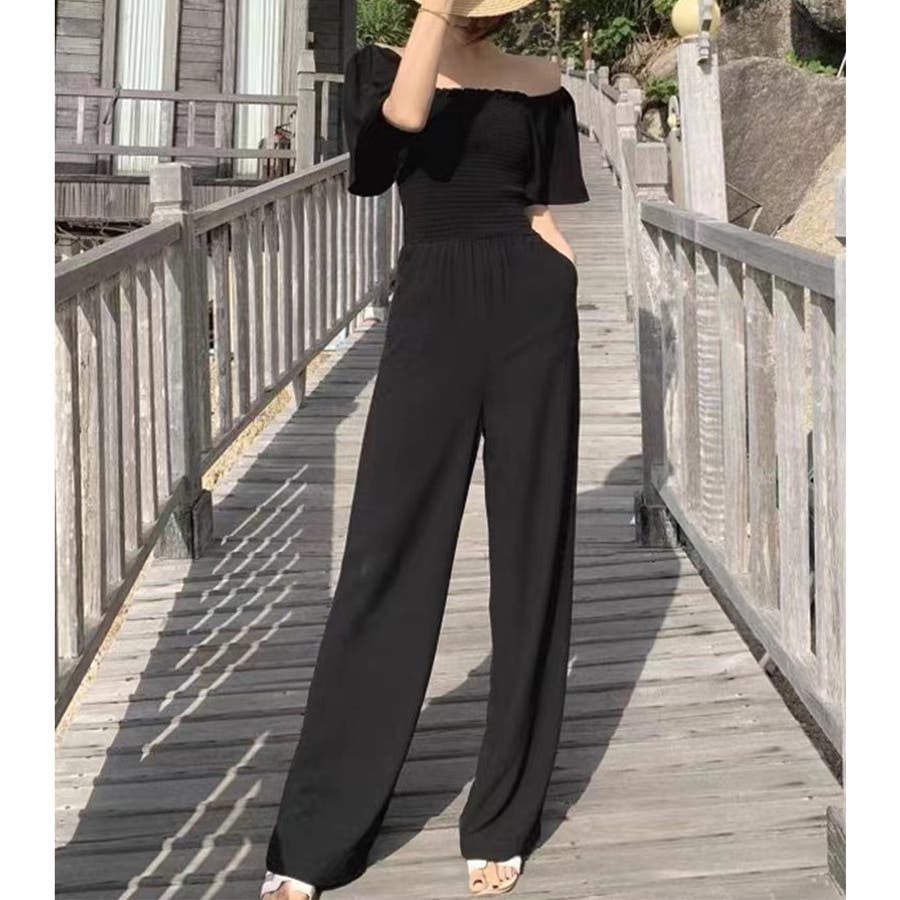 春/夏/春夏/春服/夏服/韓国/韓国ファッション/オルチャン/レディース/人気/プチプラ/オールインワン/オールイン/シャーリング/オフショルダー/オフショル/フレアスリーブ/半袖/シンプル/ハイウエスト/フレアパンツ/リゾート/大人リゾート/ビーチ/フェス/セクシー/かわいい/大人かわいい/大人ガーリー/200677