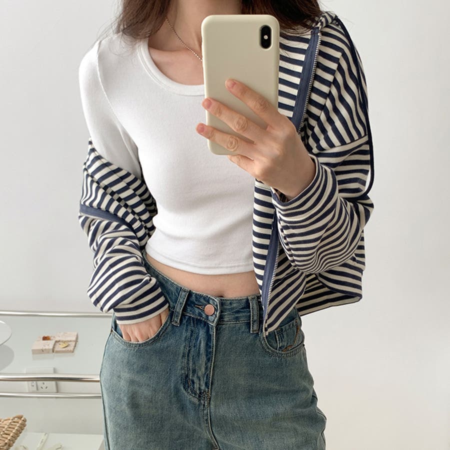 コンパクトなシルエットでおへそが覗くクロップド丈が旬なコーディネートを演出。