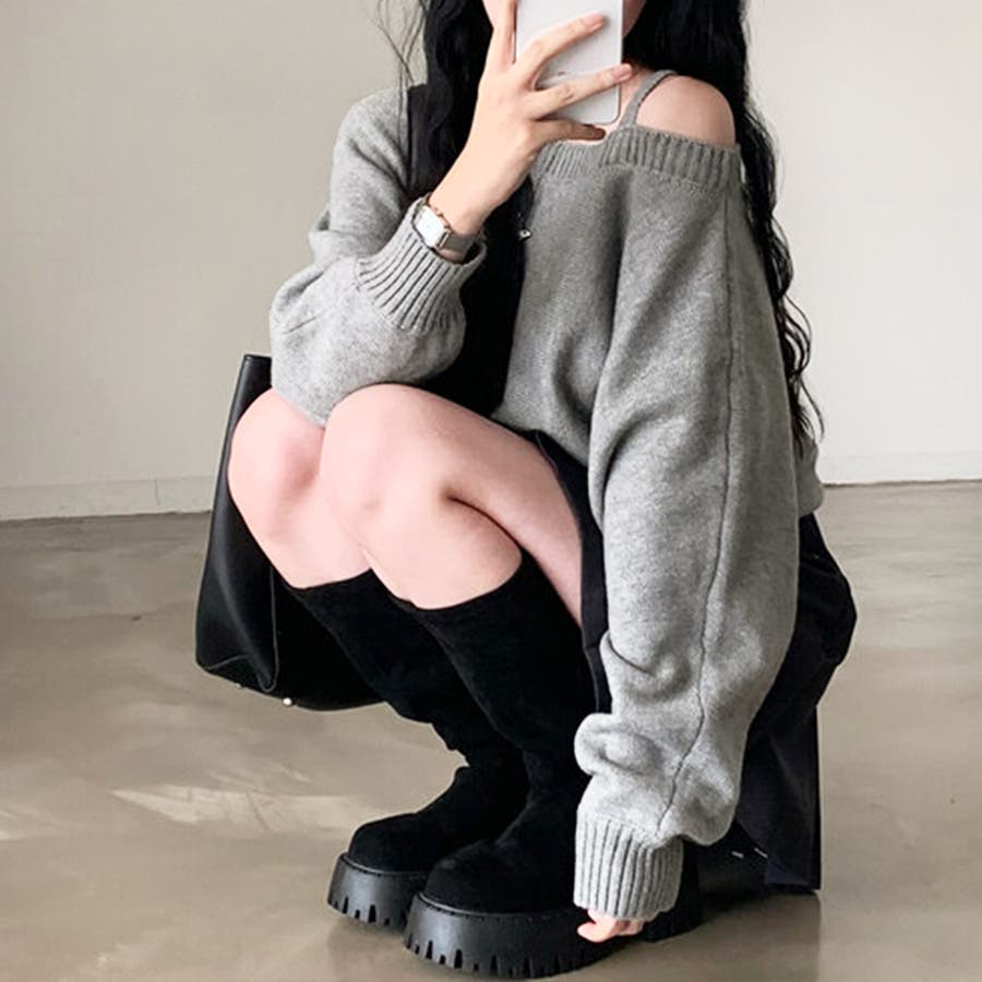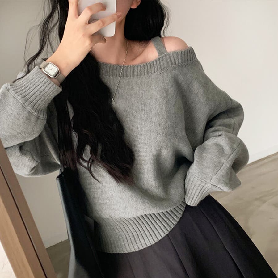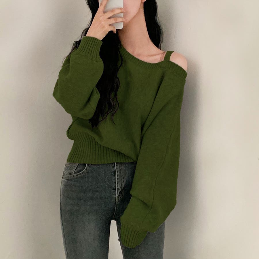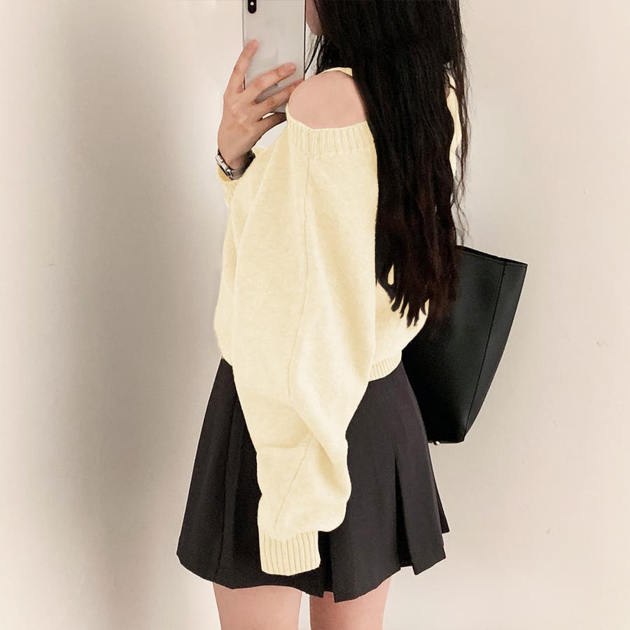 シンプルなミドルゲージの平編みがカジュアルな印象で肩出しもセクシーすぎずヘルシーな印象に◎