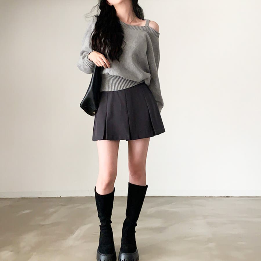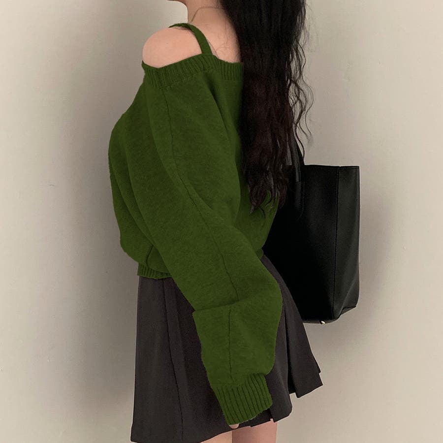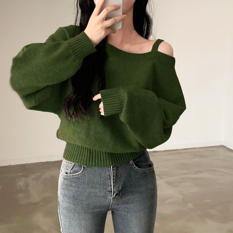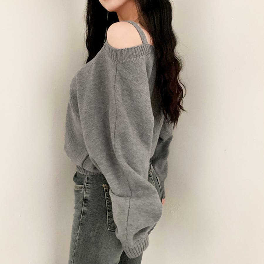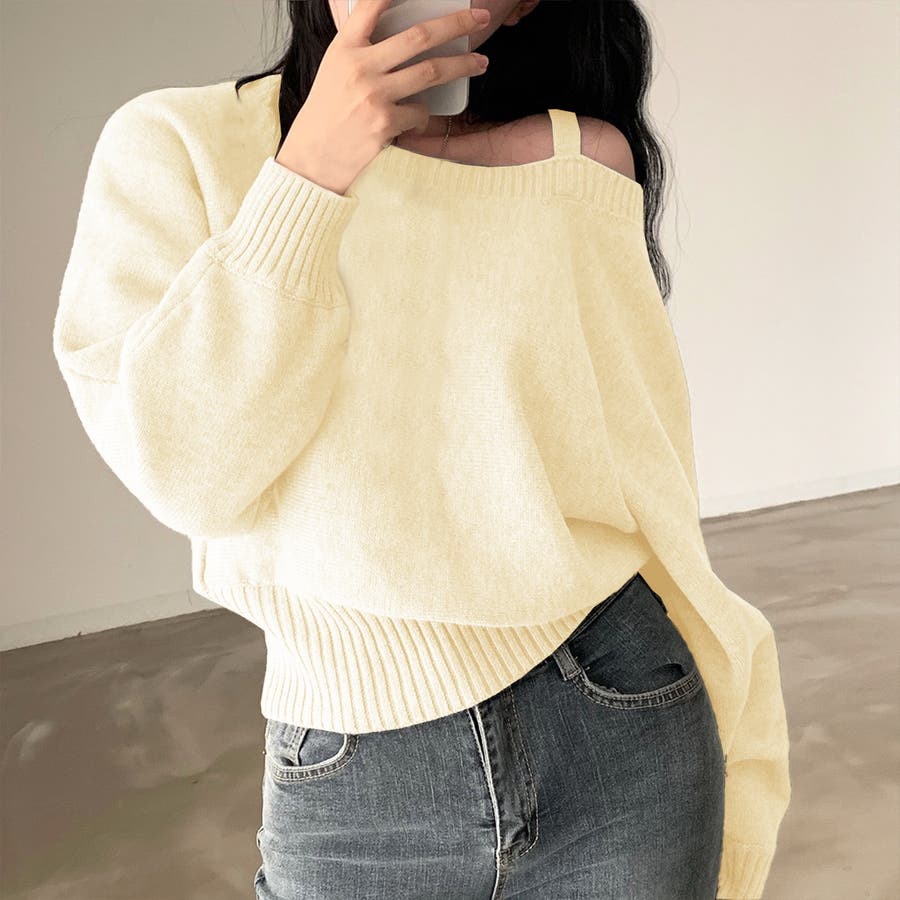 シンプルなミドルゲージの平編みがカジュアルな印象で肩出しもセクシーすぎずヘルシーな印象に◎