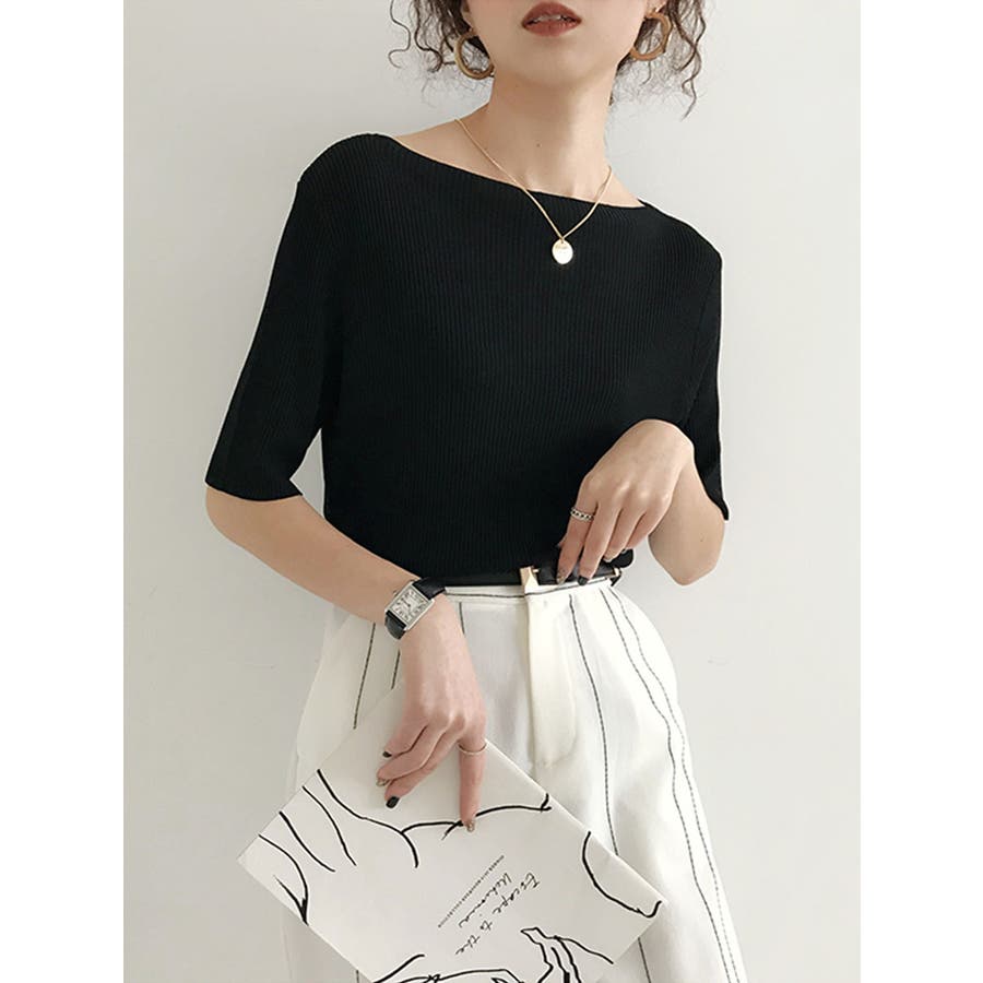 ボートネックがデコルテまわりをスッキリとした印象に。
