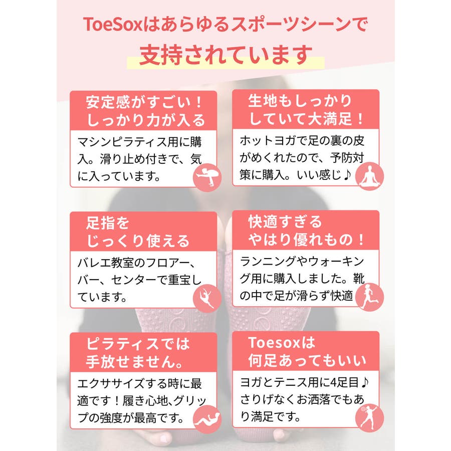 | 商品特徴について 履くだけで様々な足の健康や全身のサポートにつながり、足のパフォーマンスをより良いものにしてくれます。 素足に近い感覚なので、違和感なく運動することができます。 足裏にあるToeSox独自のグリップが、パフォーマンスをしっかりサポートします。 運動時につま先(指)が独立して自由に動くので、バランスと俊敏性が向上します。 素材の優れた速乾・吸湿技術により、汗をかいても快適な履き心地が続き、指の間のこすれの軽減、水ぶくれの防止になります。 ベロ付きのかかとなので、ソックスを引き上げやすく、靴ずれの原因である摩擦を抑えてくれます。 スタッフコメント 足裏のグリップが滑りを防止して、しっかり地面に足をつけることができます。足指の動きを意識できるので、難しいポーズにも挑戦しやすかったです。汗を多くかくシーンも足指の間の汗も気にならず、サラッと快適でいられます。かわいいカラーも多く、夏はスポーツサンダルの下に履いてコーディネートを楽しみながら冷え対策しています。つま先なしタイプなのでペディキュアも隠れず可愛く履けます。 |