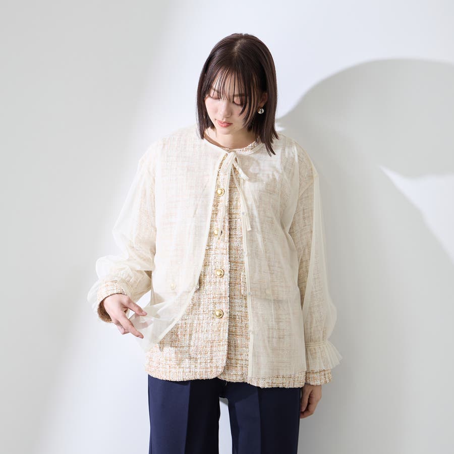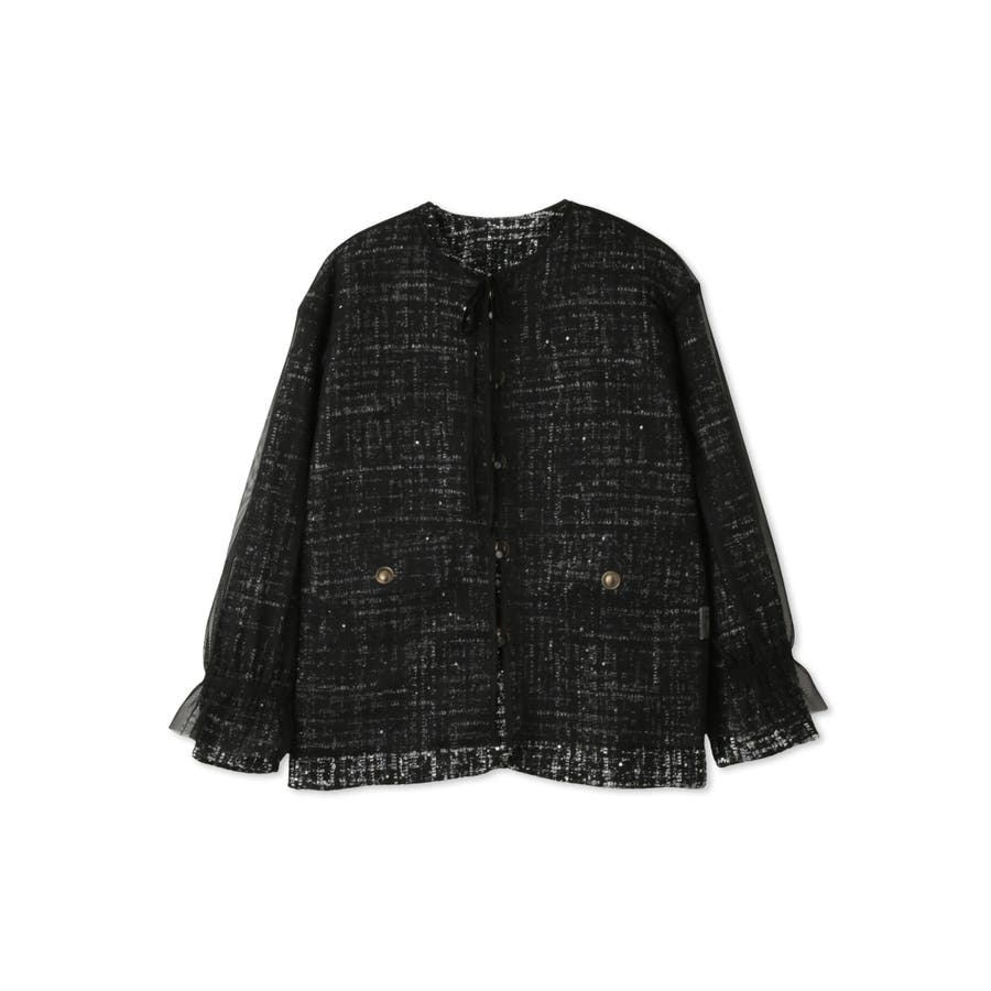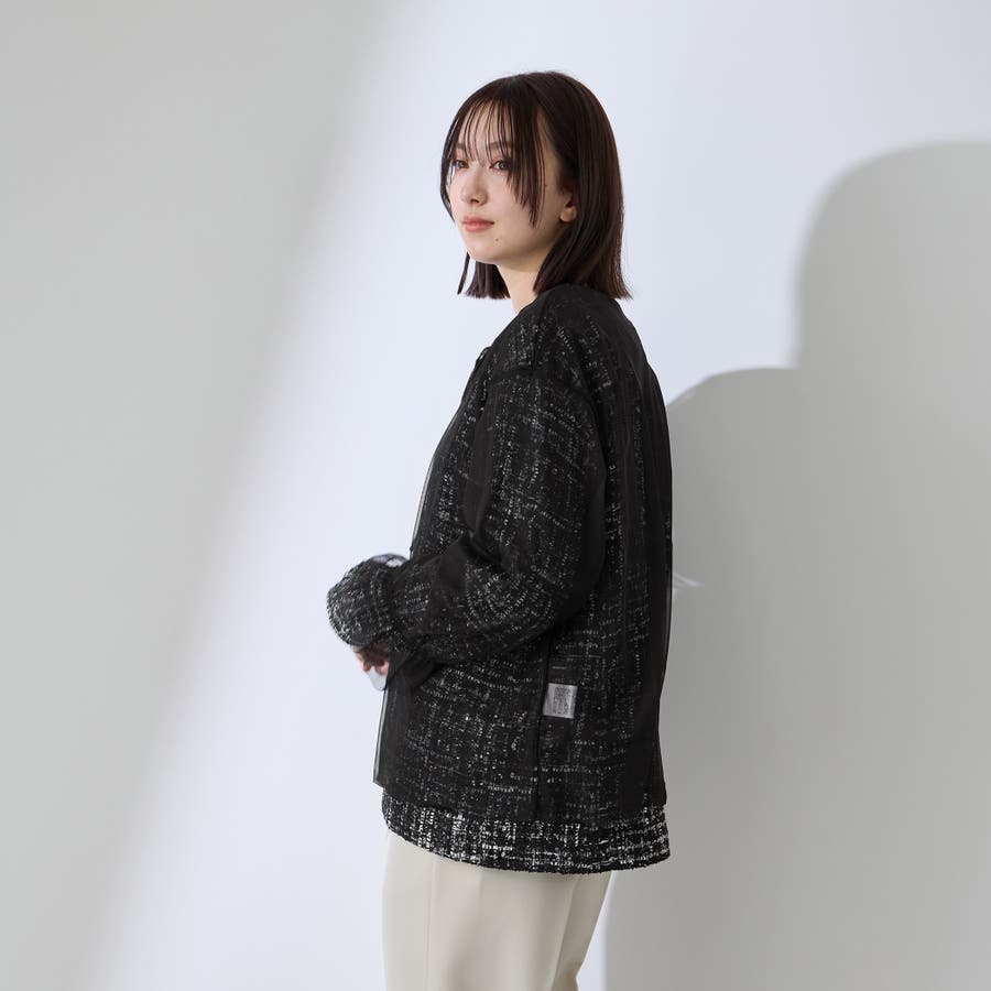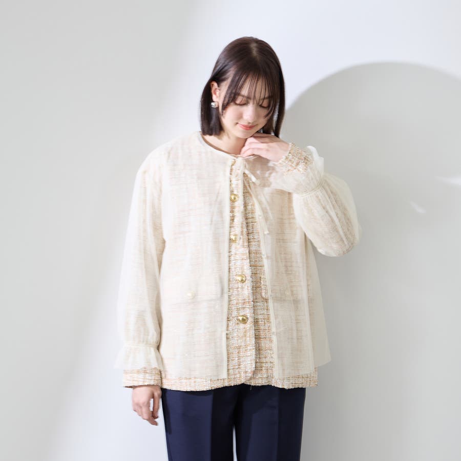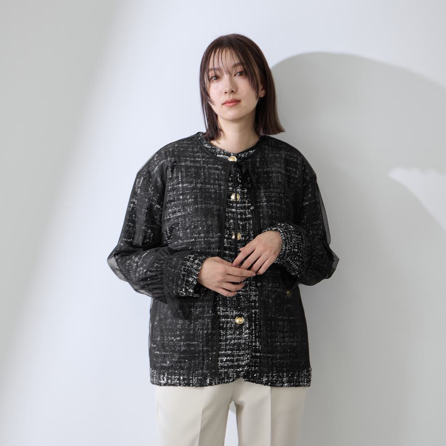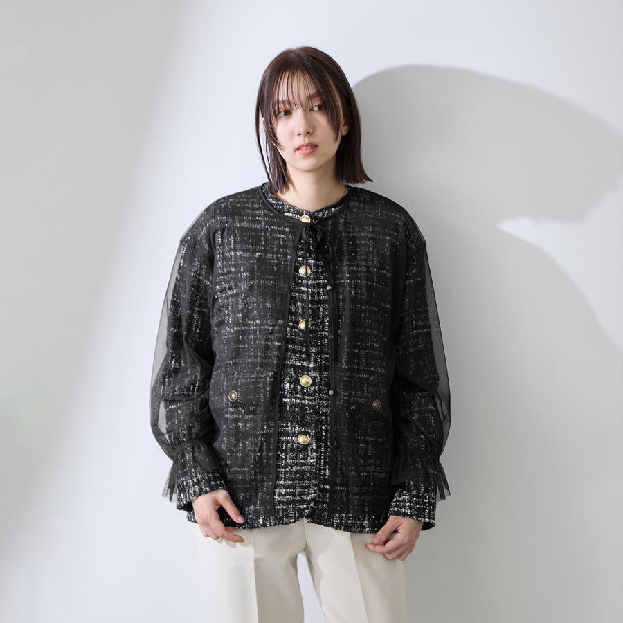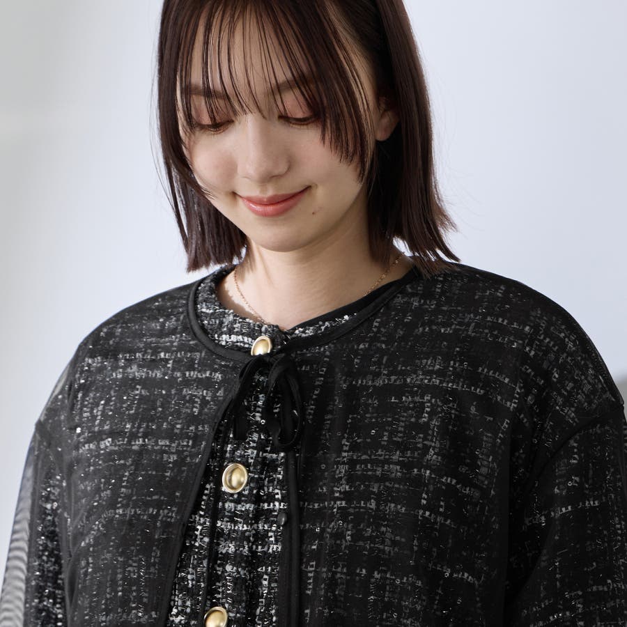 ミックスカラーのツィードジャケットと単品使いも可能なチュールカーディガンの2ピースセットアイテムです。