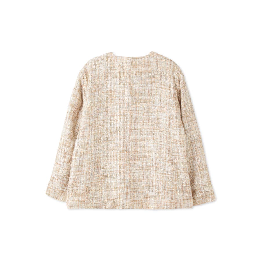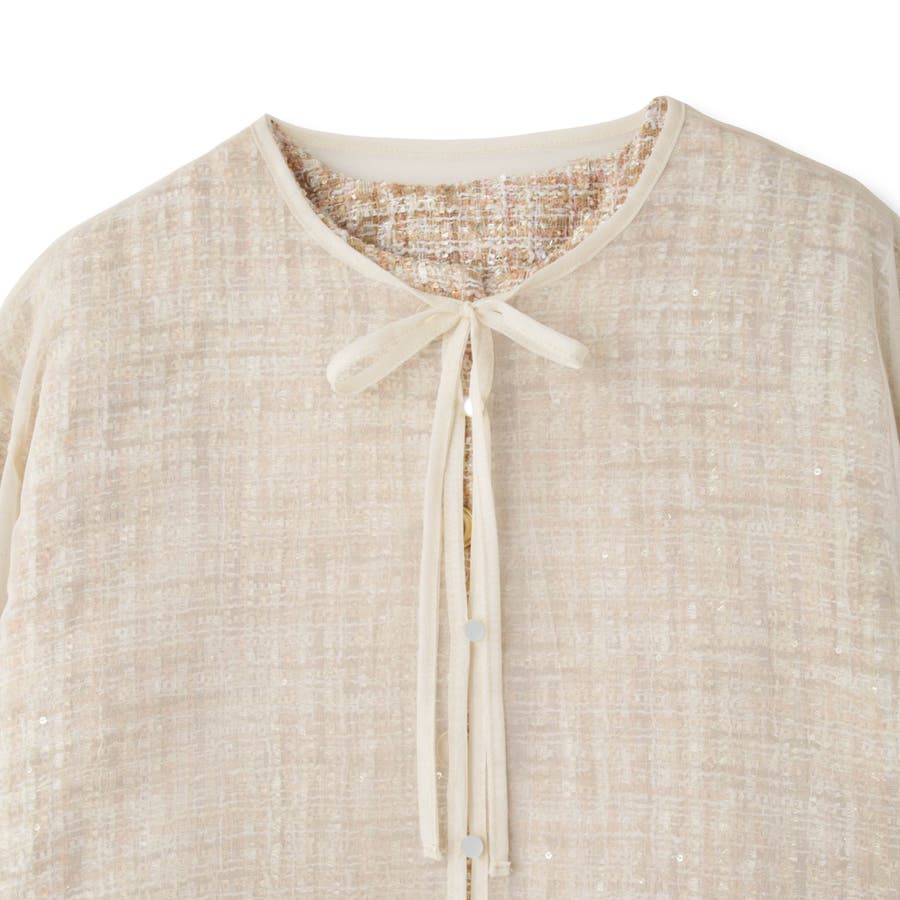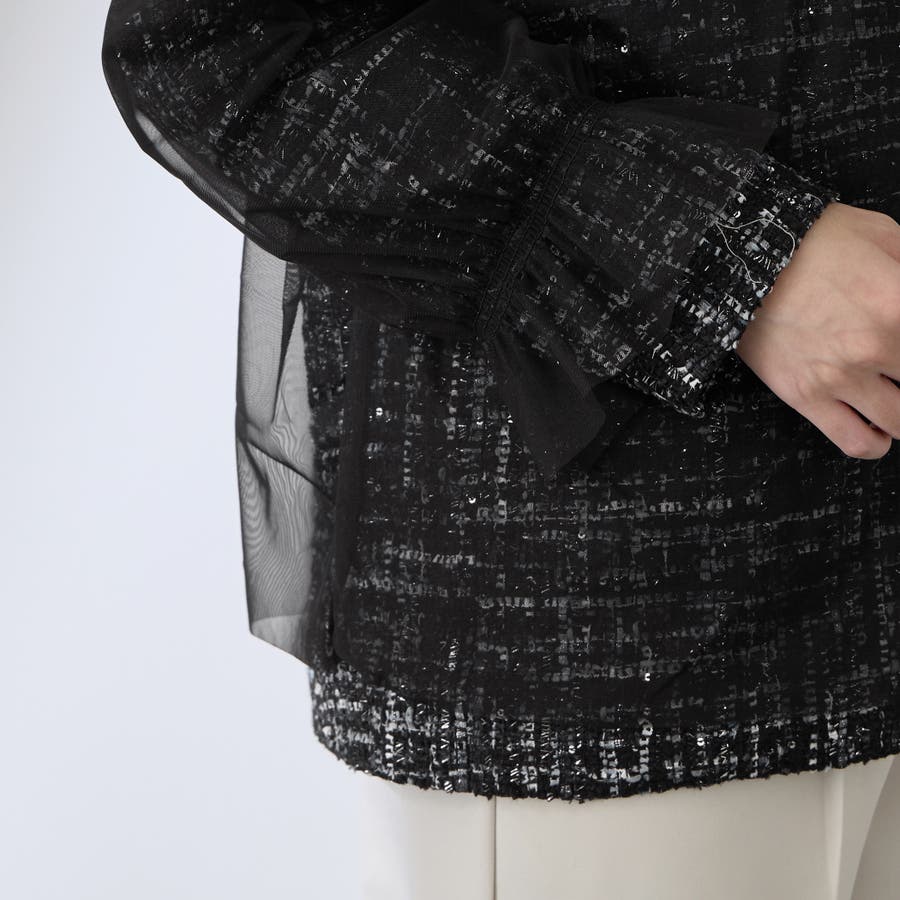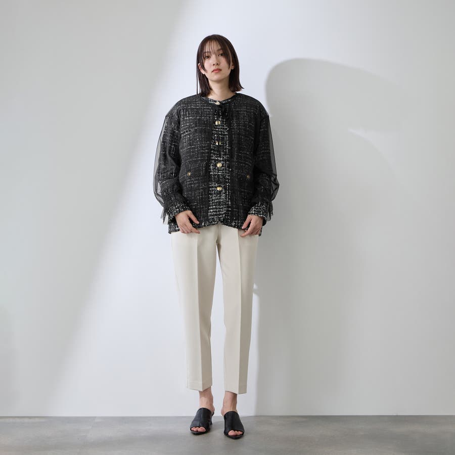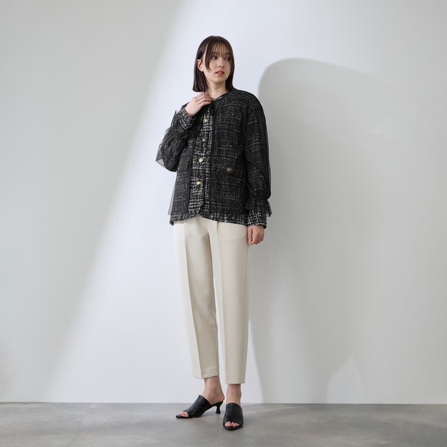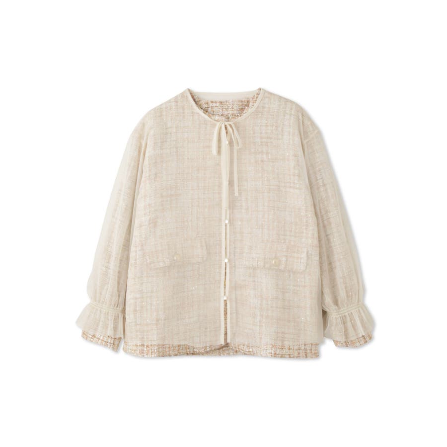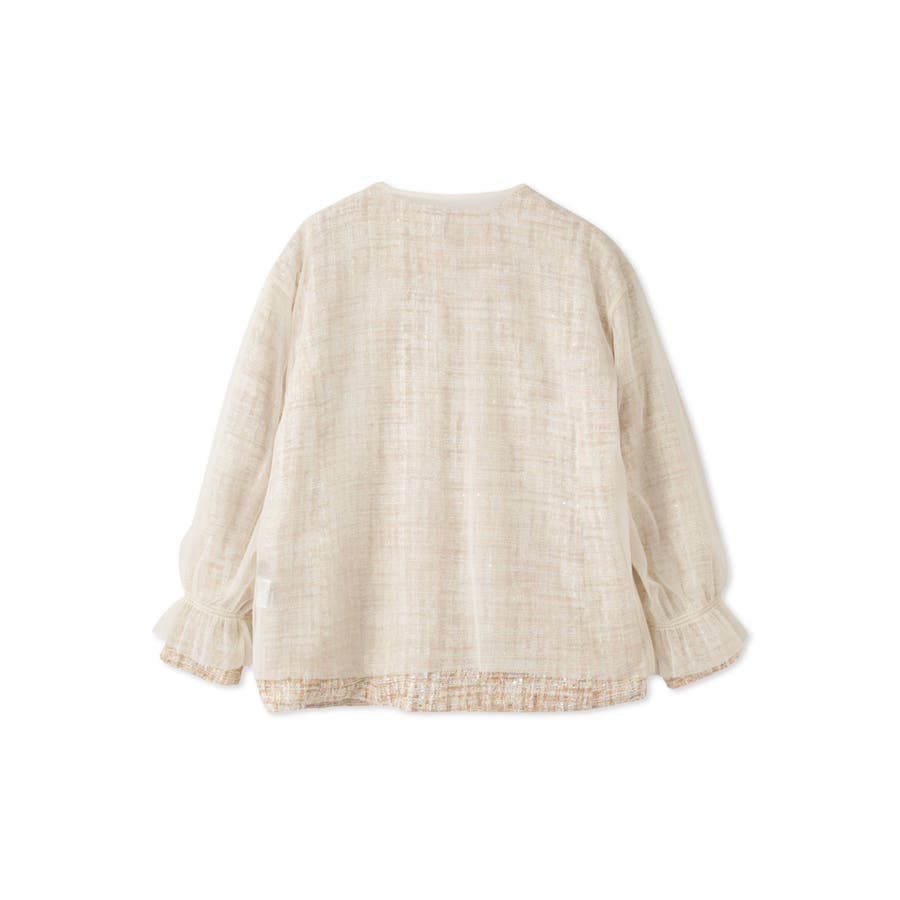 ミックスカラーのツィードジャケットと単品使いも可能なチュールカーディガンの2ピースセットアイテムです。