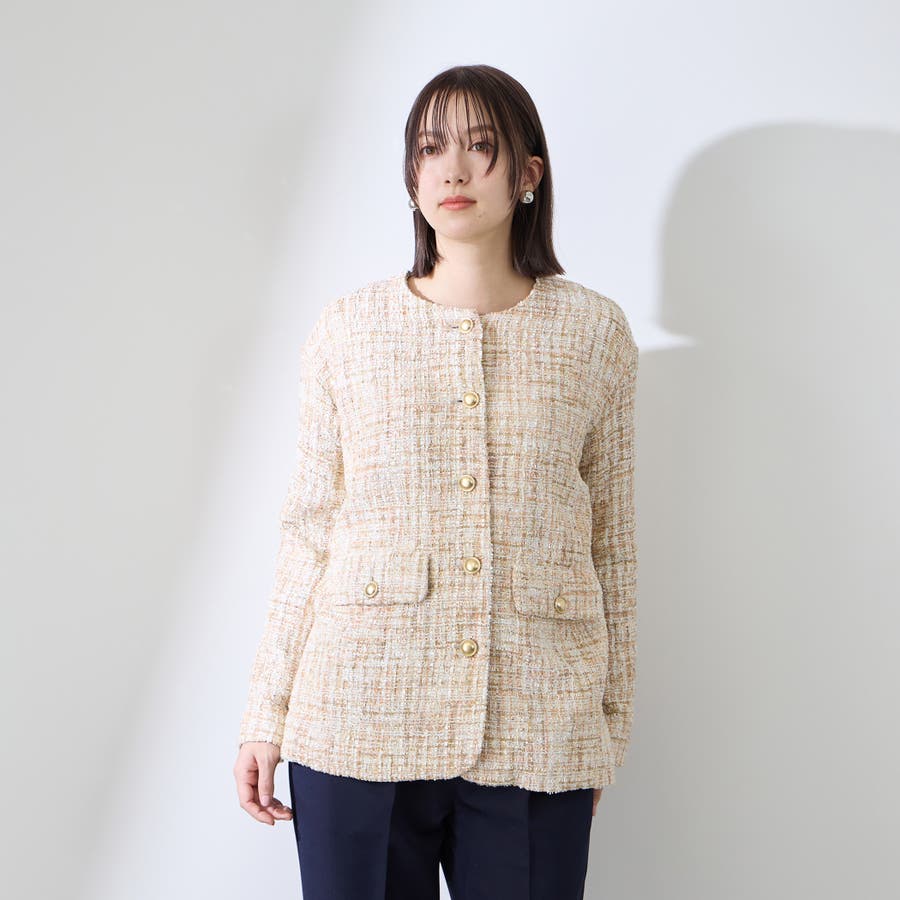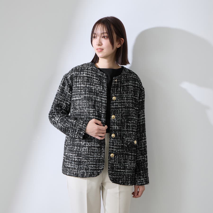 ツィードジャケットは中にニットなども着こめるゆとりのある設計にしています。