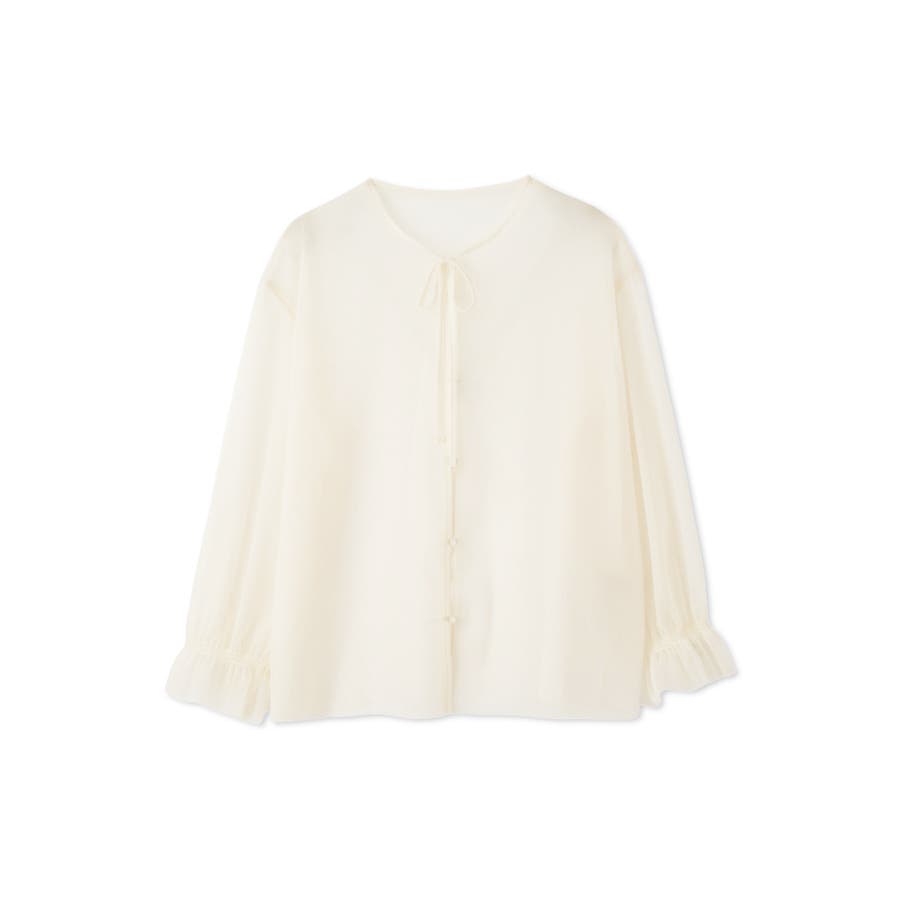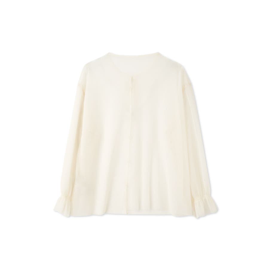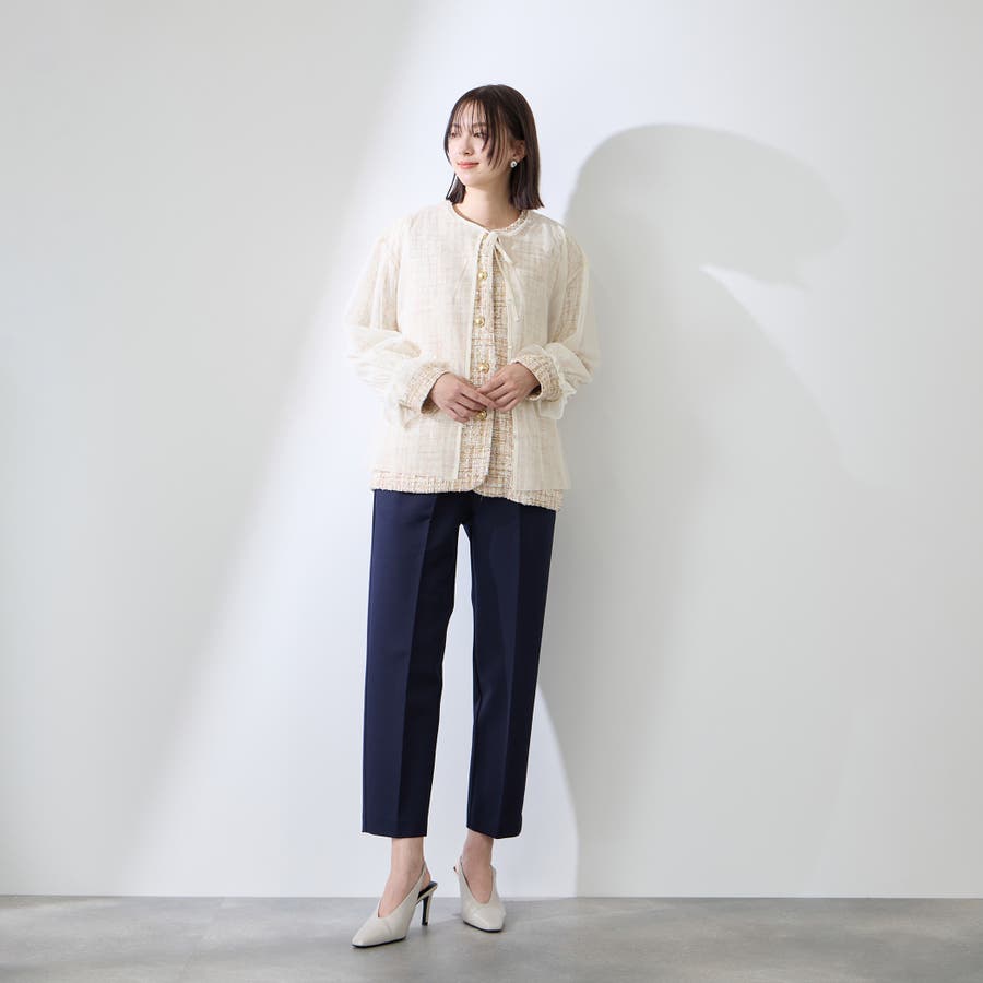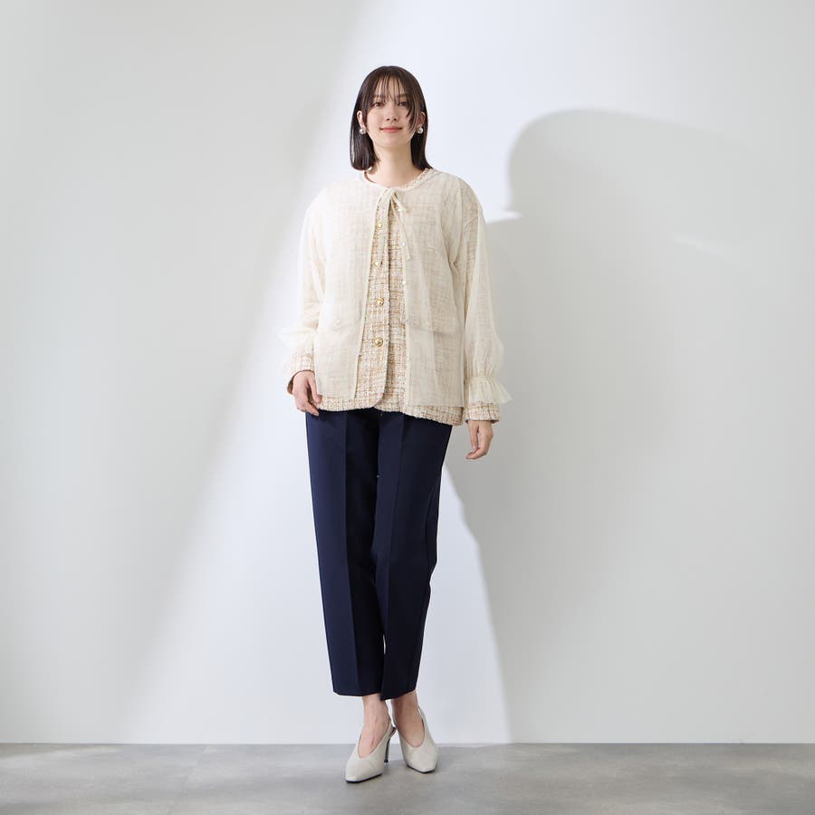 また、チュールカーディガンはナローコードを配置したネックデザインで、袖先はキャンディスリーブになっており、重ねて着て頂いたときにふんわりと軽やかなフェミニンフォルムに仕上げます。