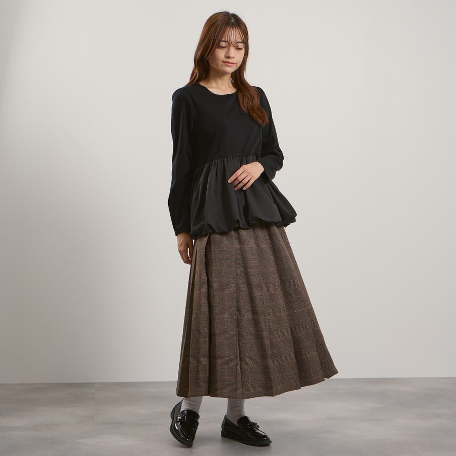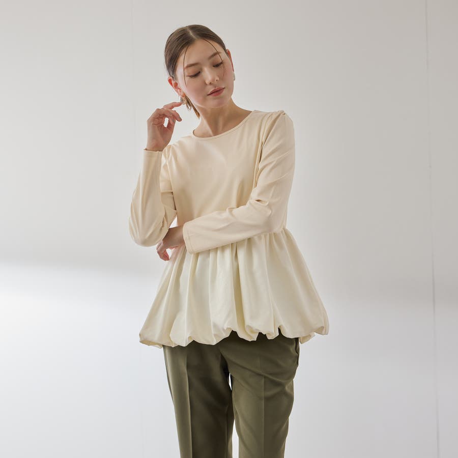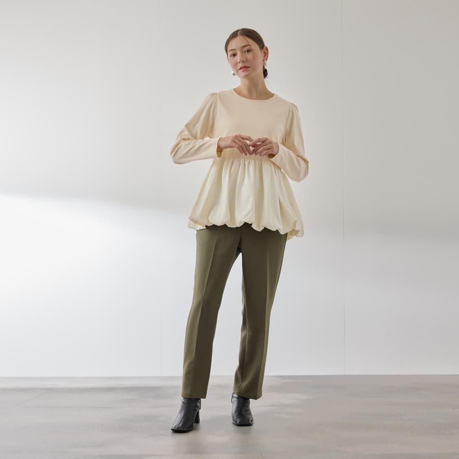 変型ペプラムラインのトップスなので、Iラインスカートやテーパードなどレッグラインに寄り添うシルエットのボトムスをあわせていただくとバランスよくご着用いただけます。