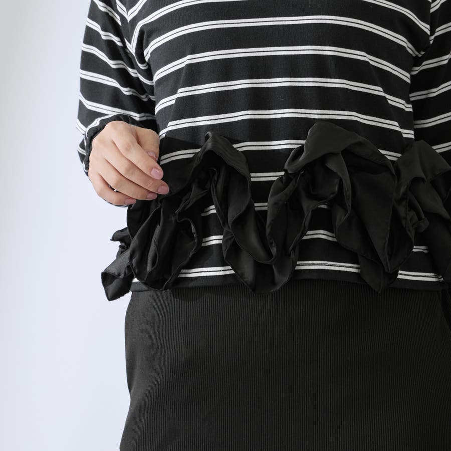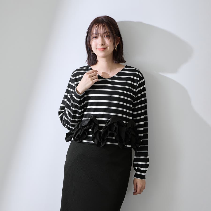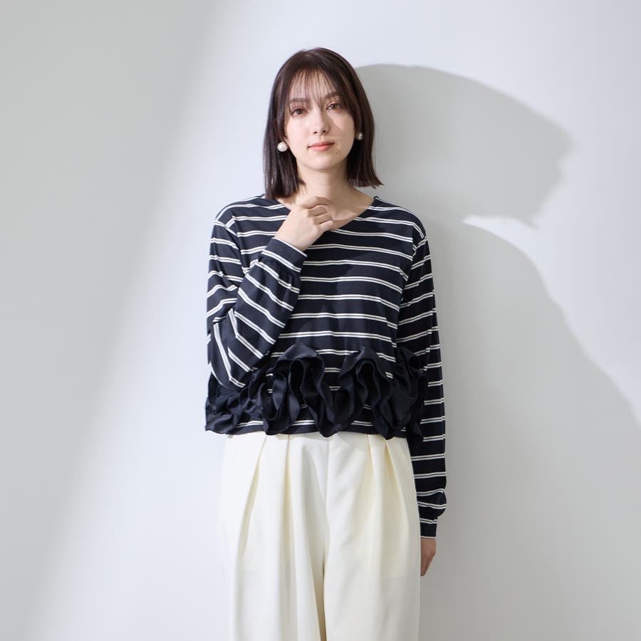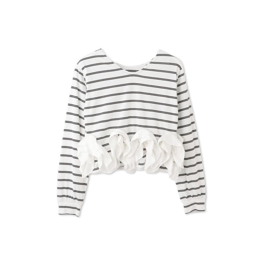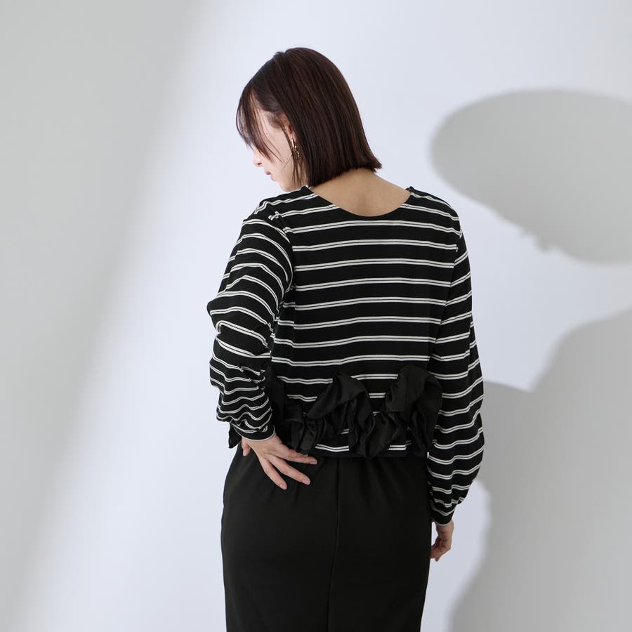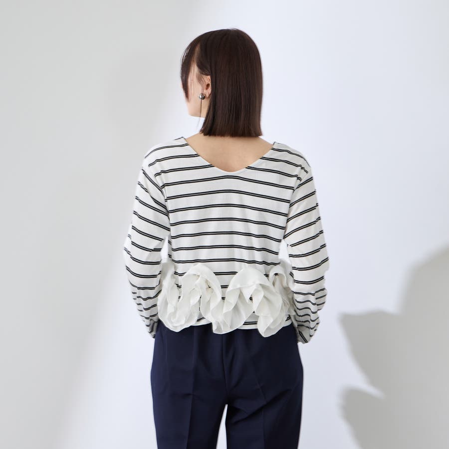 ボディ部分を程よい肉感のジャージー素材、裾部分を布帛でリズミカルな大ぶりのフリルデザインで切替えたクロップドプルオーバーです。