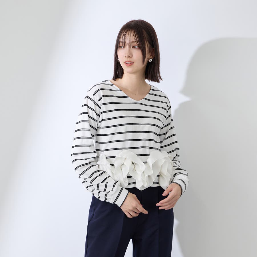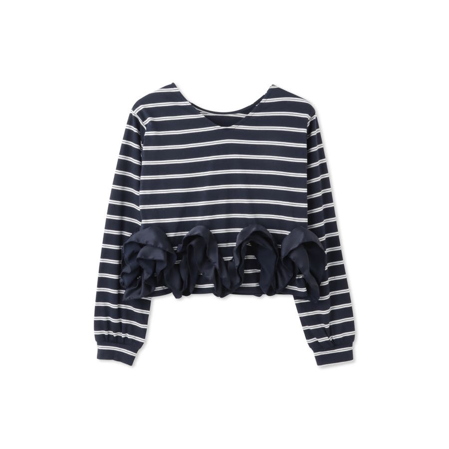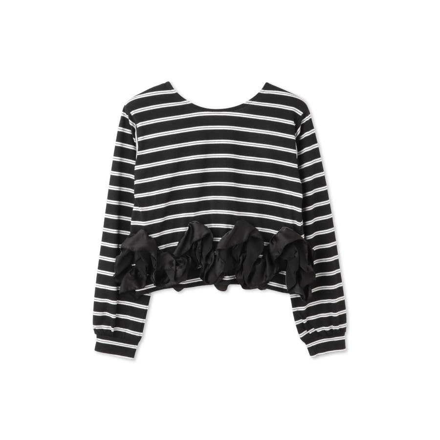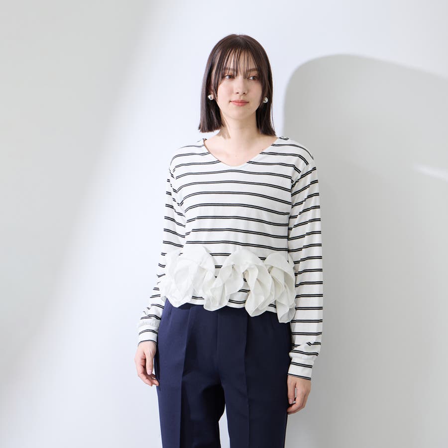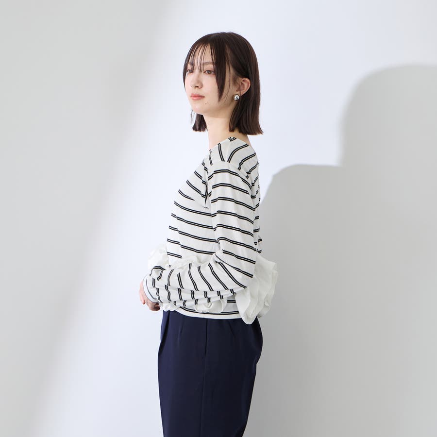 ボディ部分を程よい肉感のジャージー素材、裾部分を布帛でリズミカルな大ぶりのフリルデザインで切替えたクロップドプルオーバーです。