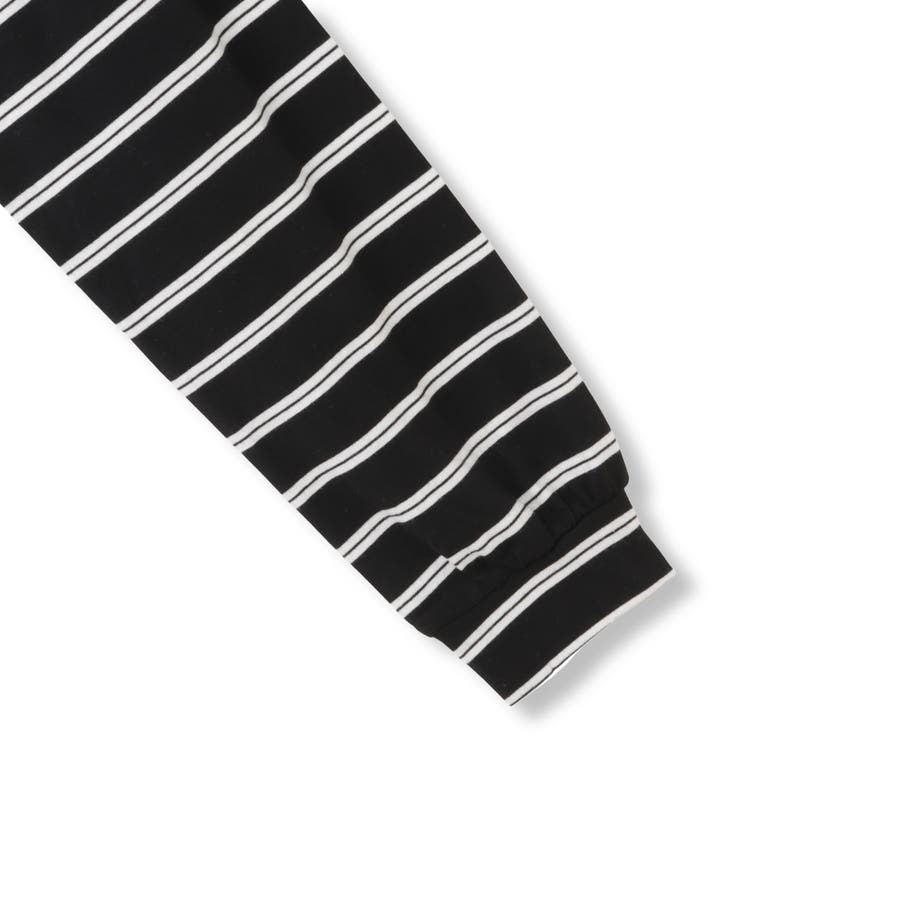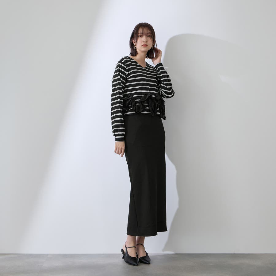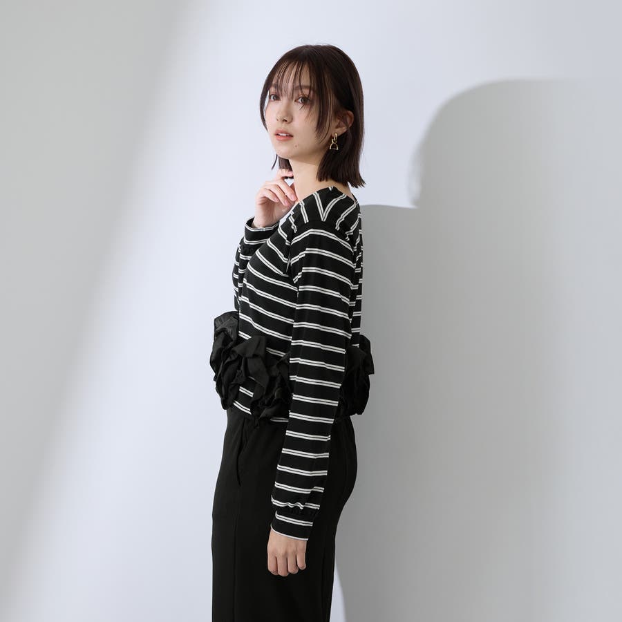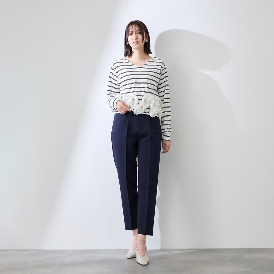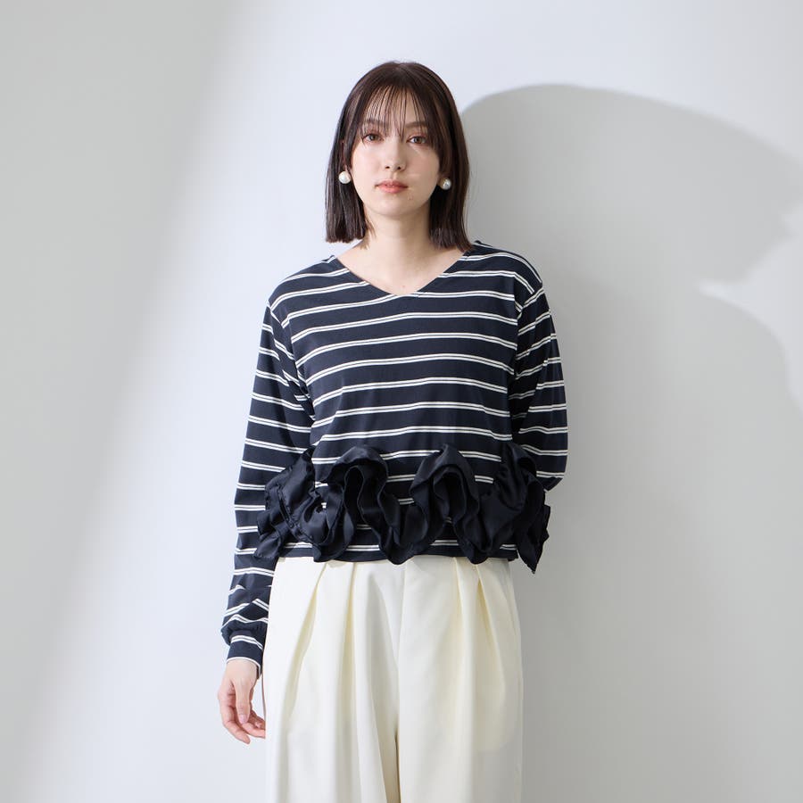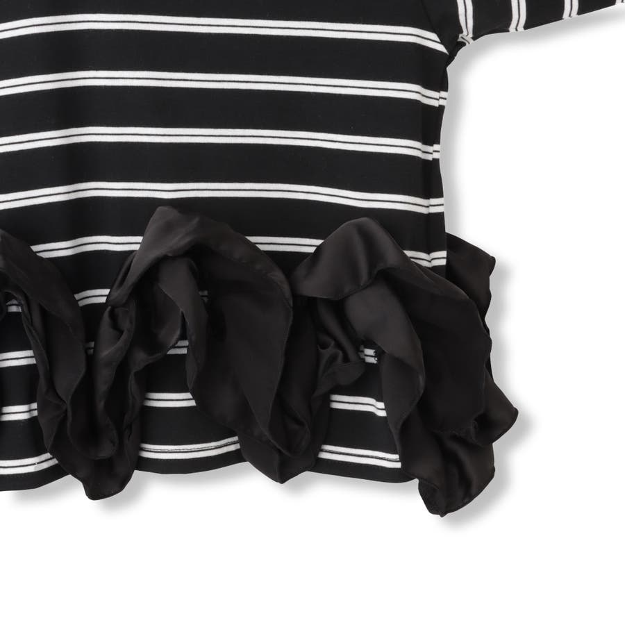 ボディ部分を程よい肉感のジャージー素材、裾部分を布帛でリズミカルな大ぶりのフリルデザインで切替えたクロップドプルオーバーです。