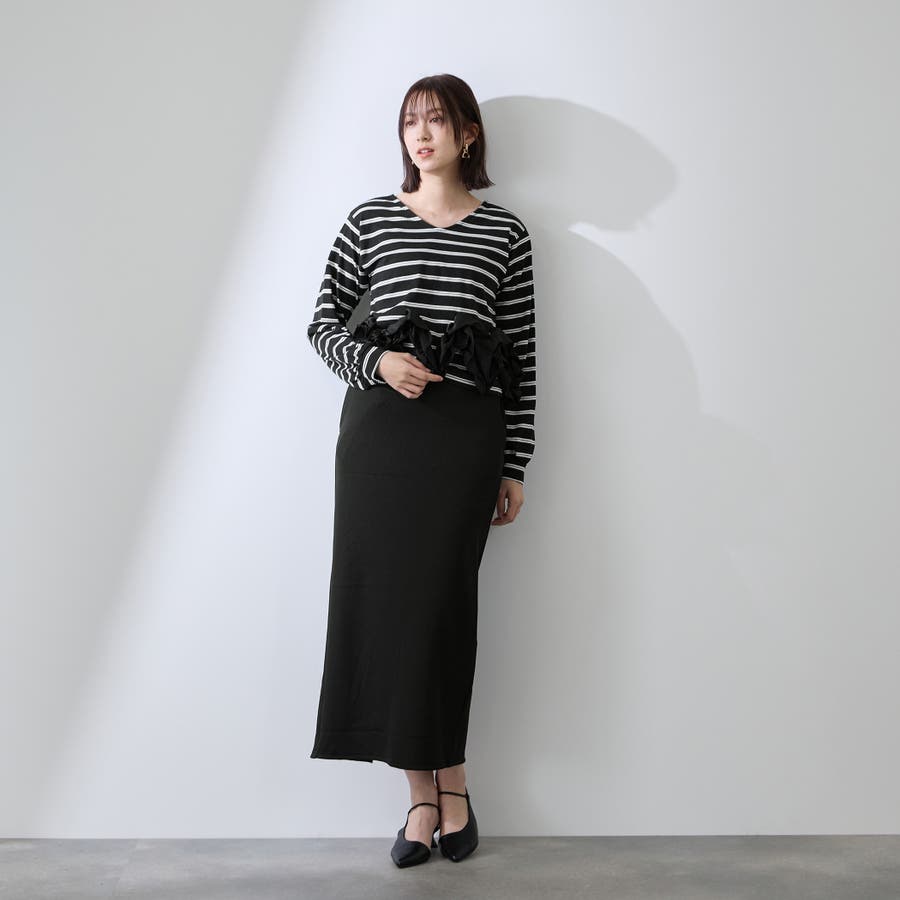 ウエストラインにボリュームがくるように設定した短めの着丈で、ハイウエストのスカートやワイドパンツとの着合わせていただくとスタイルアップなバランスでご着用いただけます。