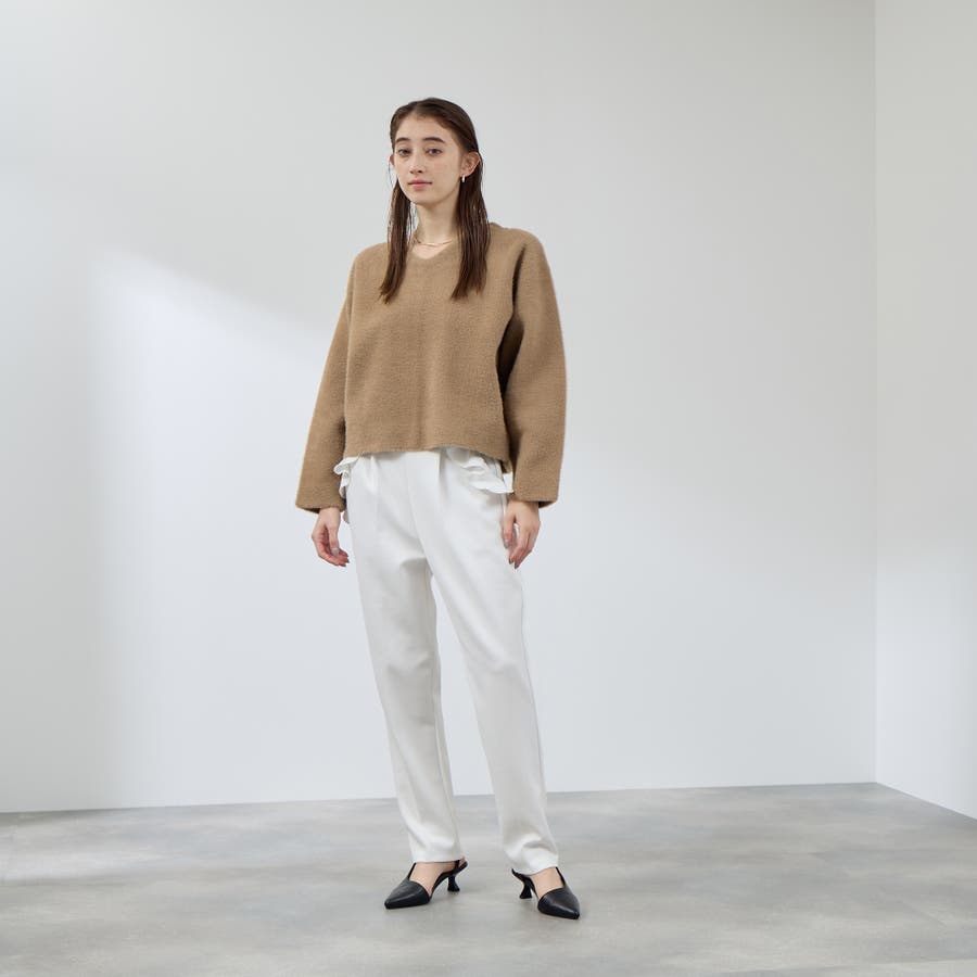 短めのボクシーフィットのコンパクトトップスなどをあわせて頂いて、フリルデザインを着こなしのポイントにして頂くのがおすすめです。