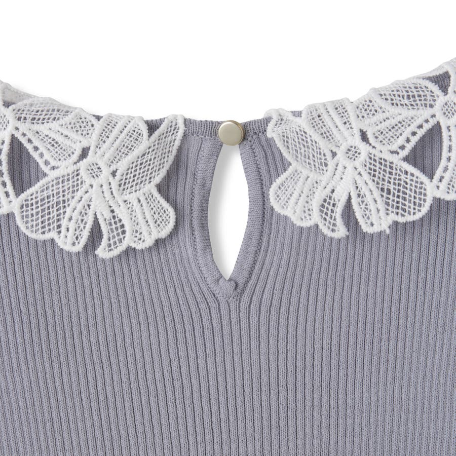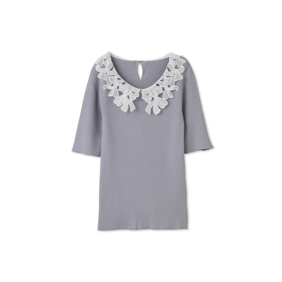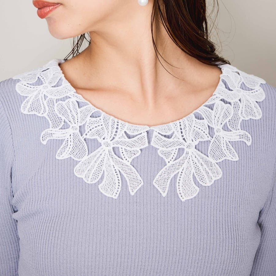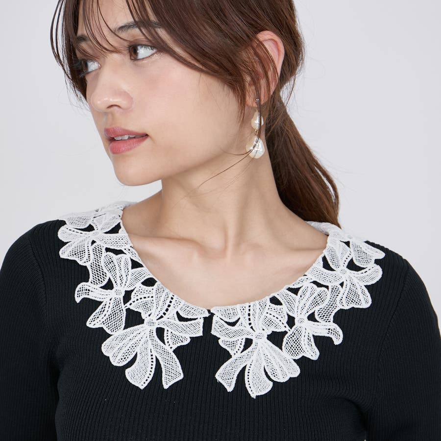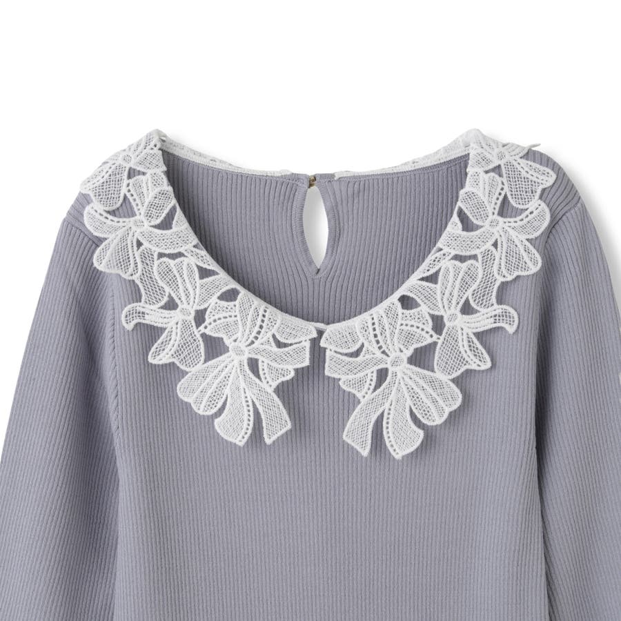 リボンをかたどったようなレースカラーが印象的なハイゲージのニットトップスです。
