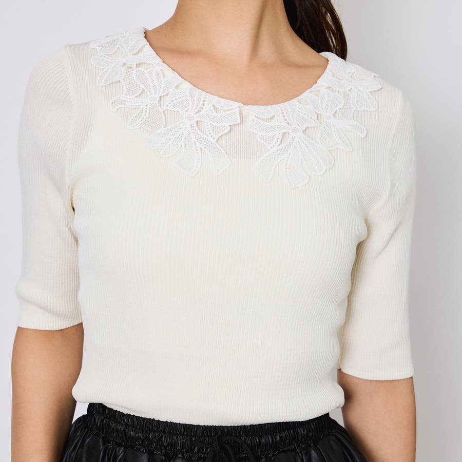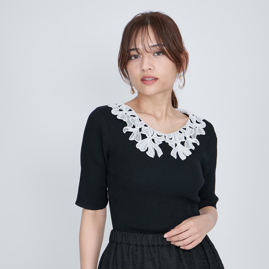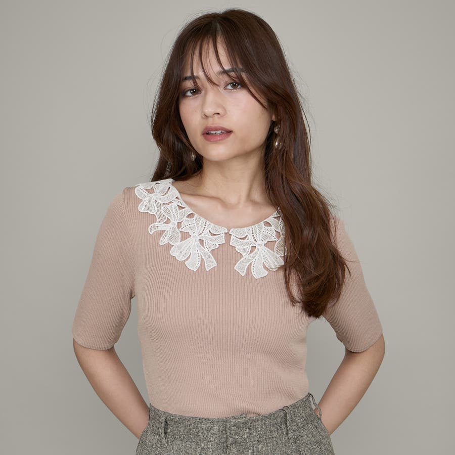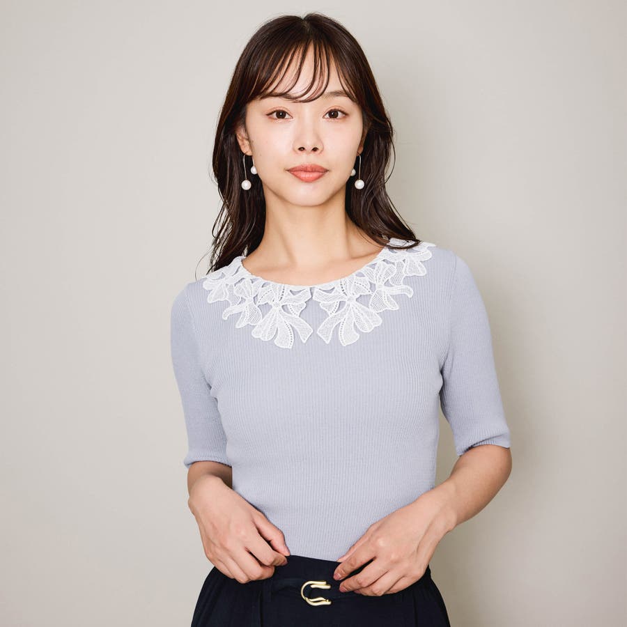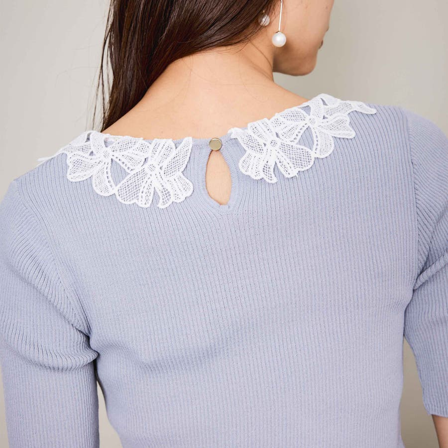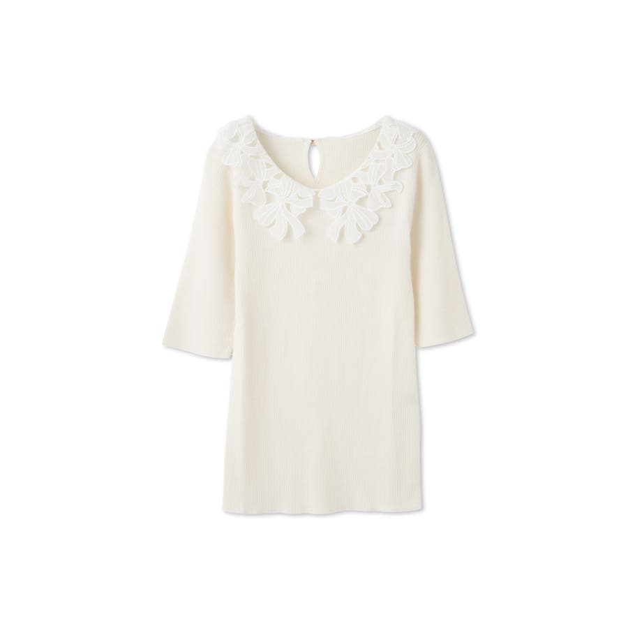リボンをかたどったようなレースカラーが印象的なハイゲージのニットトップスです。