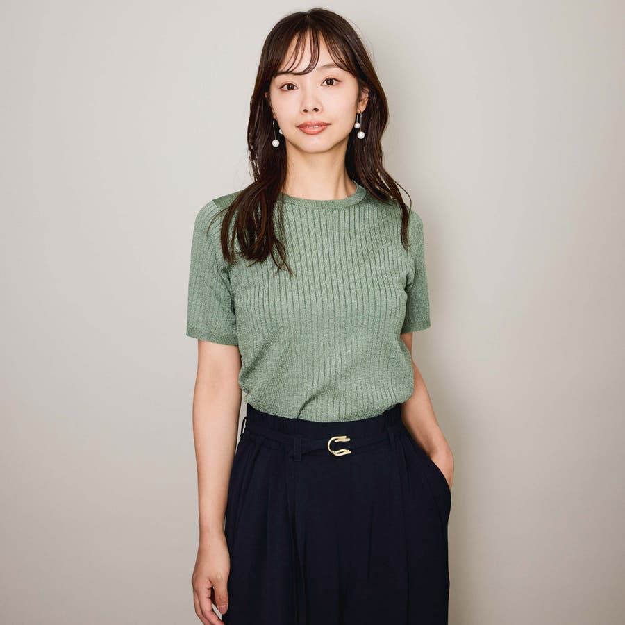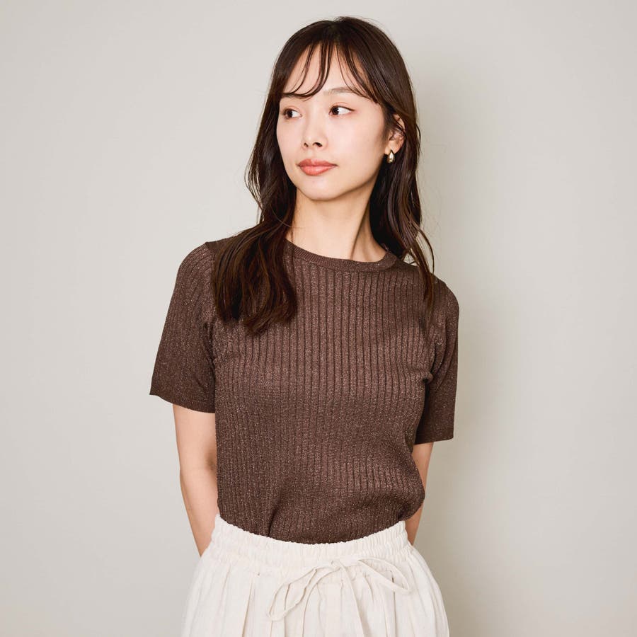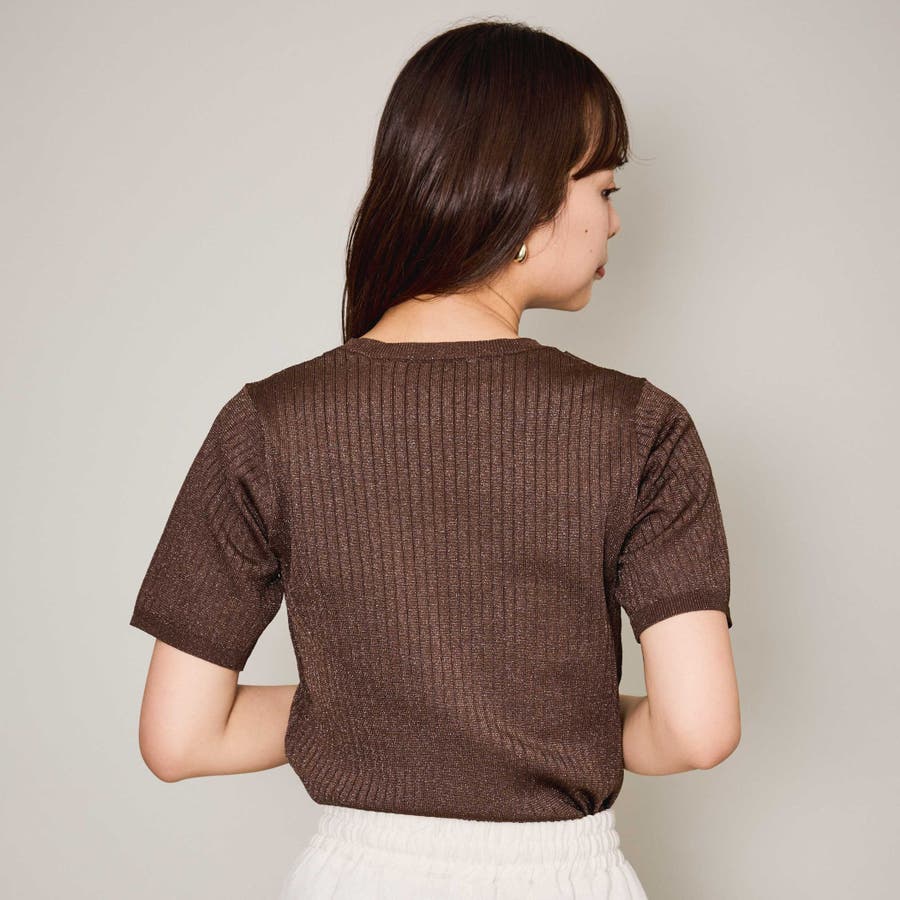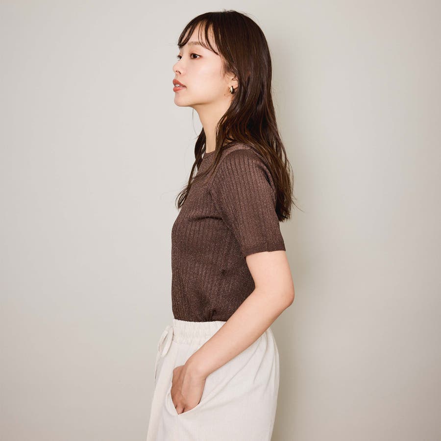 微光沢感のある糸を使用した半袖ニットトップスです。