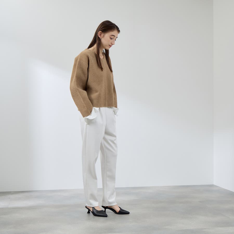 横に幅があり、深さの浅いネックデザインなので、一枚でほんのりデコルテコンシャスに、シアーインナーなどをあわせてニュアンス感のあるレイヤードスタイルでも首元を軽やかに演出します。