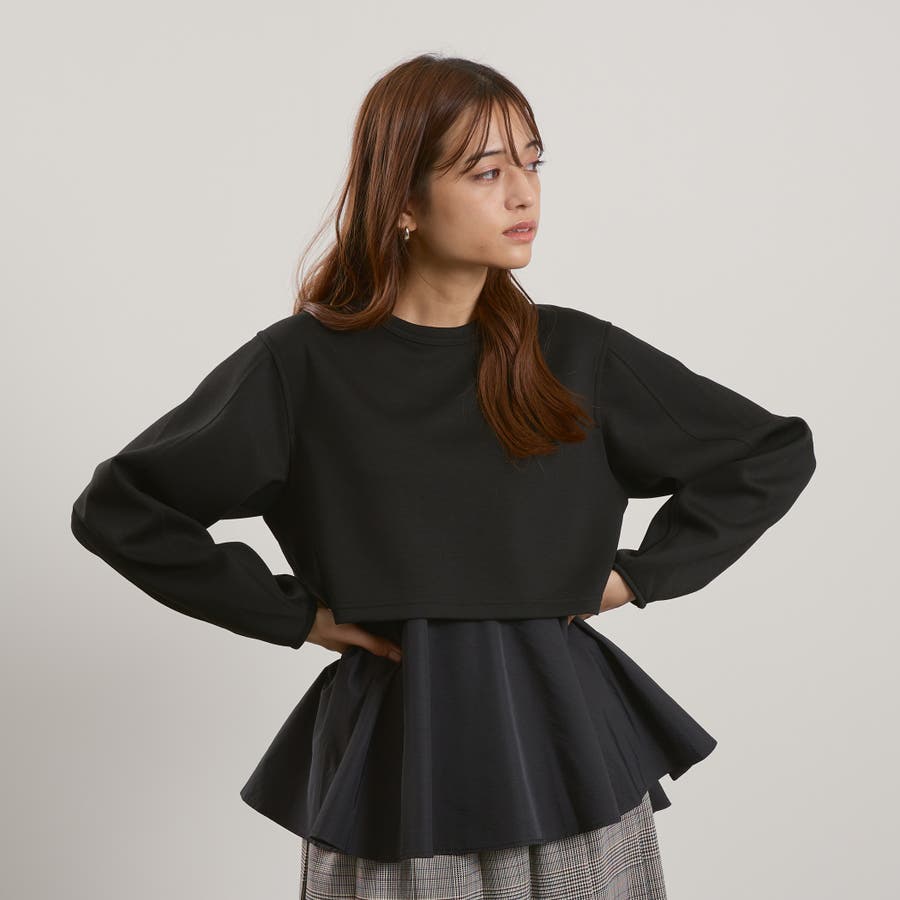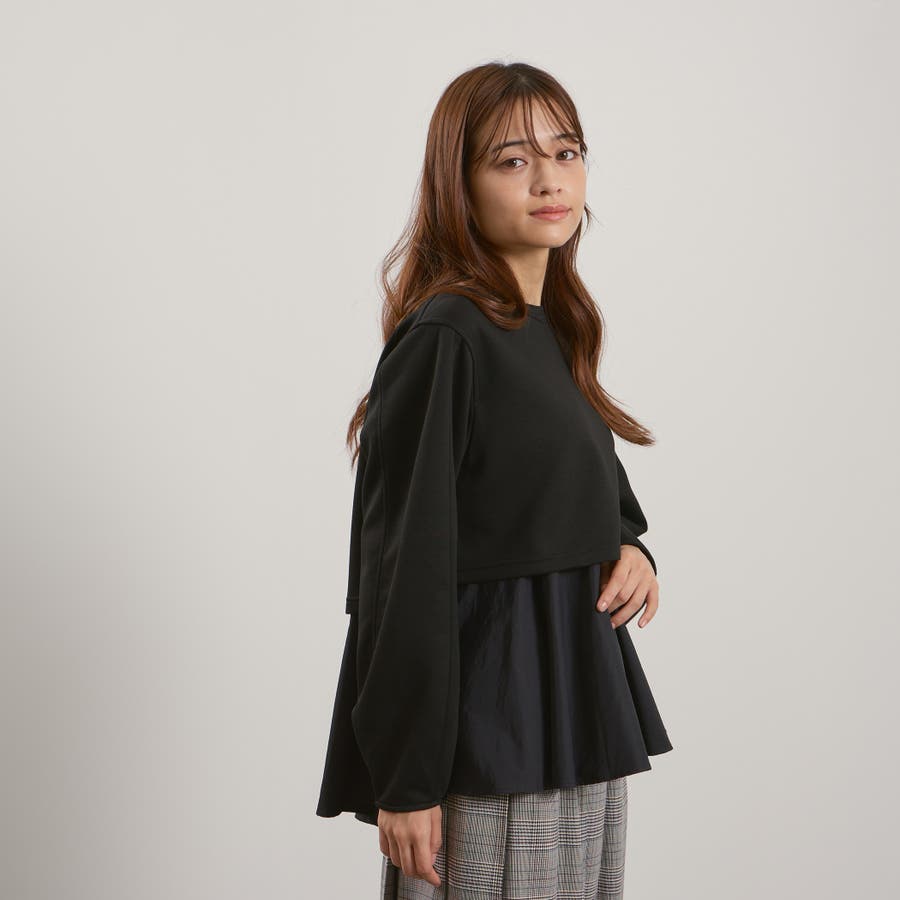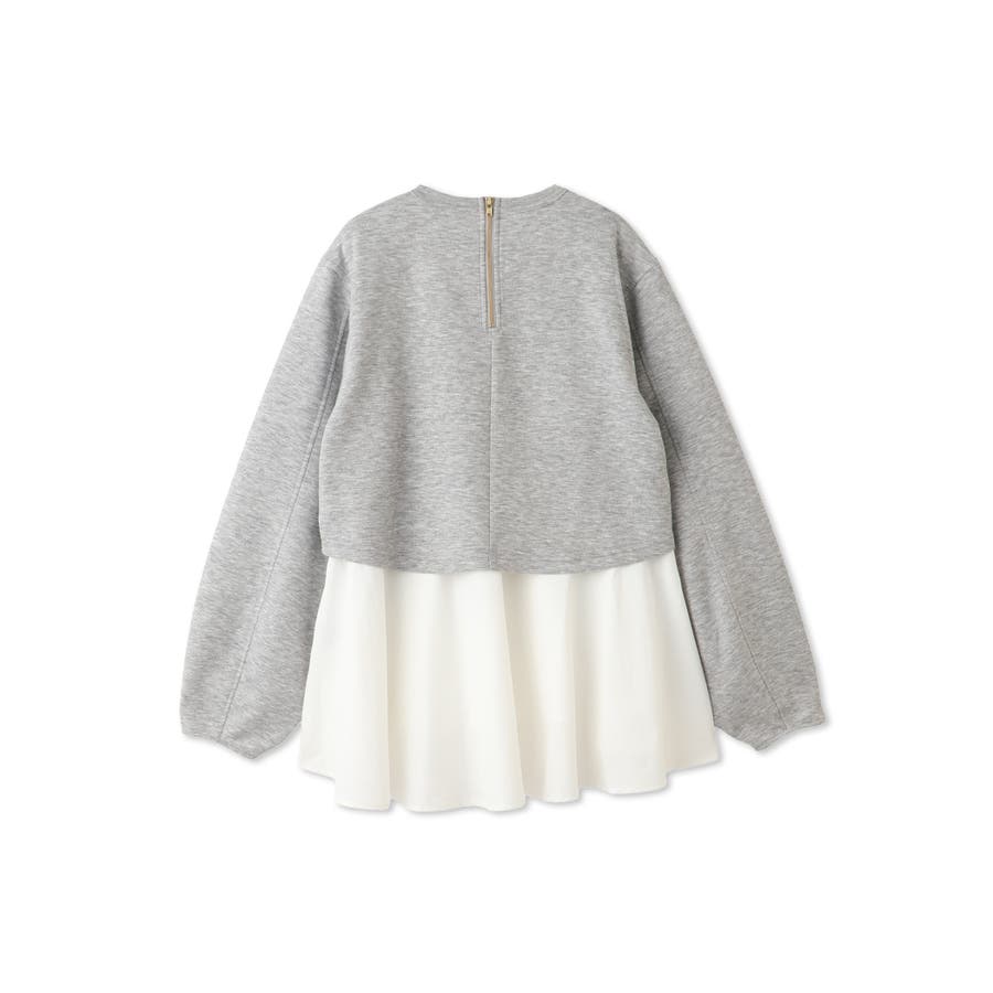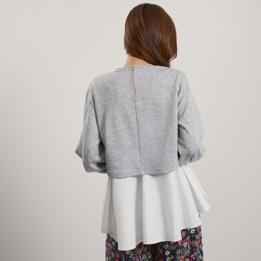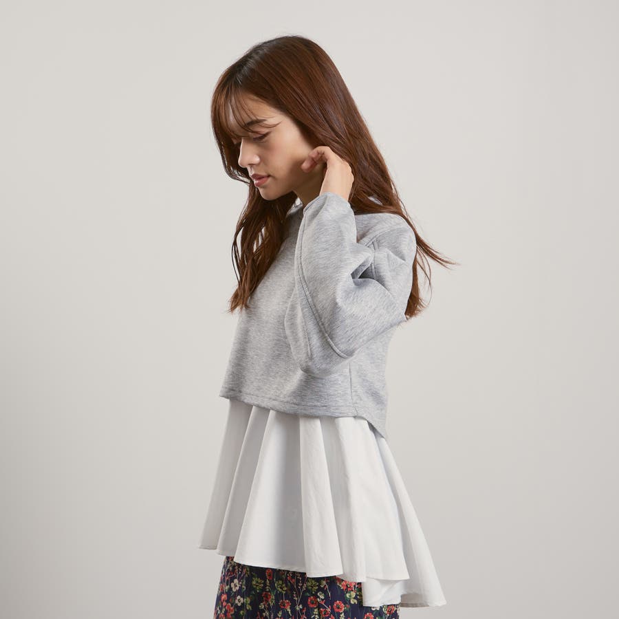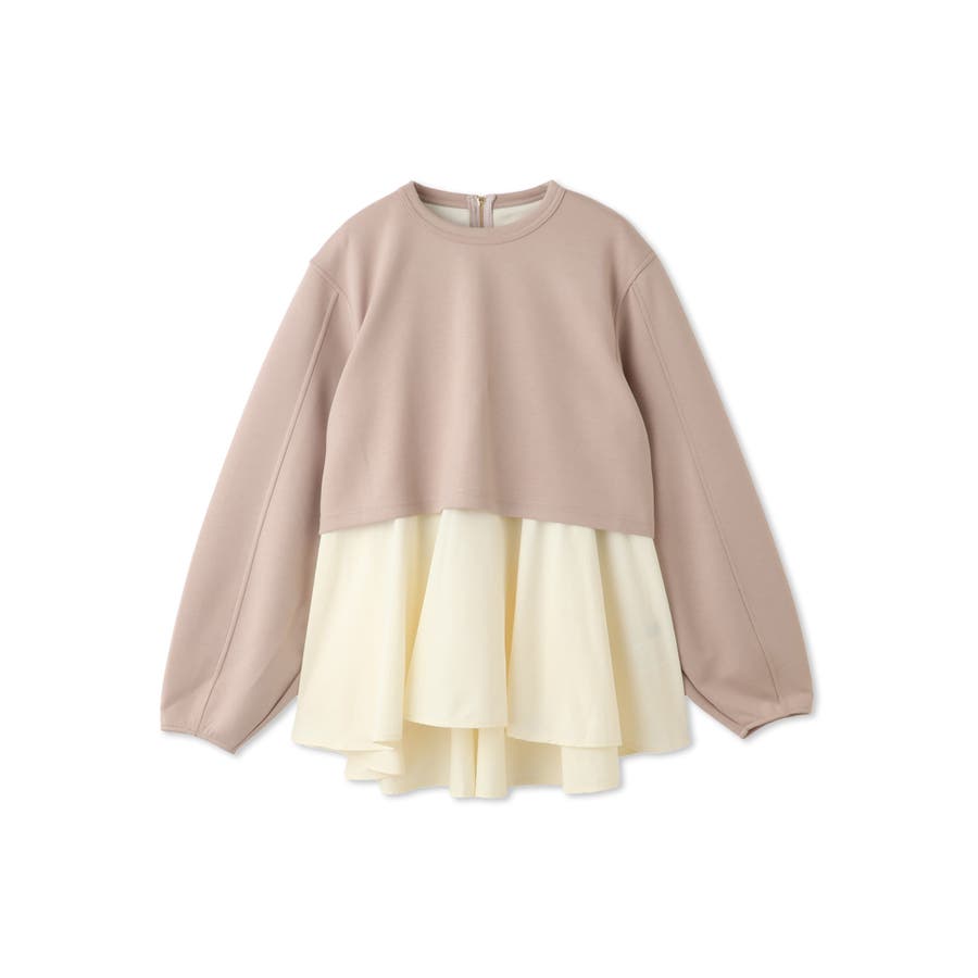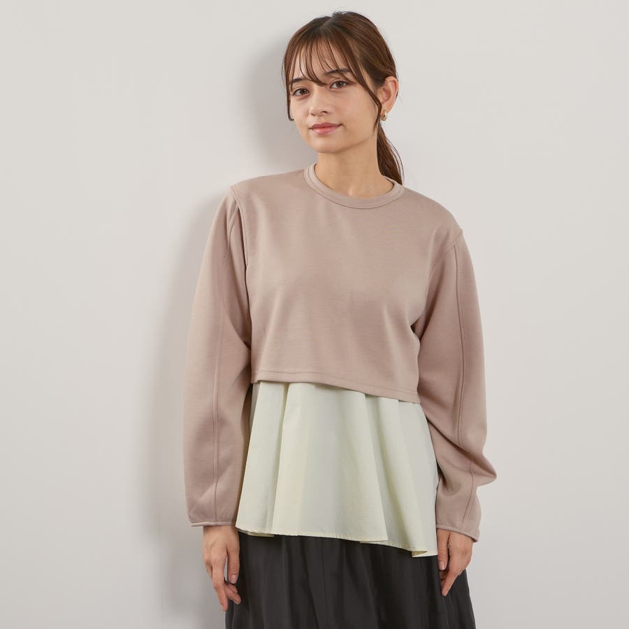 ダンボールニット素材のクロップドトップスにタフタ素材のブラウスをレイヤードしたような一枚で着合わせが完成するプルオーバーです。