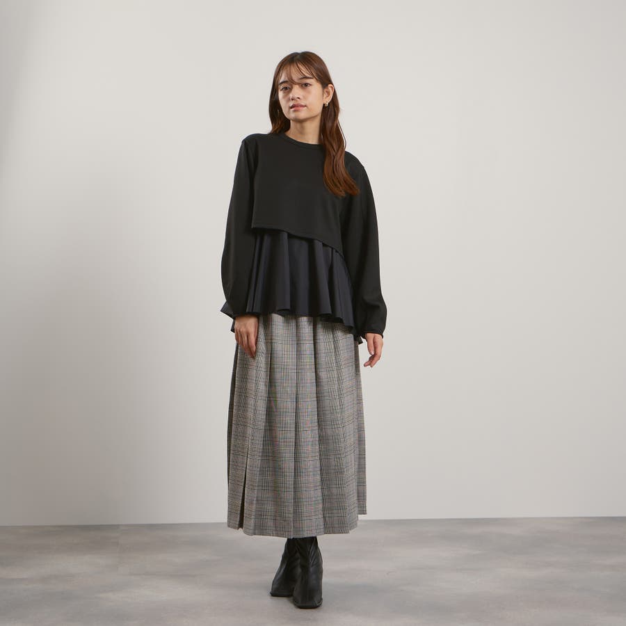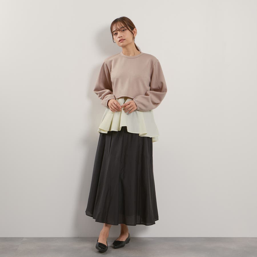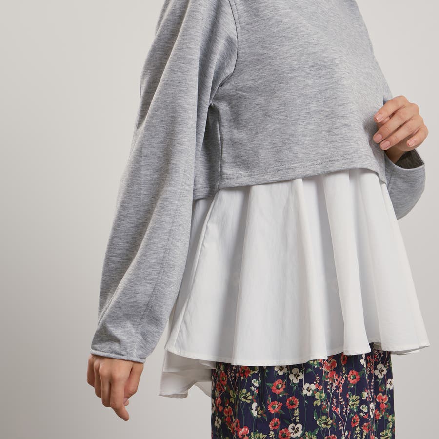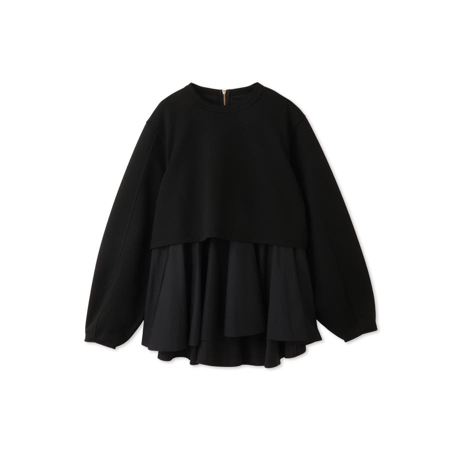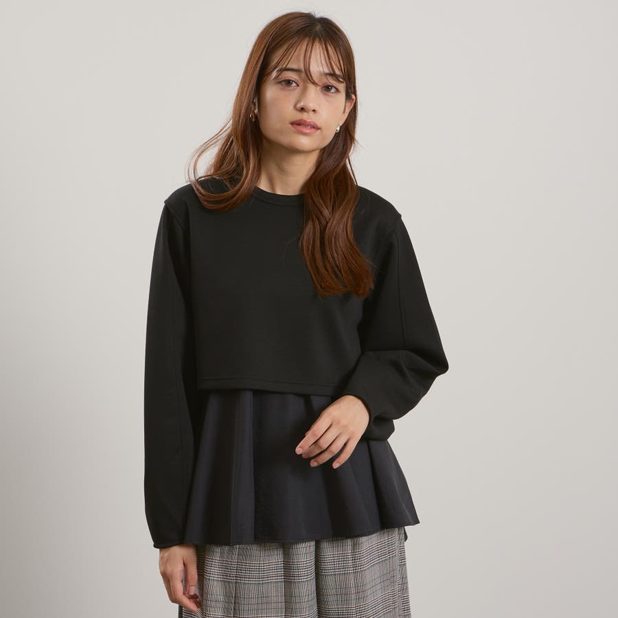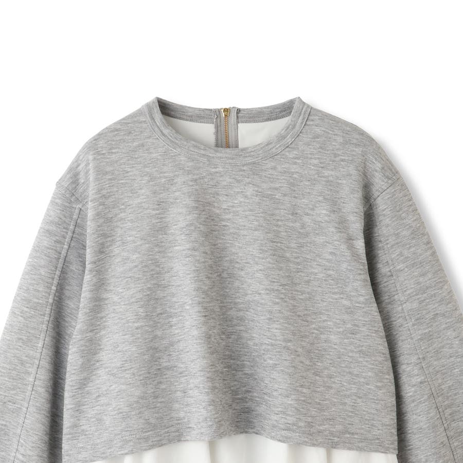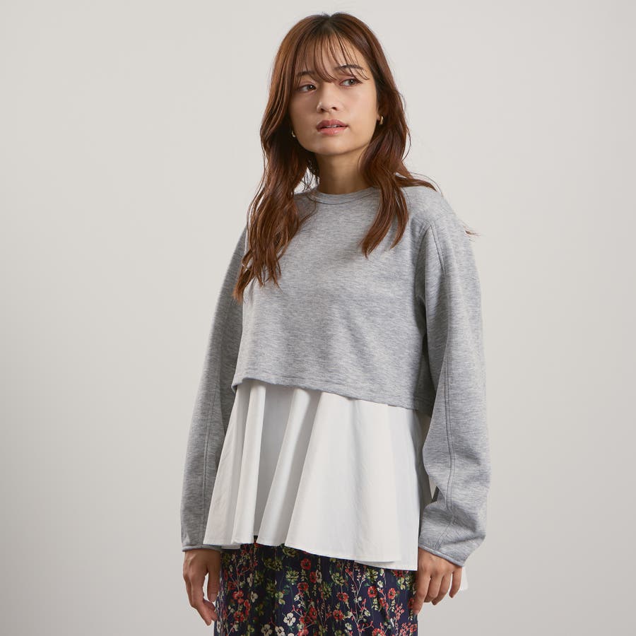 ダンボールニット素材のクロップドトップスにタフタ素材のブラウスをレイヤードしたような一枚で着合わせが完成するプルオーバーです。