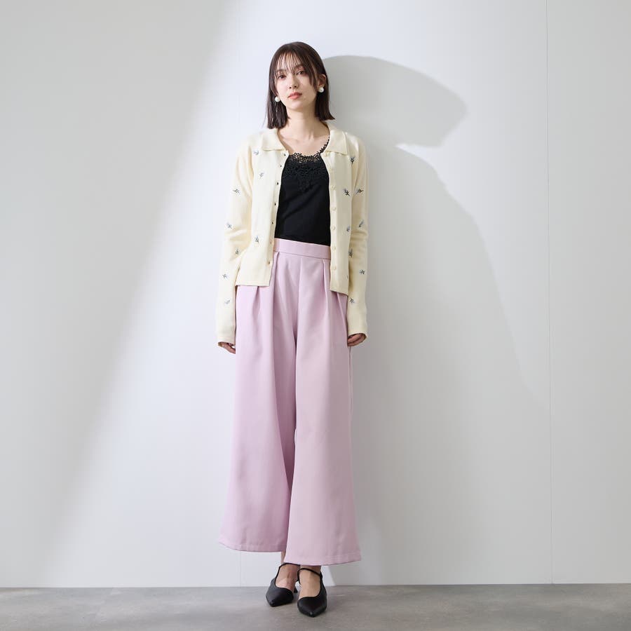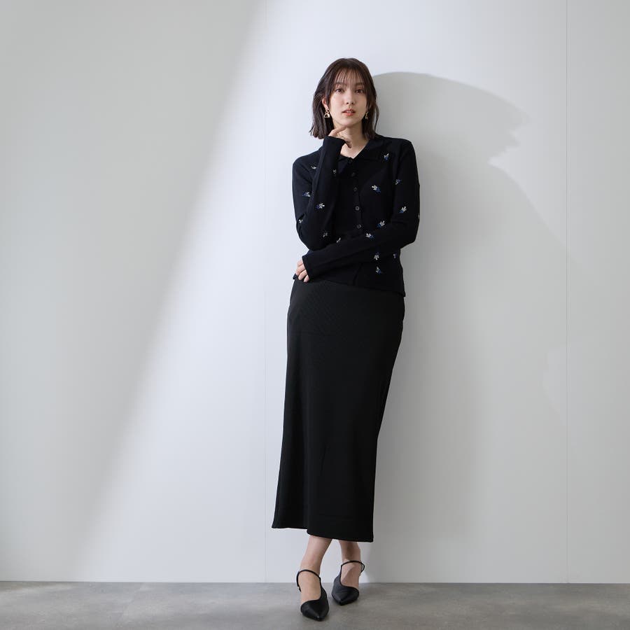 全面に小花柄の刺繍が施されて、グッドガール風の印象に。