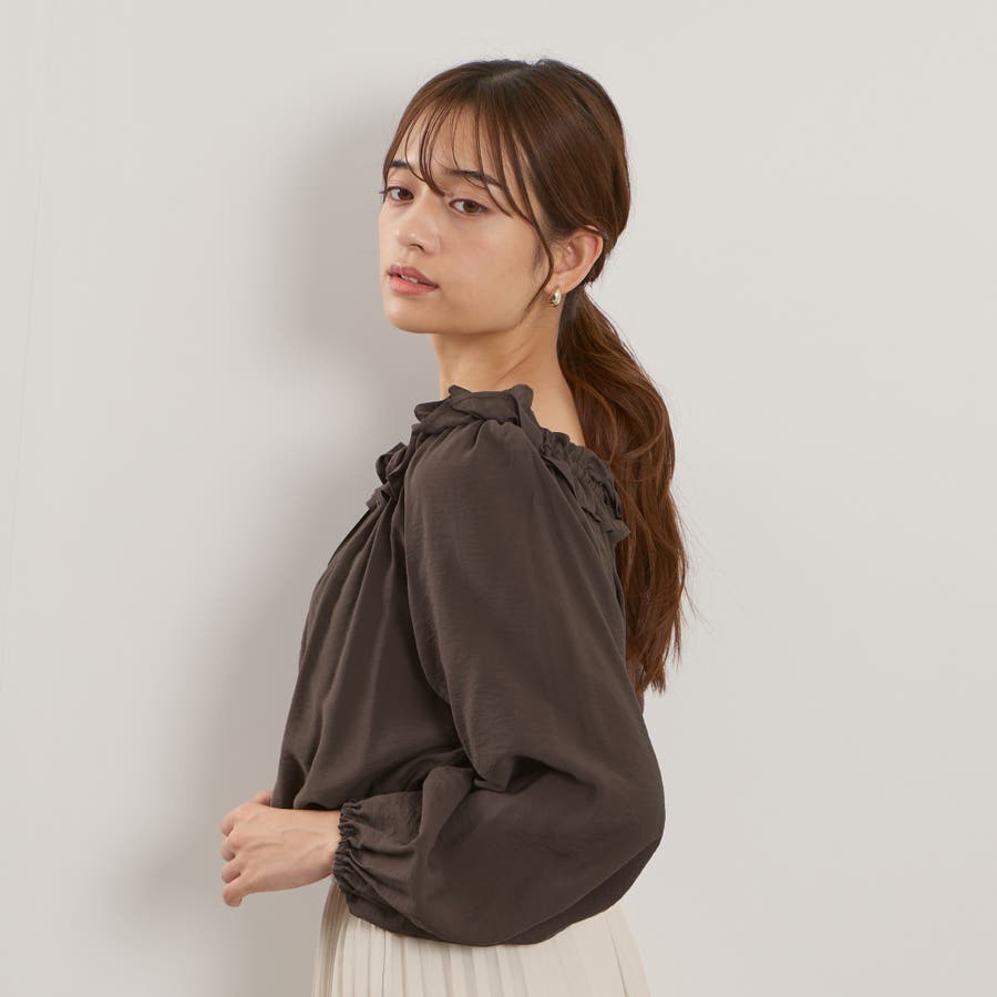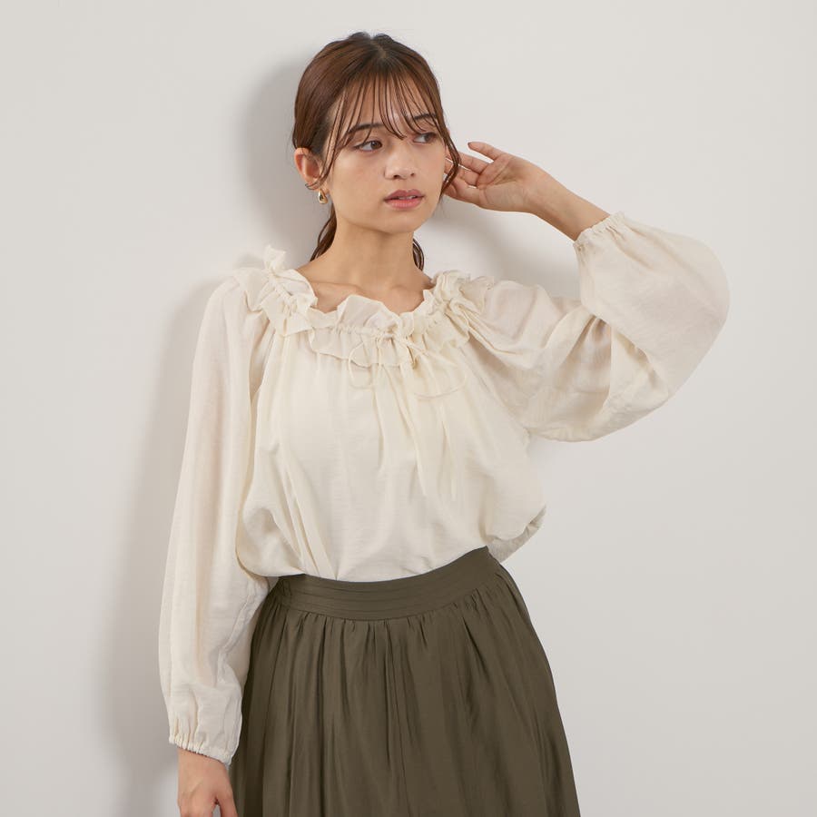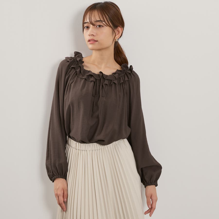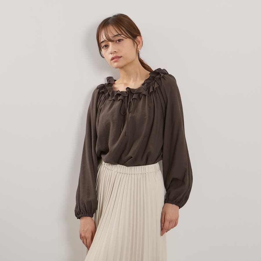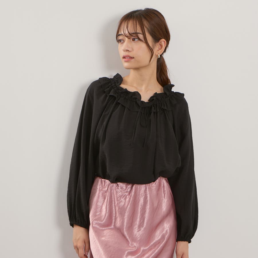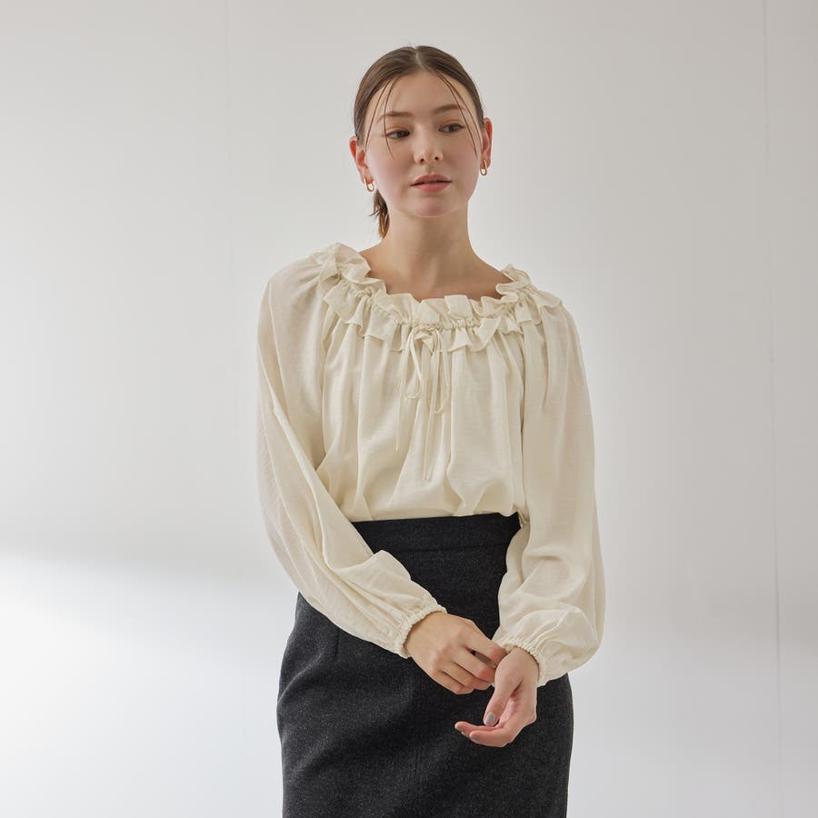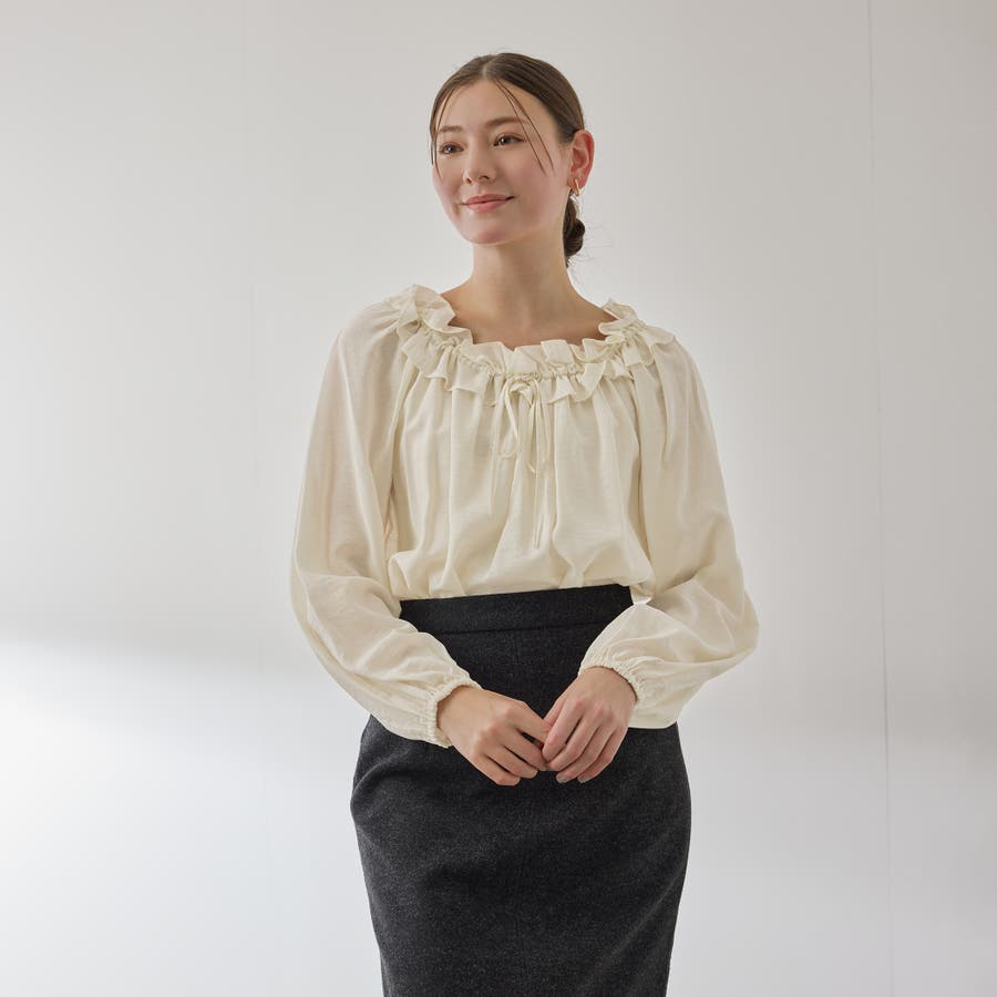 フリルの中央部分にナローリボンがついており、首元のニュアンスを変化させたご着用が可能になっています。