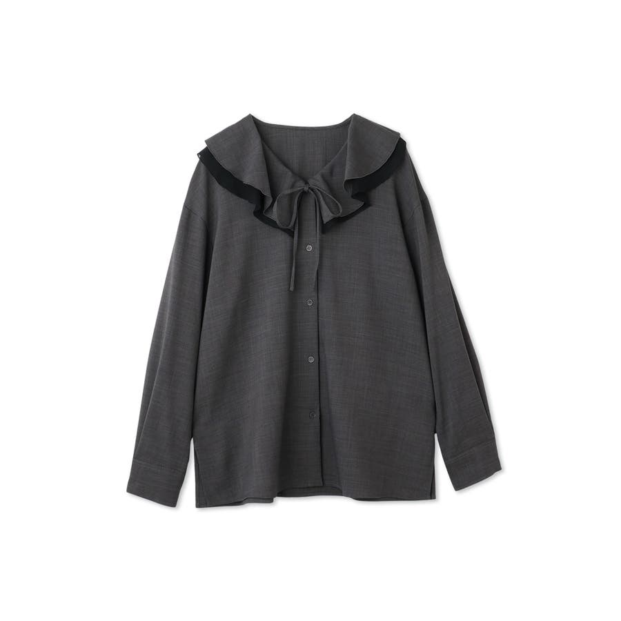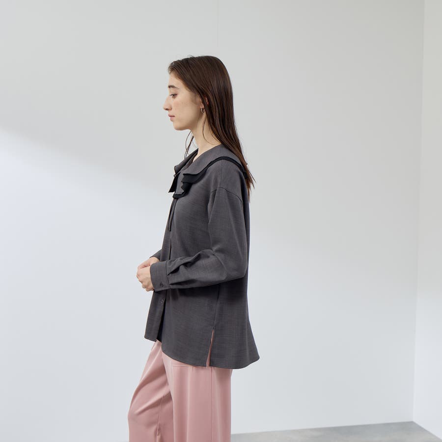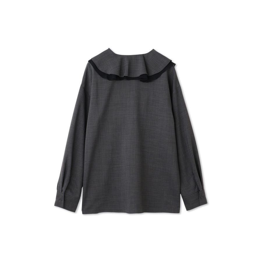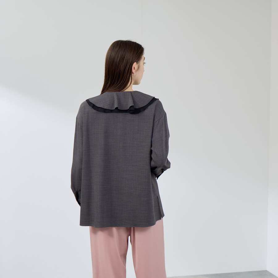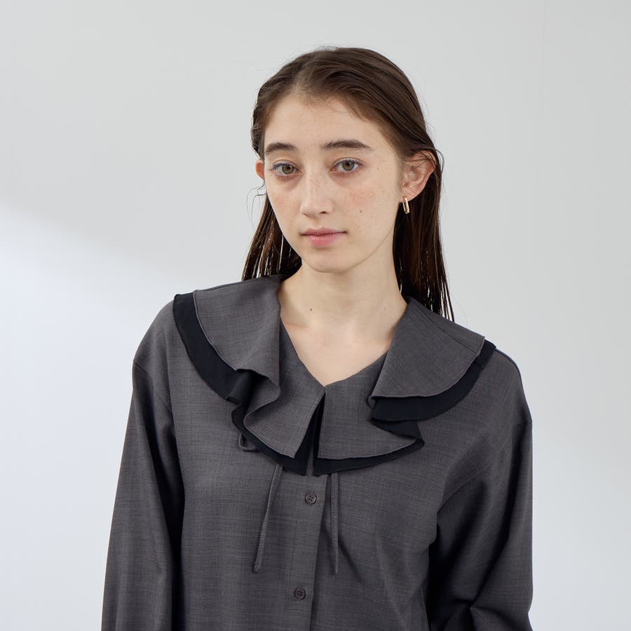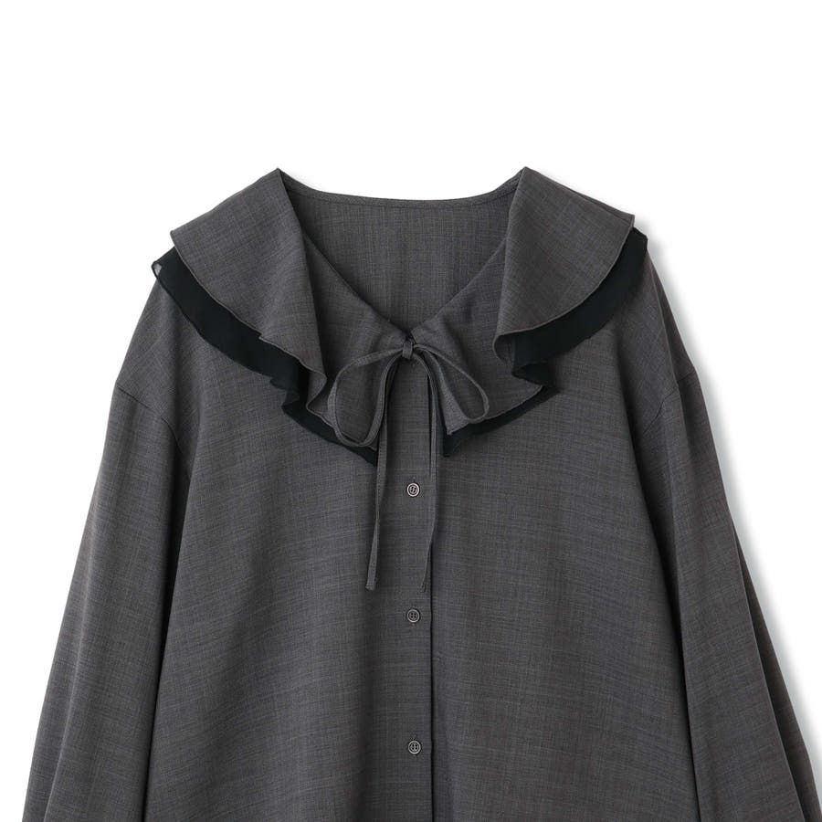 セーラーニュアンスの大きめのフレアカラーは透け感のあるシフォン素材とのレイヤーダブルカラーで大人エッセンスを加えて一層視線を集めるデザインに。