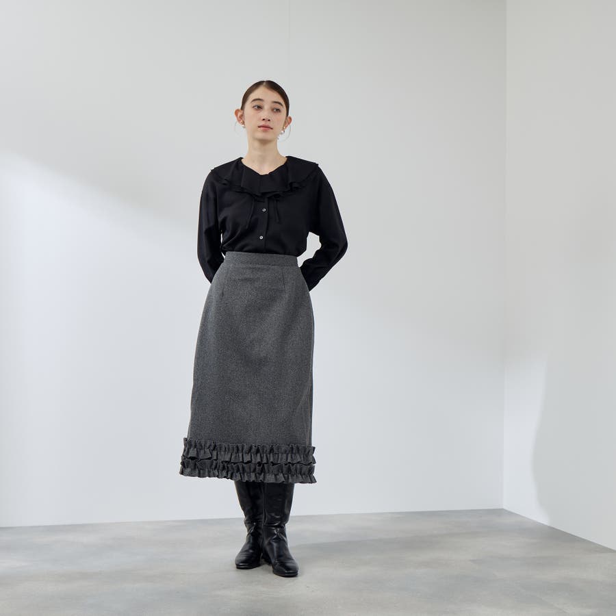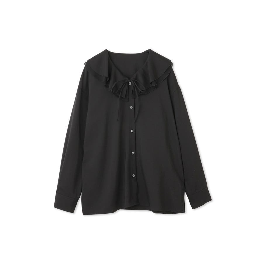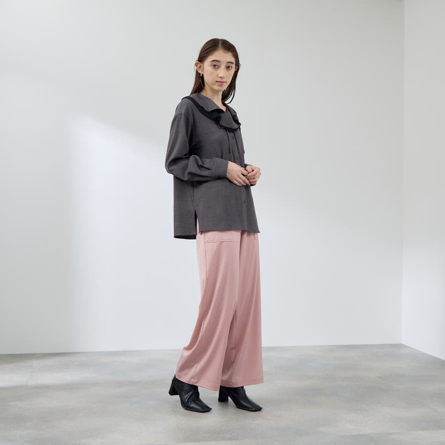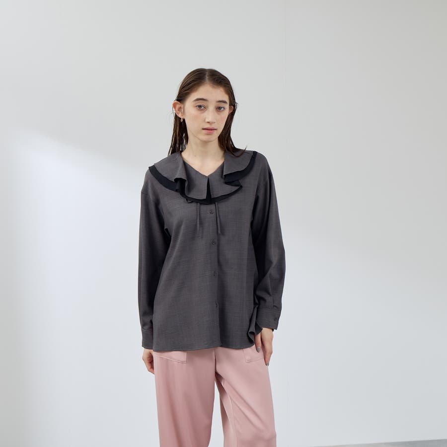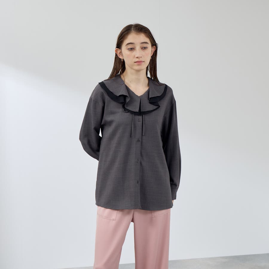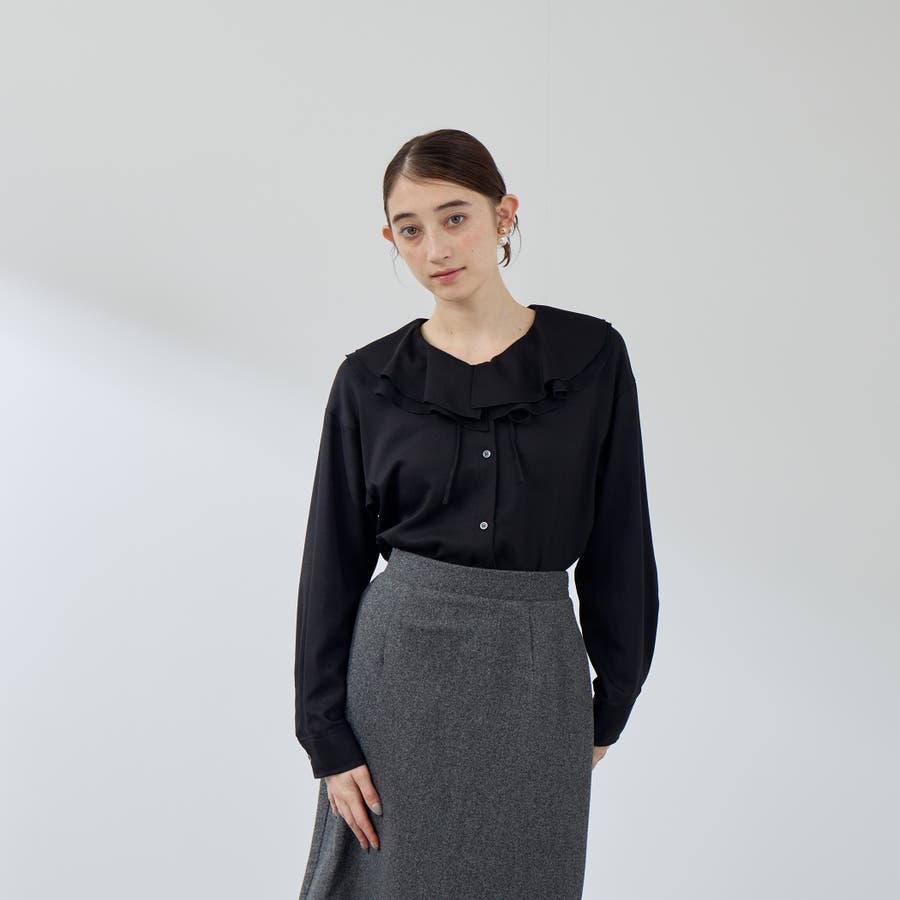 セーラーニュアンスの大きめのフレアカラーは透け感のあるシフォン素材とのレイヤーダブルカラーで大人エッセンスを加えて一層視線を集めるデザインに。