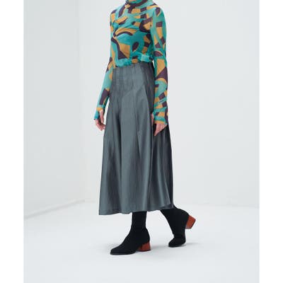 幅広のプリーツに、ヴィンテージライクな光沢感ある生地が印象的なスカート。
