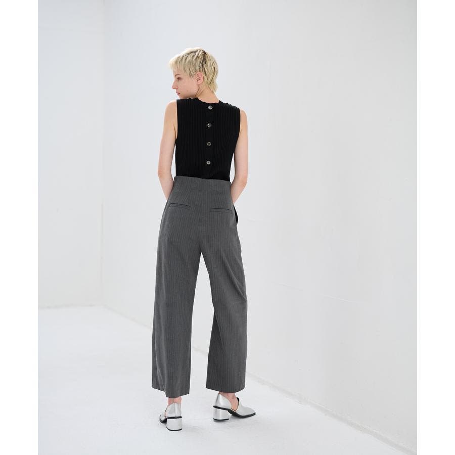 センタープレスできりっとさせたシルエットに、ダーツとサイドファスナー開きでウエスト周りもすっきりと。