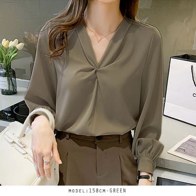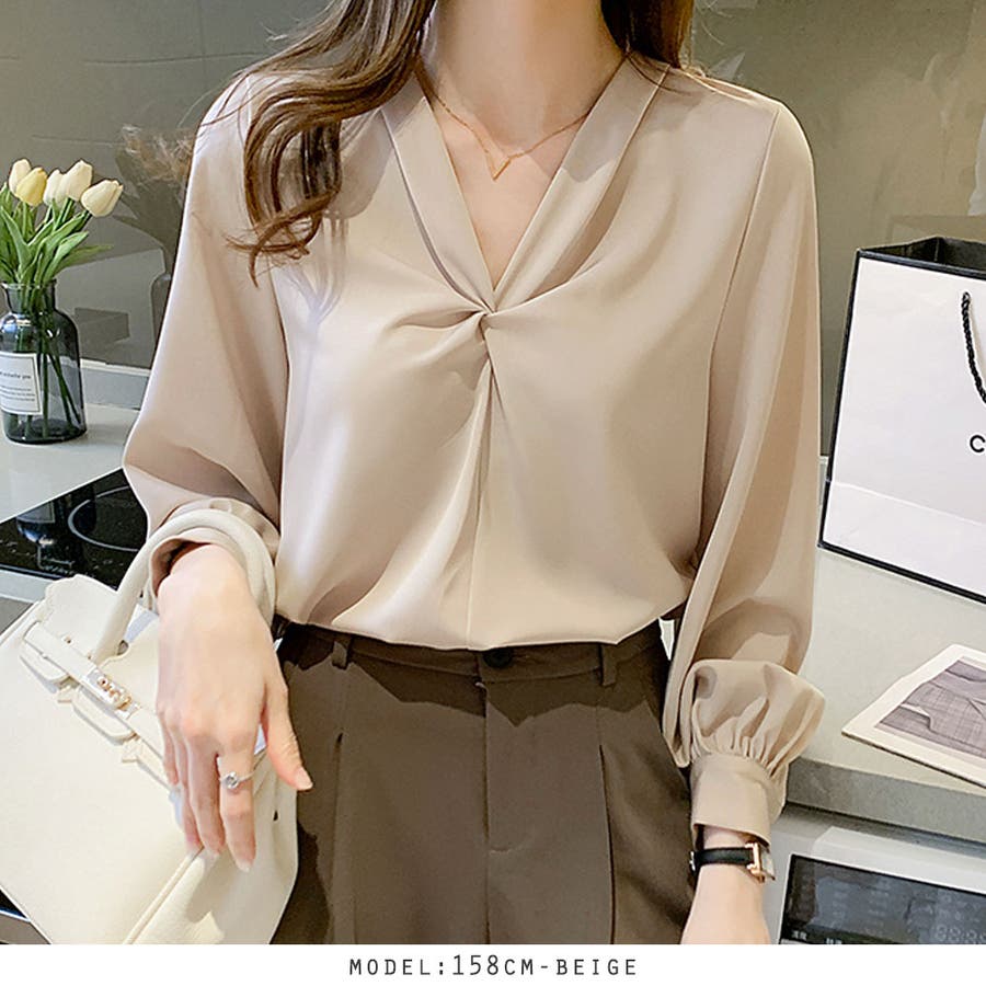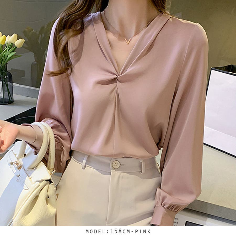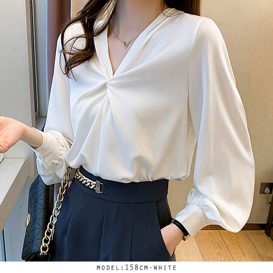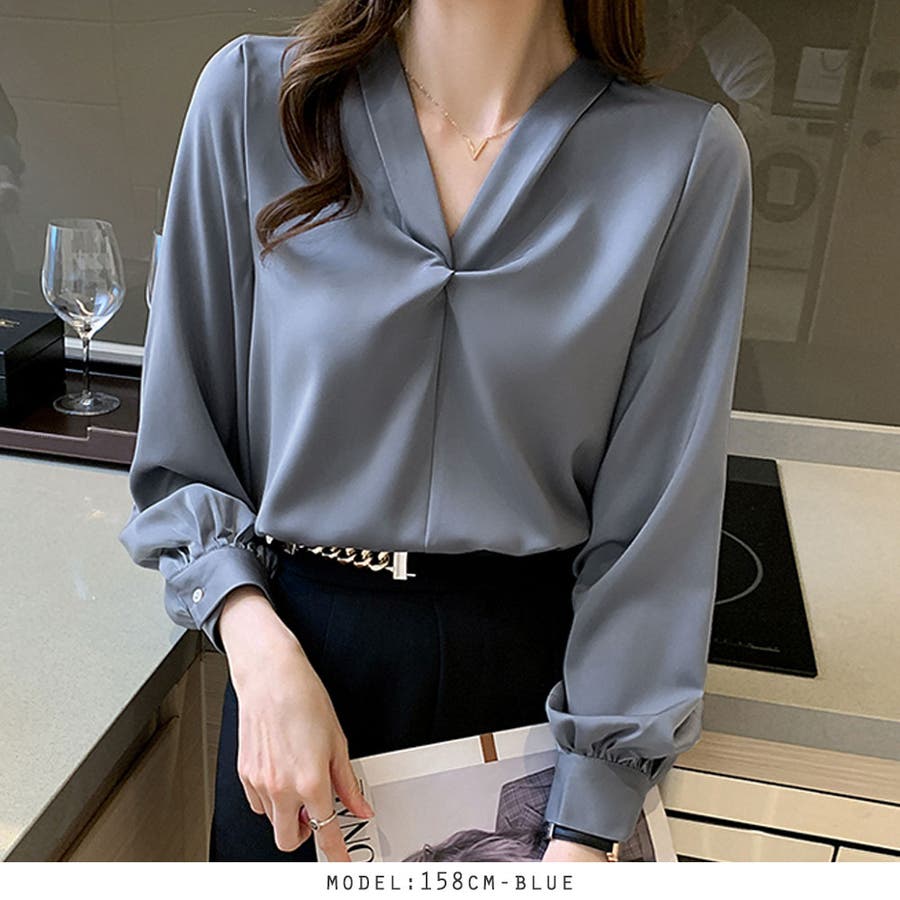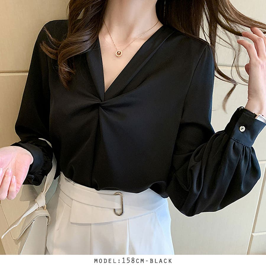 トップス シャツ ブラウス 長袖 バルーン Vネック タック サテン調 オフィスカジュアル フォーマル